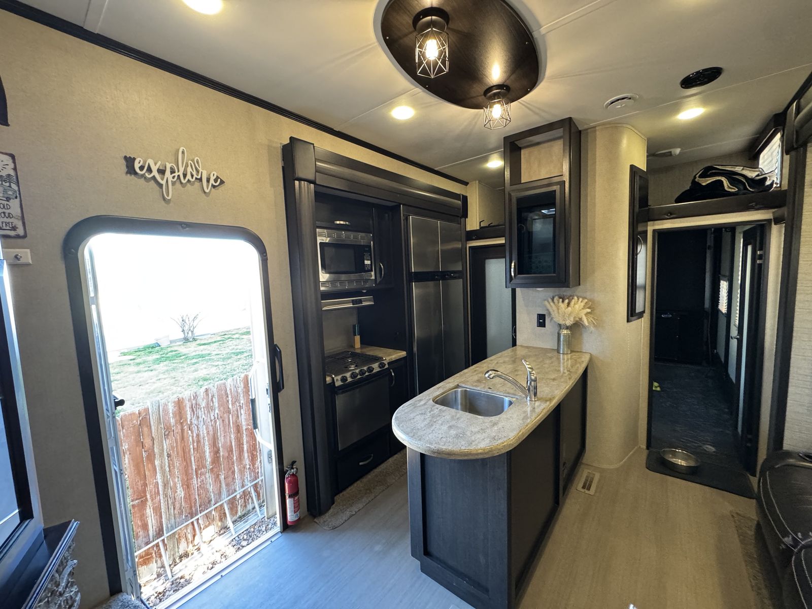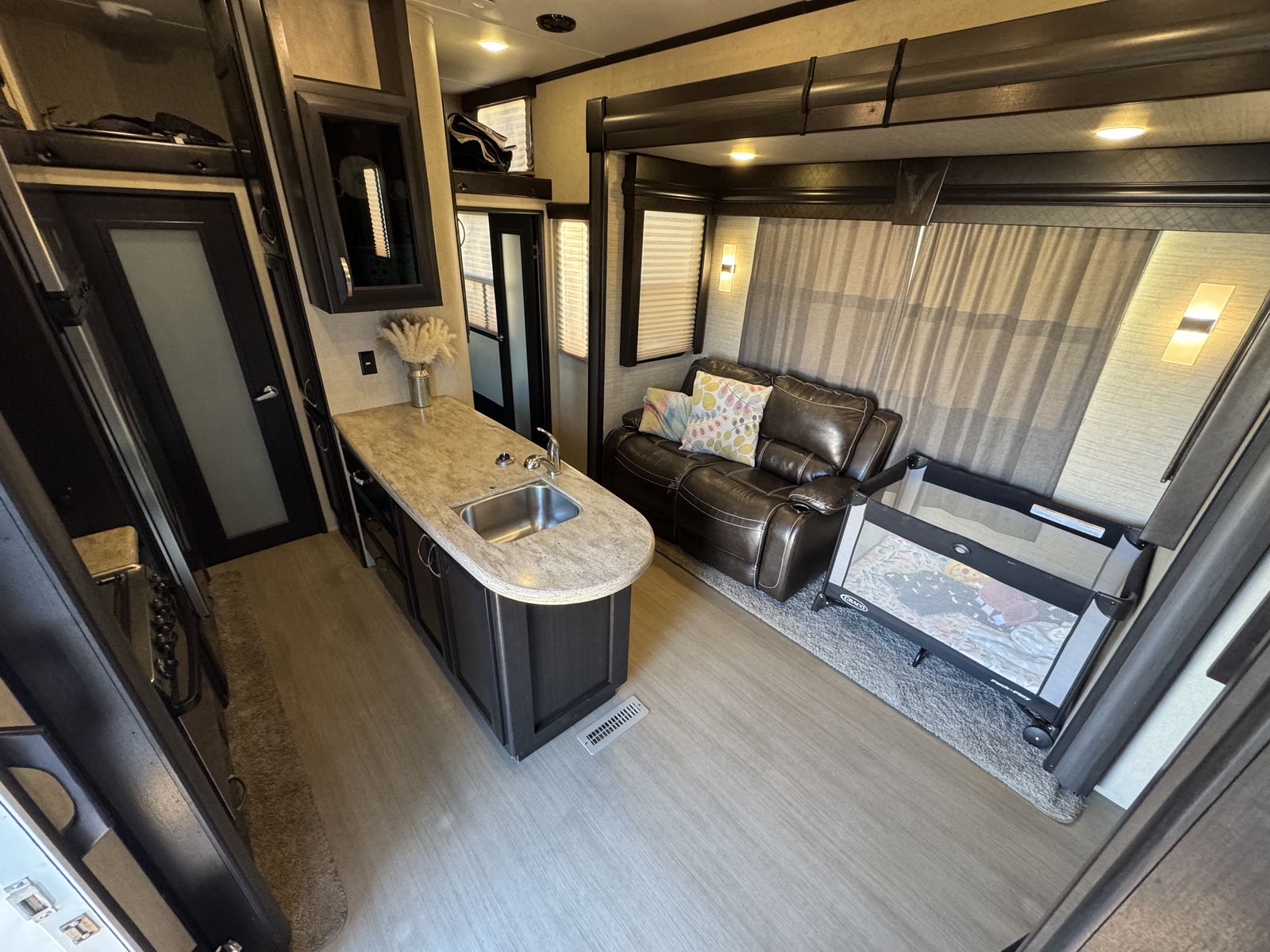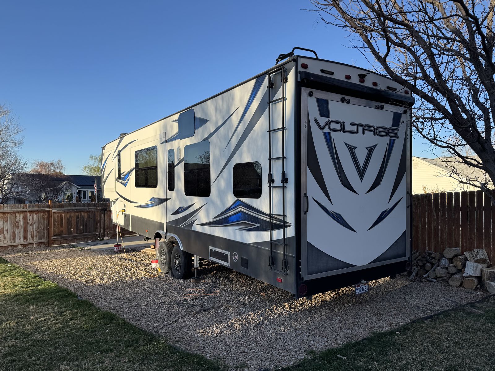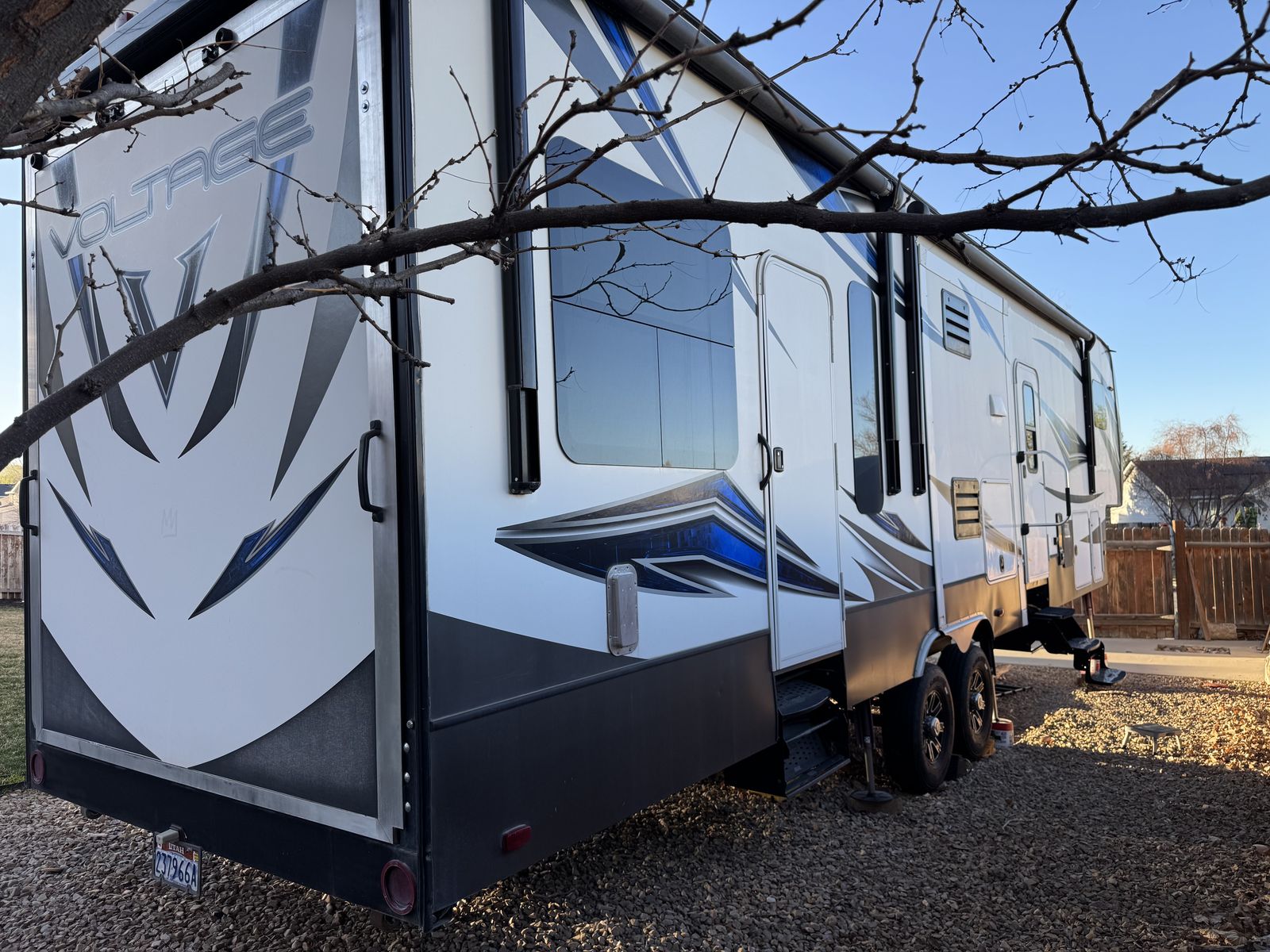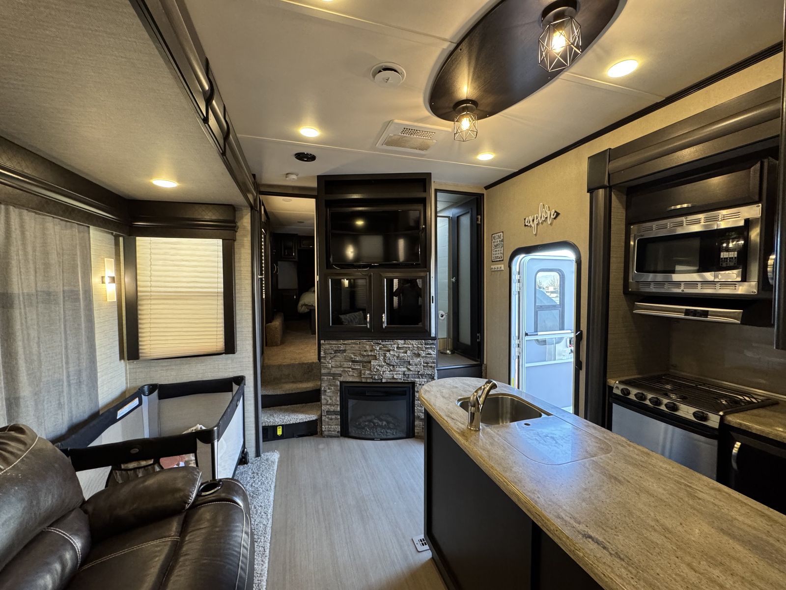 This trailer is in great shape and has been well taken care of. Washed after every trip and everything works on the trailer. It is the blue and gray edition that you don't see very often. All the slide motors work as they should, water pump is new, A/C's blow cold, fireplace blows nice and hot and the furnace works great. We have owned this trailer for 4 years and it's been great for us. We shortened the couch so we could put the baby bassinet there. You could use the extra space for whatever really. Tires are probably half warn and they are the Sailun 14ply tires. The garage is 12.5 and fits my RZR turbo S on 35's. 100 gallon fresh water and 10 gallon water heater. The Sides still have a sheen on them and the front cap isnt sun damaged at all. Im sure I'm forgetting something. Text or message me with any questions.