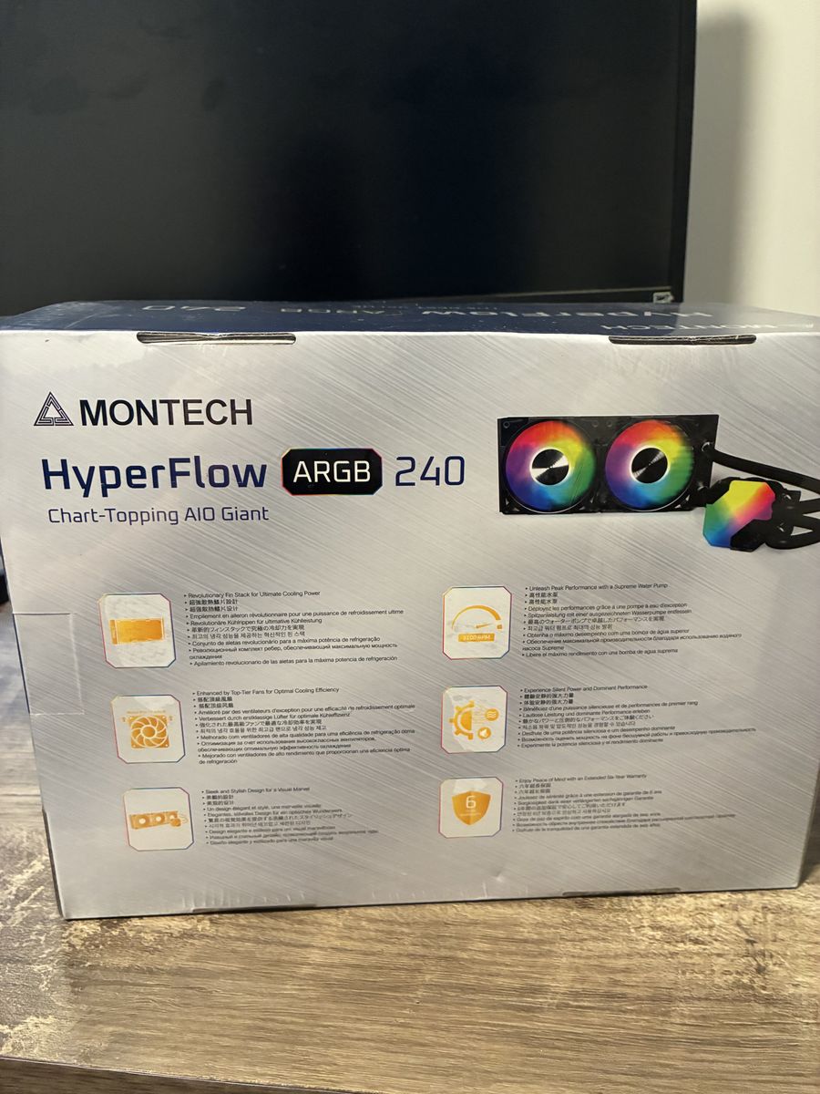VenmoSelling a brand new, never used Montech HyperFlow ARGB 240 All-in-One Liquid CPU Cooler. This is a high-performance cooler known for its chart-topping thermal efficiency and sleek aesthetics. Perfect for keeping high-end CPUs cool while adding great lighting to your build. Key Features: • Size: 240mm radiator (comes with two high-performance ARGB fans). • Lighting: Full ARGB support—compatible with ASUS Aura Sync, Gigabyte RGB Fusion, MSI Mystic Light, and ASRock Polychrome. • Condition: Brand new in box (NIB). • Warranty: Comes with an extended 6-year manufacturer warranty (as noted on the box). • Compatibility: Supports most modern Intel and AMD sockets.