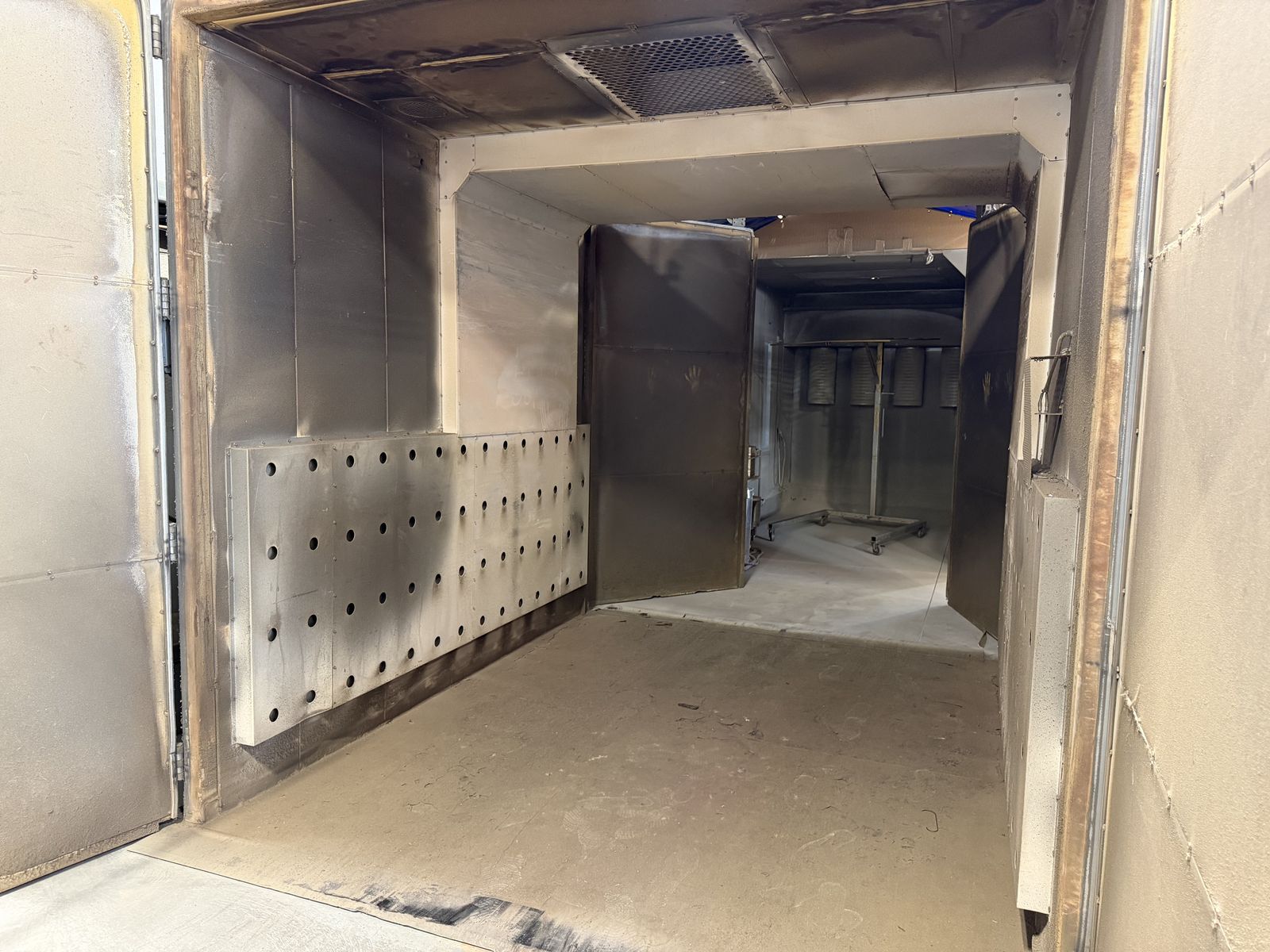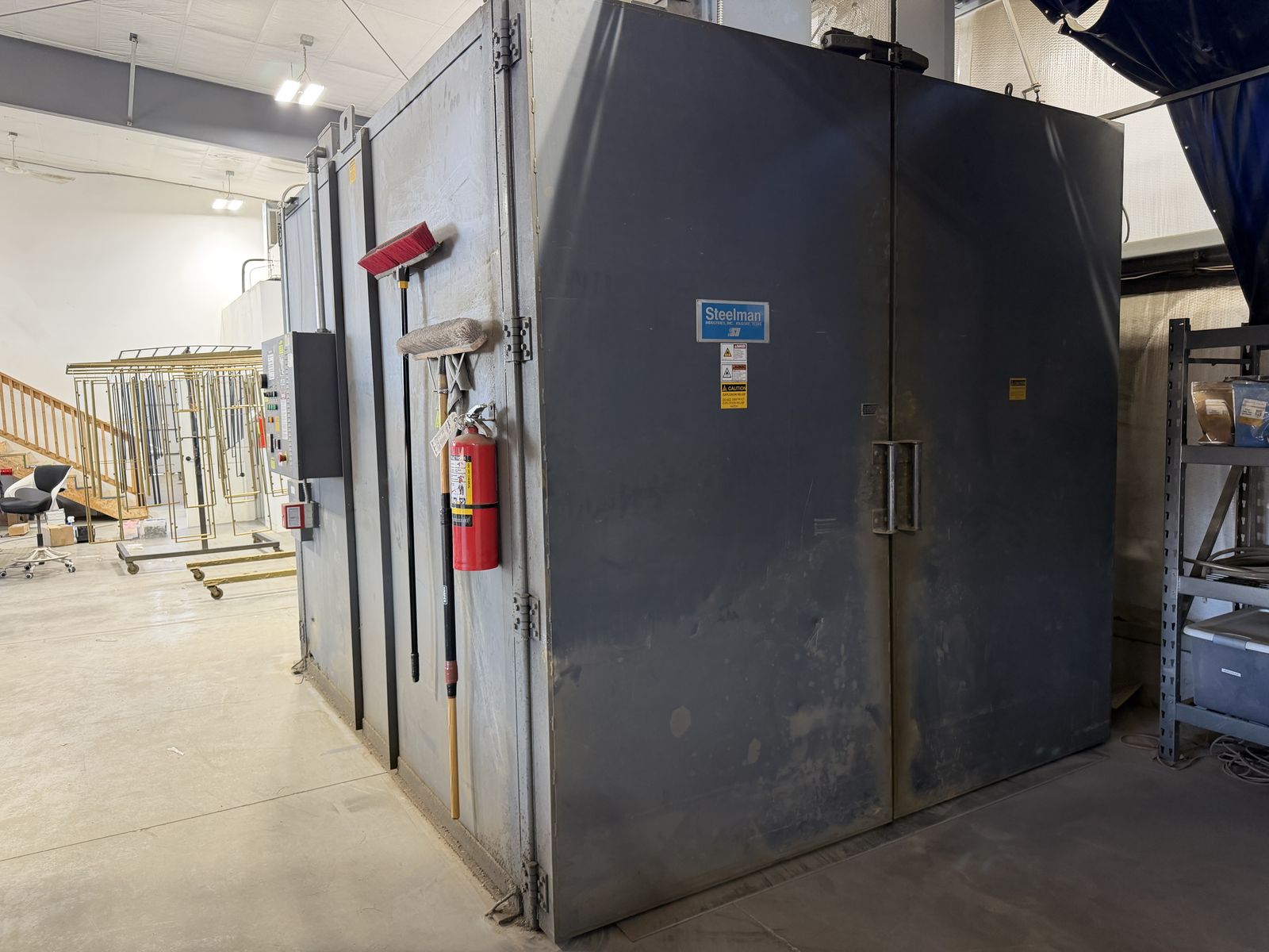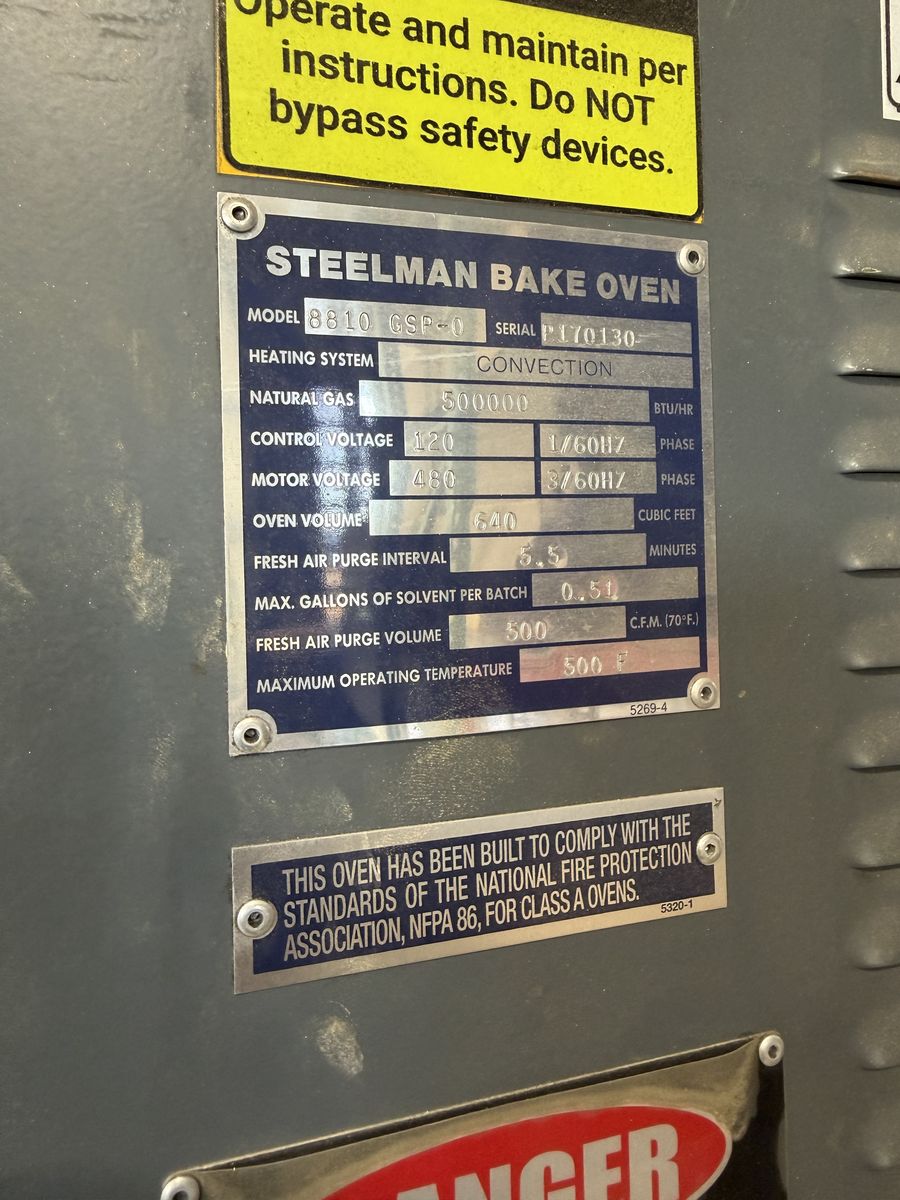 This is a Steelman Oven with passthrough doors. The interior size is a little over 8'x8' by 10' deep and heats to over 400 degrees in less than 10 minutes. Steelman is, in my opinion, the best made oven on the market. They are built in Texas and the couple of times we had a small issue, their customer service was amazing. We no longer need this one because we bought another of the exact same oven just longer. This oven is over 100k new. We got it 3 years ago and it has been amazing. It should last someone a long time.