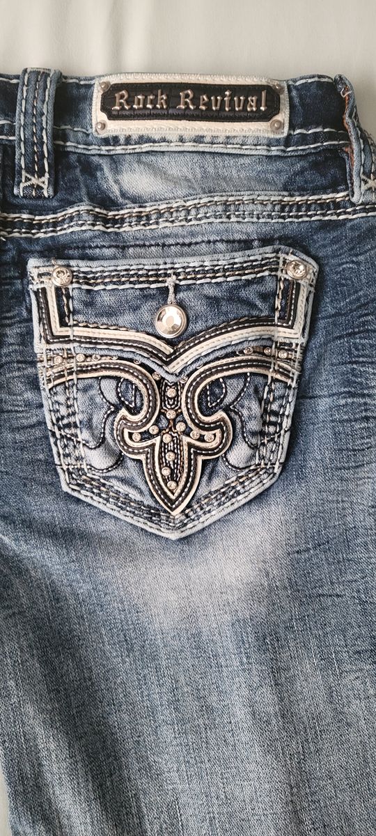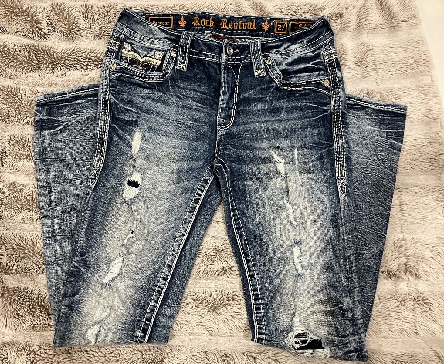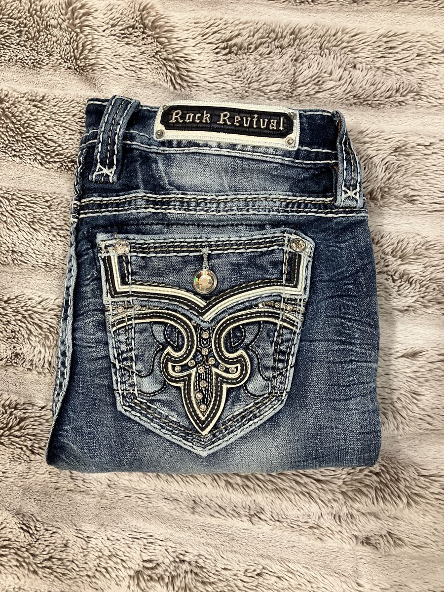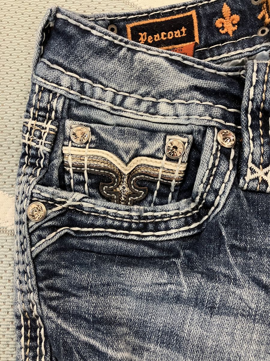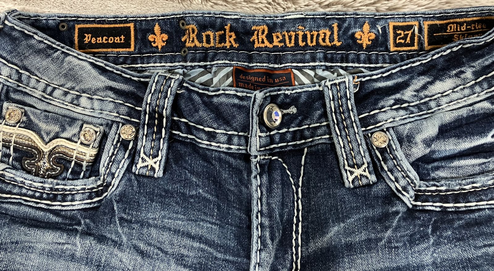 Rock Revival Peacoat mid-rise skinny stretch Jean. Size 26x31, a 26" waist and 31" inseam. Color is in Peacoat MS203. They're a mid-rise, skinny stretch Jean. Slim through the hip and thigh, with zipfly. Rhinestones on metallic embroidered faux flap back pockets. Hand whiskering and sanding details. They're in perfect condition. (Cash Only)