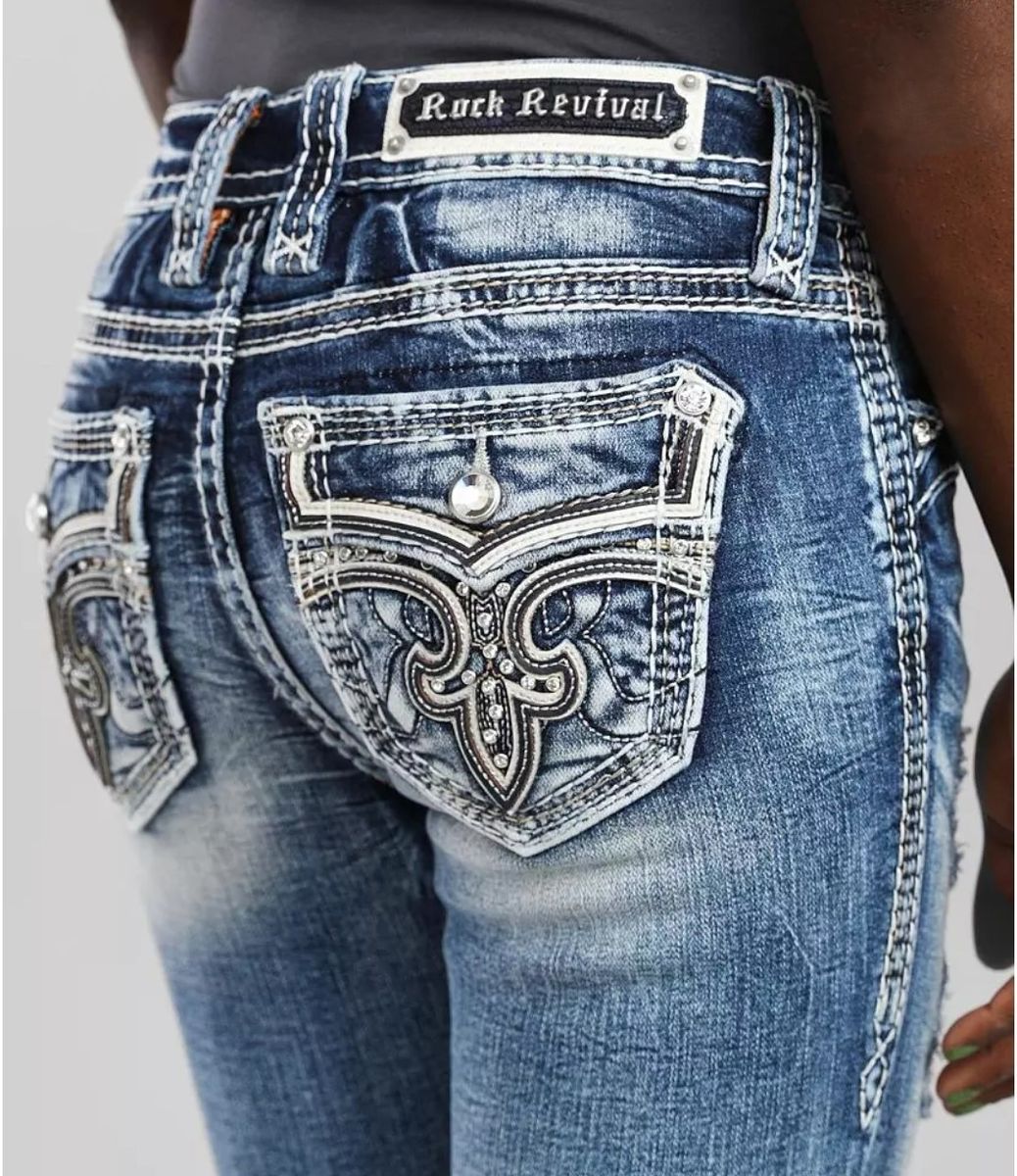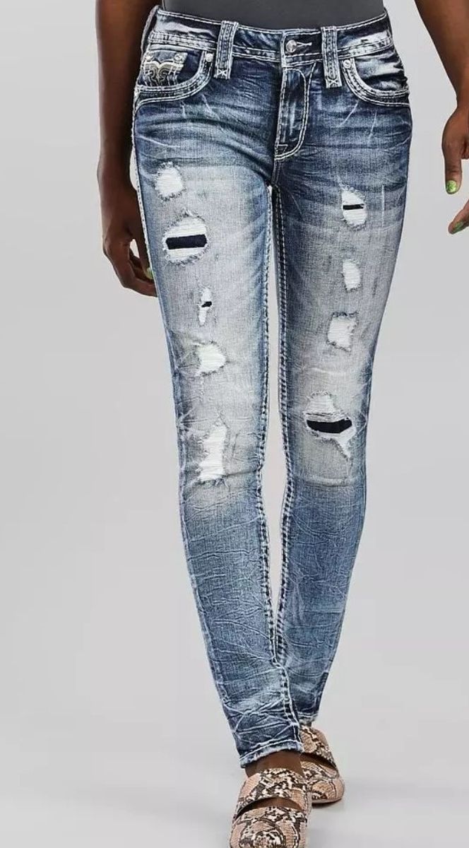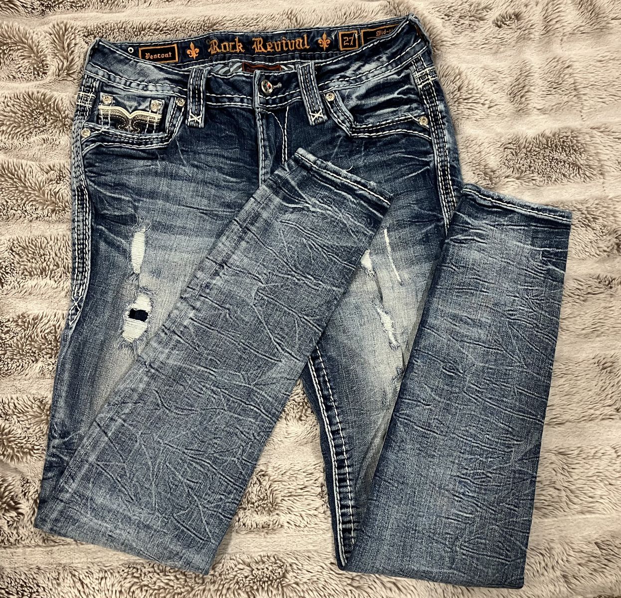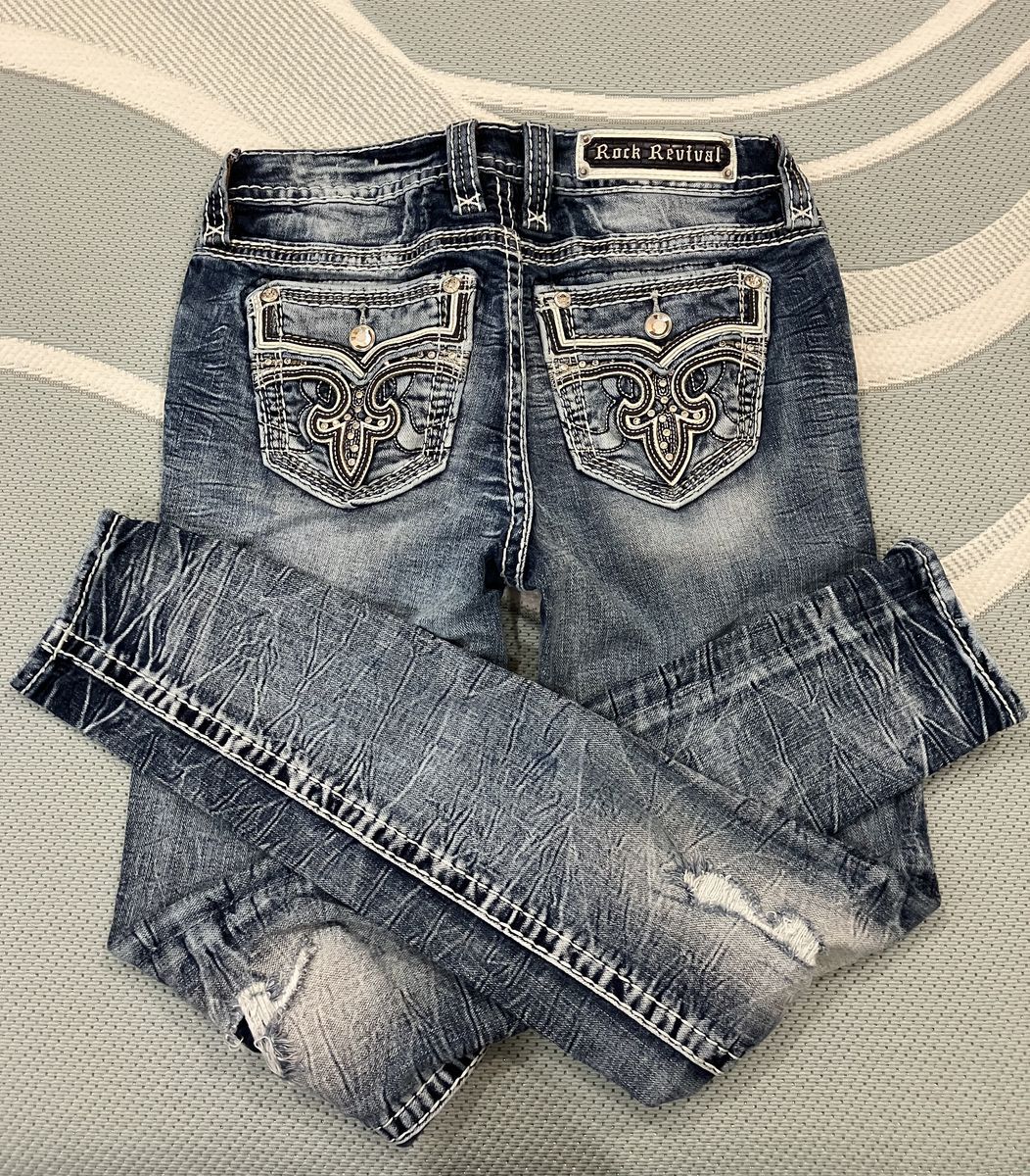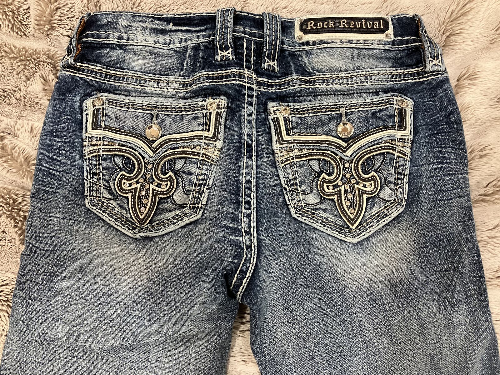 Rock Revival Peacoat mid-rise skinny stretch Jean. Size 26x31, a 26" waist and 31" inseam. Color is in Peacoat MS203. They're a mid-rise, skinny stretch Jean. Slim through the hip and thigh, with zipfly. Rhinestones on metallic embroidered faux flap back pockets. Hand whiskering and sanding details. They're in perfect condition. (Cash Only)