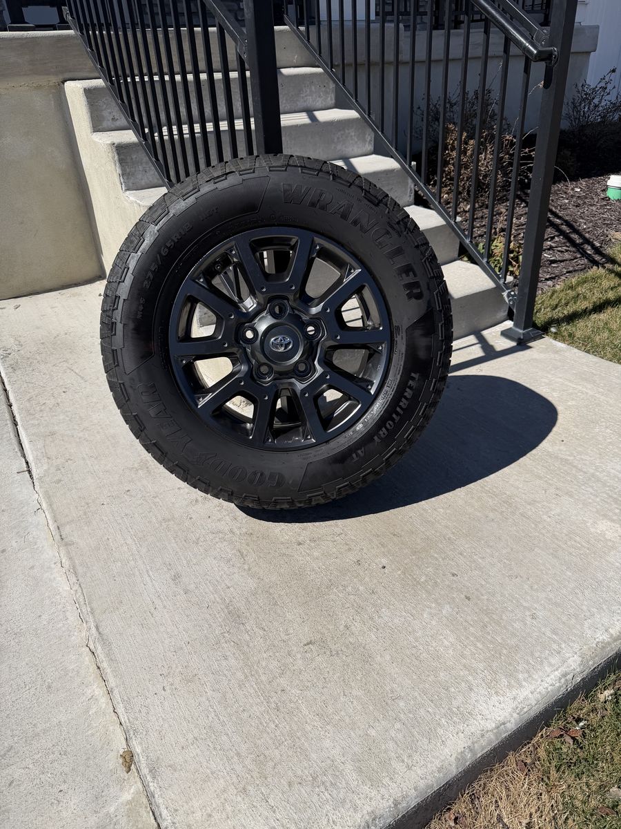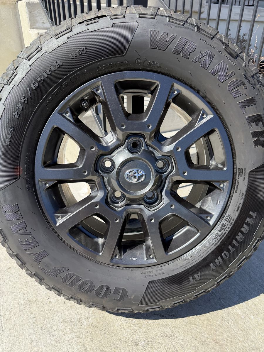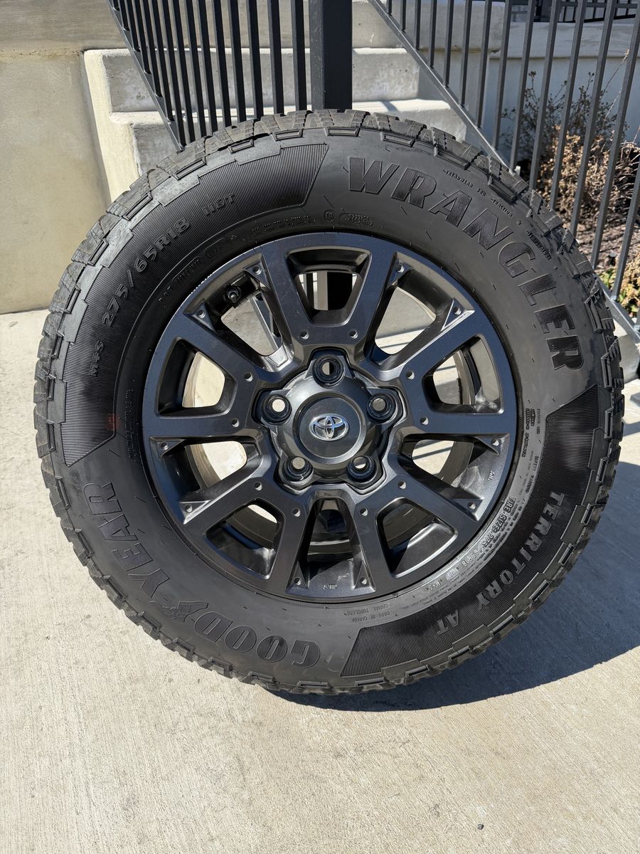ApplePaySet of 4-Toyota Tundra Sequoia Rims and Tires 275/65R18 Goodyear Wrangler Territory AT Like new only 1000 miles on them in excellent condition,asking $1700 obo I can sell the rims or tires separately Bolt pattern 5-150 Comes with sensors They will fit Toyota tundra sequoia Land Cruiser Lexus Text anytime 385-402-2292