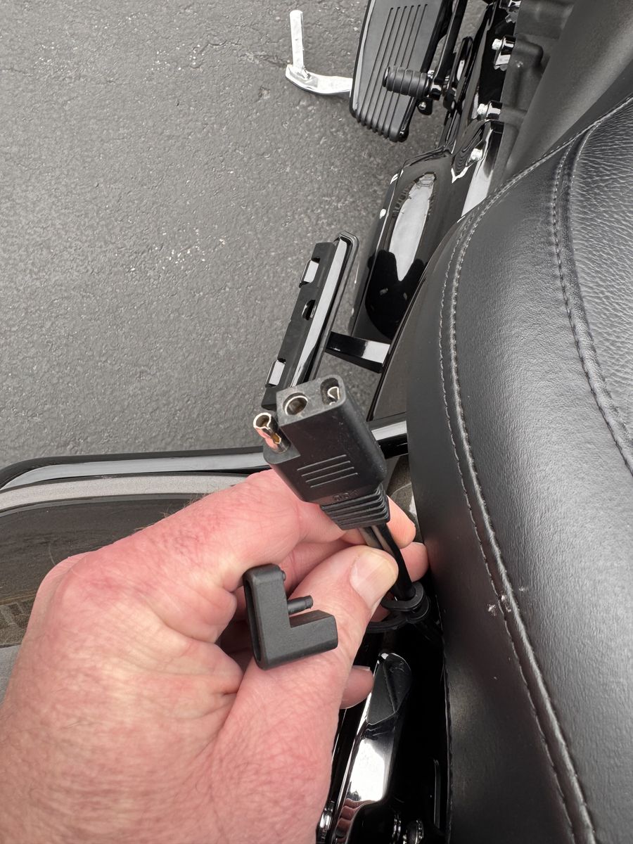 Integrated battery tender + plug-in for heated riding gear