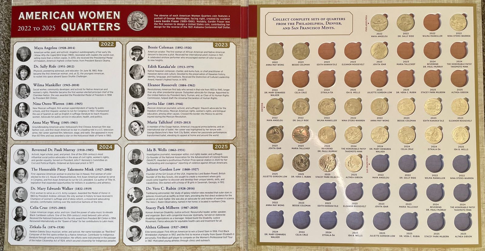 VenmoSet of 20 Notable American Women Quarters 2022-2025. Five coins per year, sold as a full set. The coins are very good but in circulated condition. The series comes in P-mint mark as well as S-mint mark which makes collecting them all very challenging. The book pictured is one I am working on with my grandson. A Womens series book is included with the D-mint set. Additional sets may be available upon request.