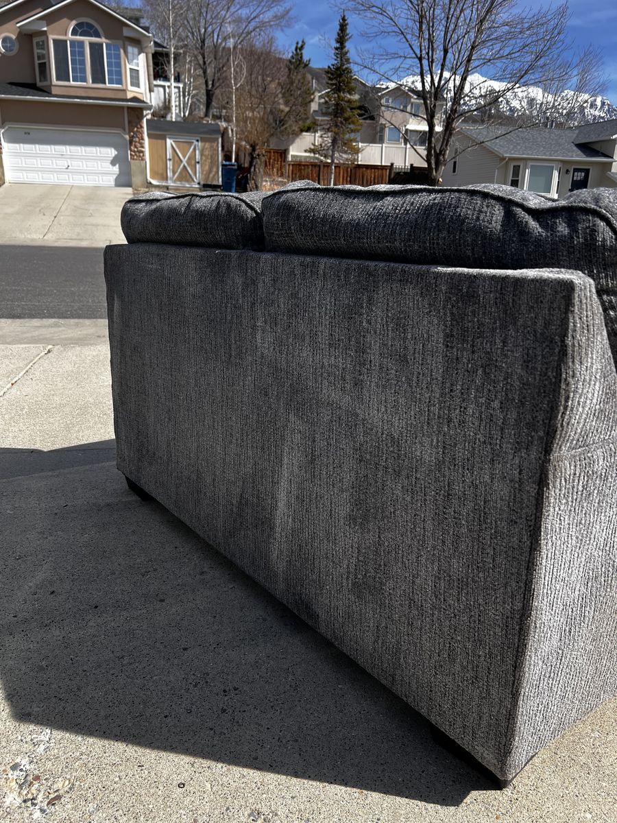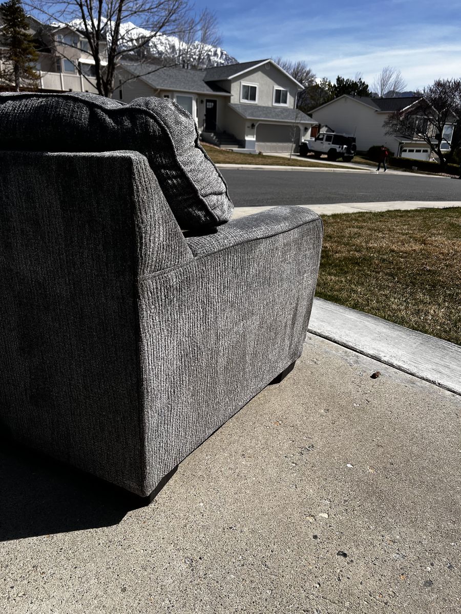 No major damage and overall looks really good. Cushions are thick and comfy, and the neutral gray color goes with just about anything.