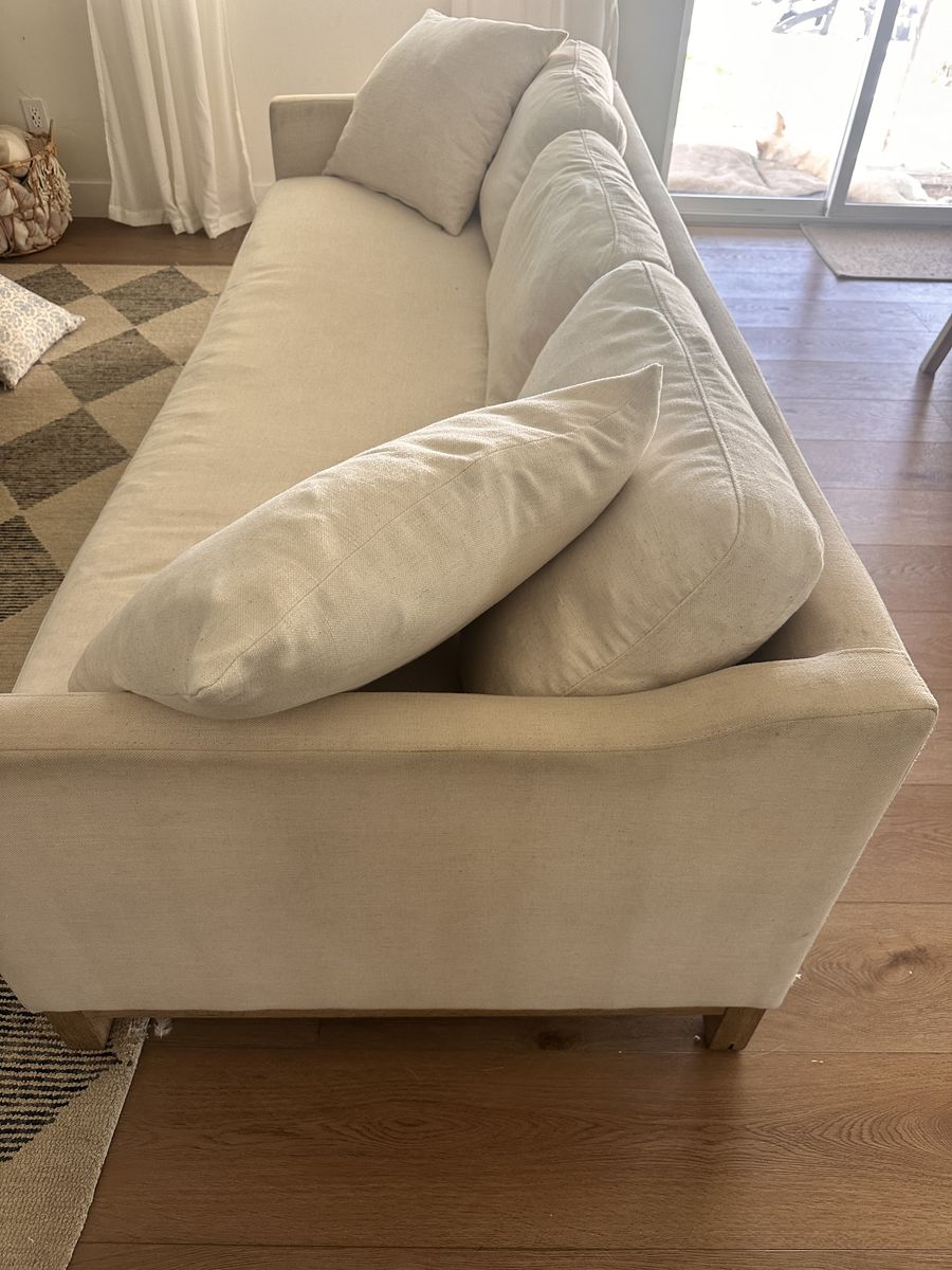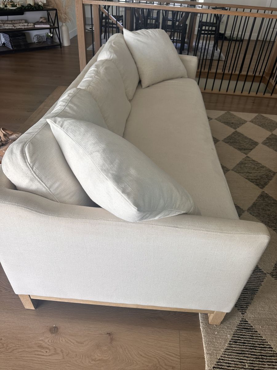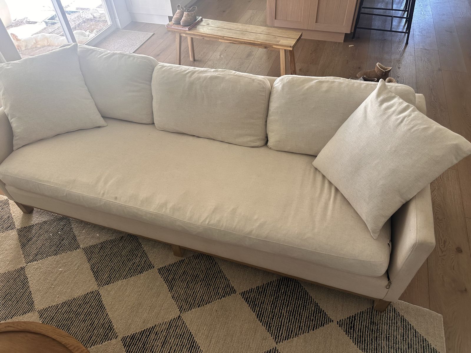 We are upgrading to a larger couch as our family no longer fits together on this couch. Cushions are nice feather down inserts and covers are removable & washable. Nonsmoking home. Some wear over time around the frame but can be cleaned professionally as we have done before but not recently.
