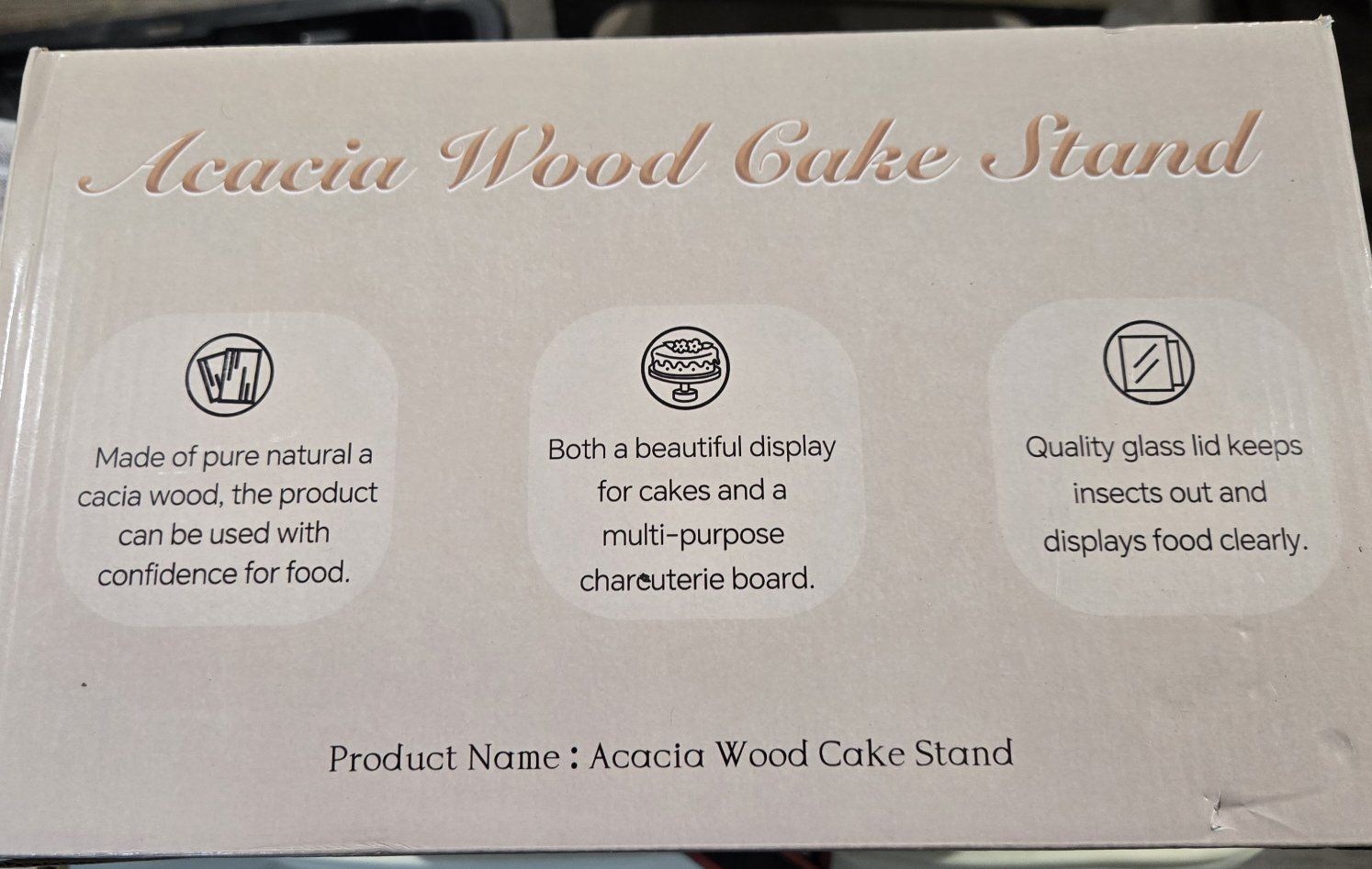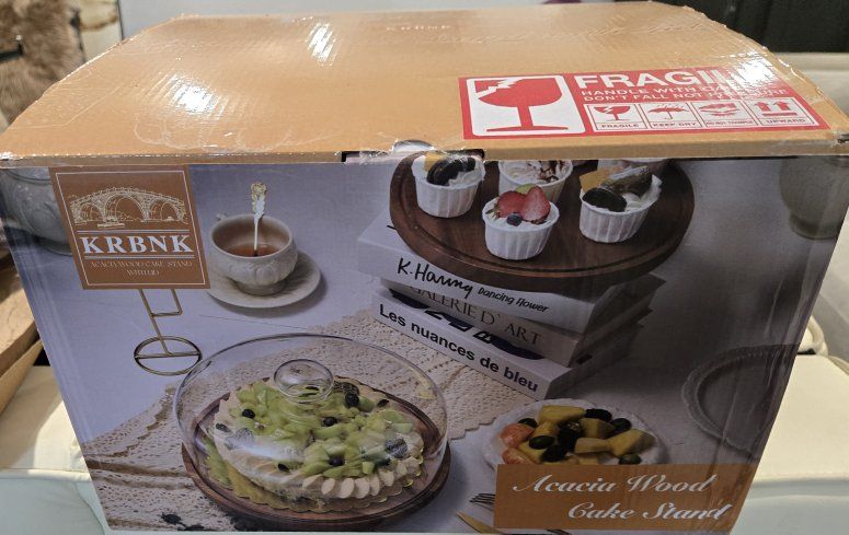 Beautiful, multi-functional Acacia Wood Cake Stand by KRBNK. This is more than just a cake display! The high-quality acacia wood base is reversible—one side is a smooth pedestal for cakes and desserts, and the other side features a built-in sectional tray for charcuterie, nuts, or fruit (as shown on the box). Features: Material: 100% Natural Acacia Wood (durable and food-safe). Lid: Heavy-duty clear glass dome (keeps food fresh and keeps insects out). Versatile: Use it as a cake stand, a veggie platter, a chip-and-dip server, or a charcuterie board. Condition: Brand new in box (only taken out for photos). Brand: KRBNK / Huamao Wood Industry. This makes a perfect centerpiece for parties or a thoughtful housewarming gift! Dimensions: [Insert Diameter here, usually 10" or 12"] Pickup: [Insert your neighborhood/city] Payment: Cash or Venmo preferred.