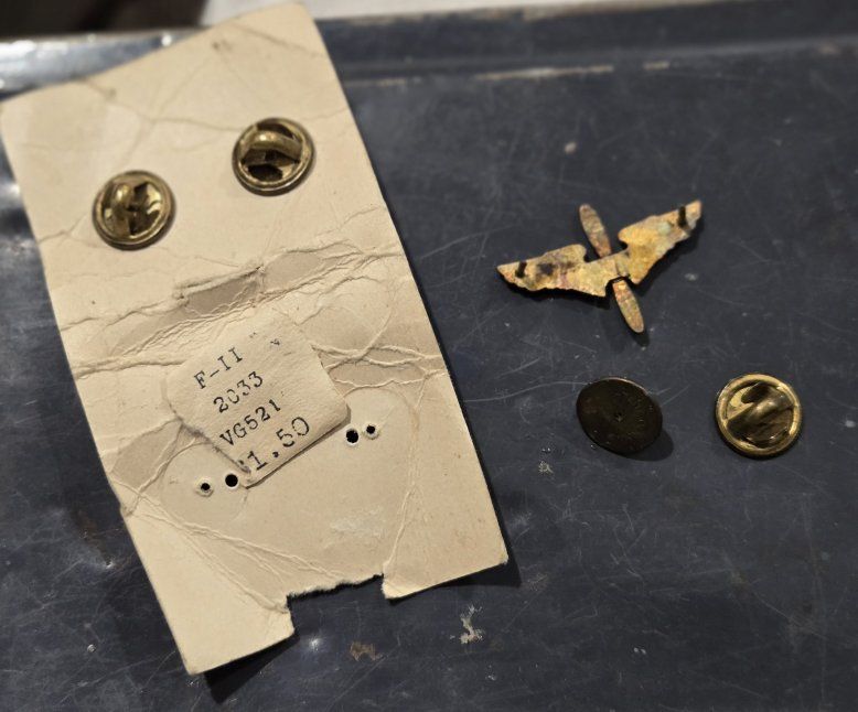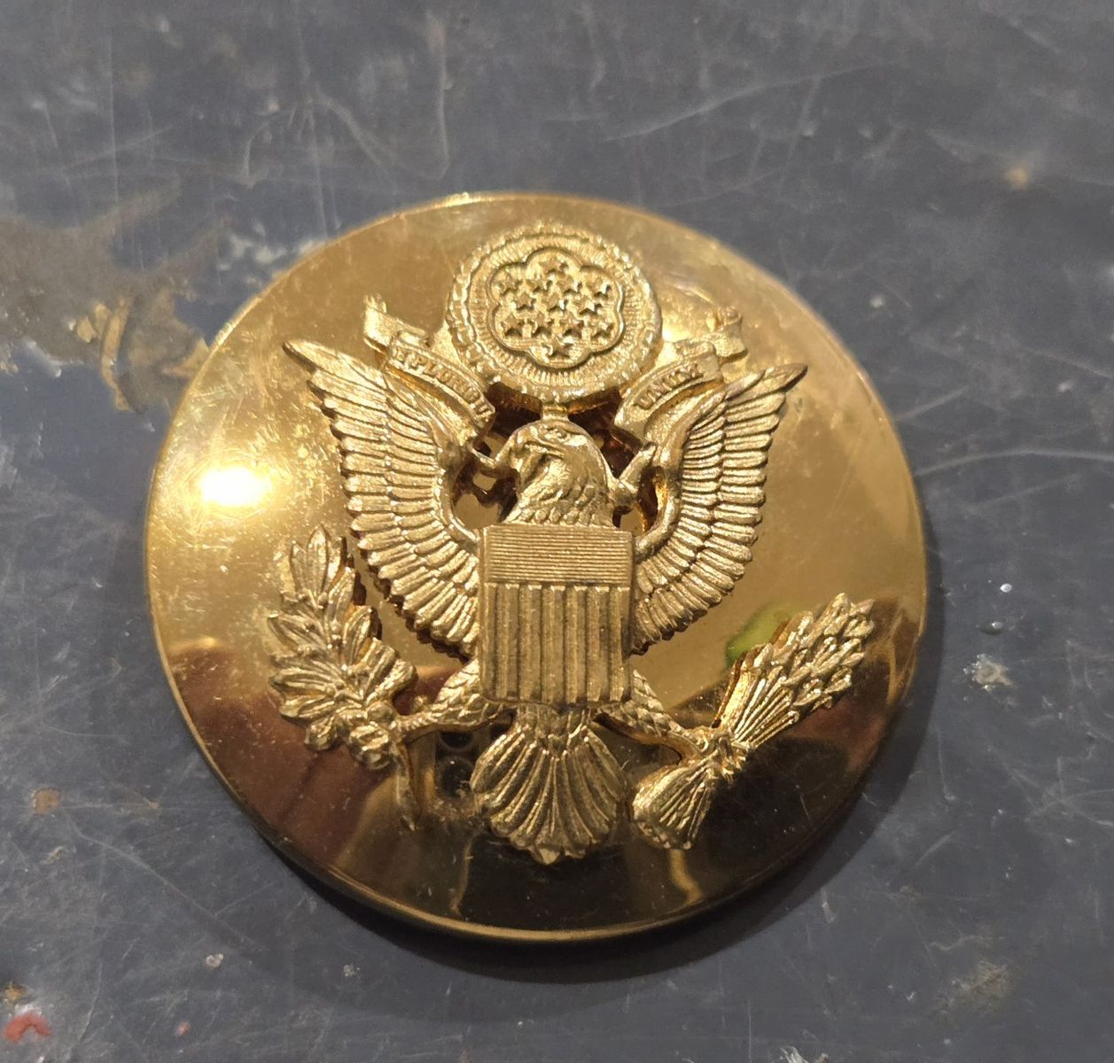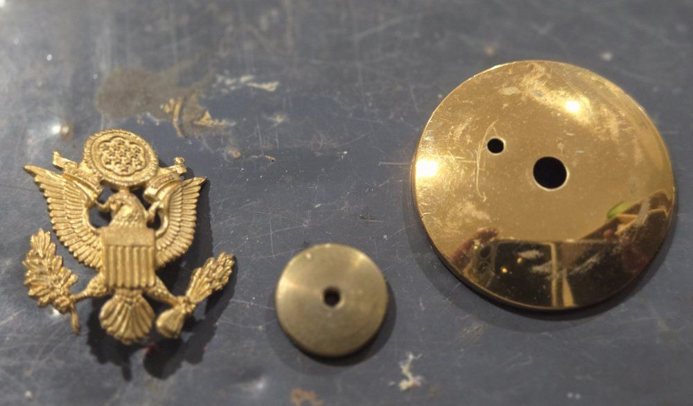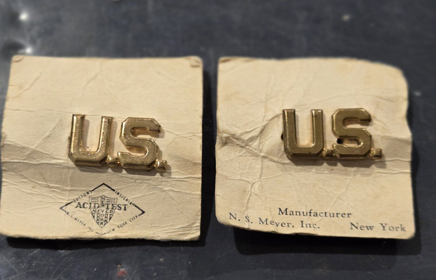 VenmoThis lot includes a variety of authentic vintage U.S. military insignia, mostly from the WWII period. Many pieces feature official maker marks and high-grade finishes. Highlights of the Collection: WWII Army Air Corps "Prop and Wings" Pin: Marked AMICO Sterling with a 1/20 10K gold filled finish. A beautiful example of pilot/aircrew cadet insignia. US Army Officer Cap Badge: Large gold-toned eagle emblem with a screw-back attachment, used on visor caps. N.S. Meyer "Acid Test" Pins: Multiple "U.S." lapel/collar pins marked by N.S. Meyer Inc. New York. The "Acid Test" mark indicates a high-quality gold-plating process designed to withstand corrosion. Rank Insignia: Includes gold-toned bars (Captain/Lieutenant) and smaller lapel pins. Condition: All items are in good vintage condition with a natural patina. See photos for specific maker marks and backings (screw-back and pin-back).