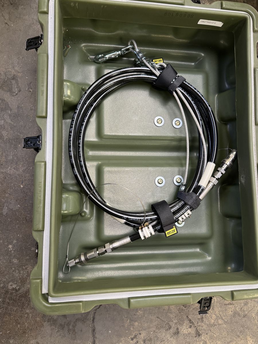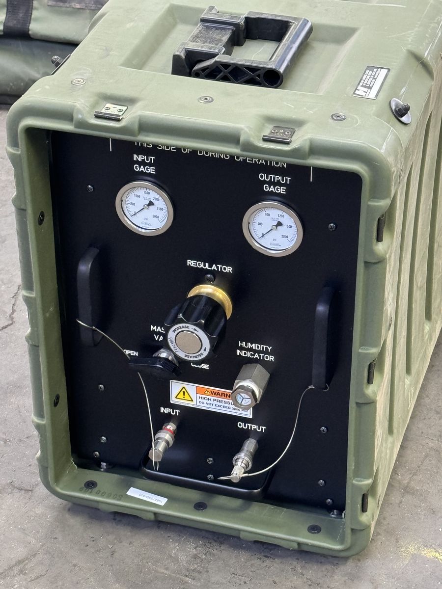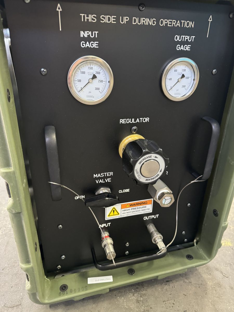 This is a very clean industrial/military surplus setup with built-in input and output gauges, regulator control, master valve, and quick-connect fittings. Comes with the hose assembly shown in the photos and the hard case/container.
