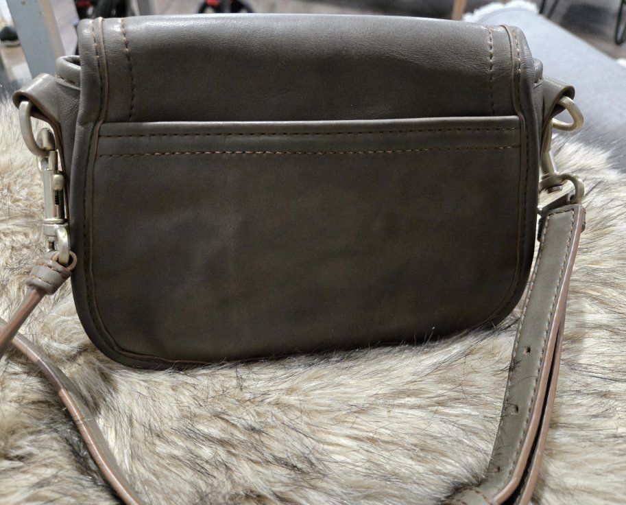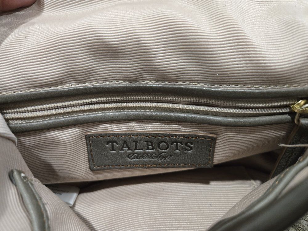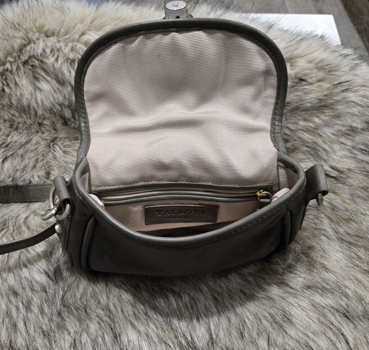 VenmoUp for sale is a high-quality Talbots leather crossbody bag in a beautiful, neutral olive-drab/greige tone. This bag features a classic "saddle bag" silhouette with timeless brushed brass (antique gold-tone) hardware. It is the perfect size for daily essentials without being bulky. Key Features: Material: Supple genuine leather with a durable ribbed textile lining. Versatile Design: Features an adjustable shoulder strap that is also fully detachable, allowing the bag to be used as a large clutch or a bag organizer. Storage: One exterior back slip pocket (perfect for a phone), one main compartment, and one interior zippered privacy pocket. Closure: Secure magnetic snap hidden under the decorative front buckle. Hardware: Heavy-duty brushed brass swivel clasps and buckle. Condition: Excellent pre-owned condition. The interior is pristine with no stains or odors. The leather shows very light signs of careful use with a few minor surface scuffs (see photos), which adds to its authentic vintage character. All zippers and snaps work perfectly. Dimensions (Approximate): Width: 9" Height: 7" Depth: 2.5"