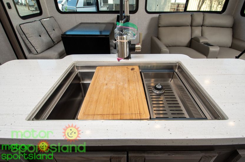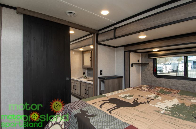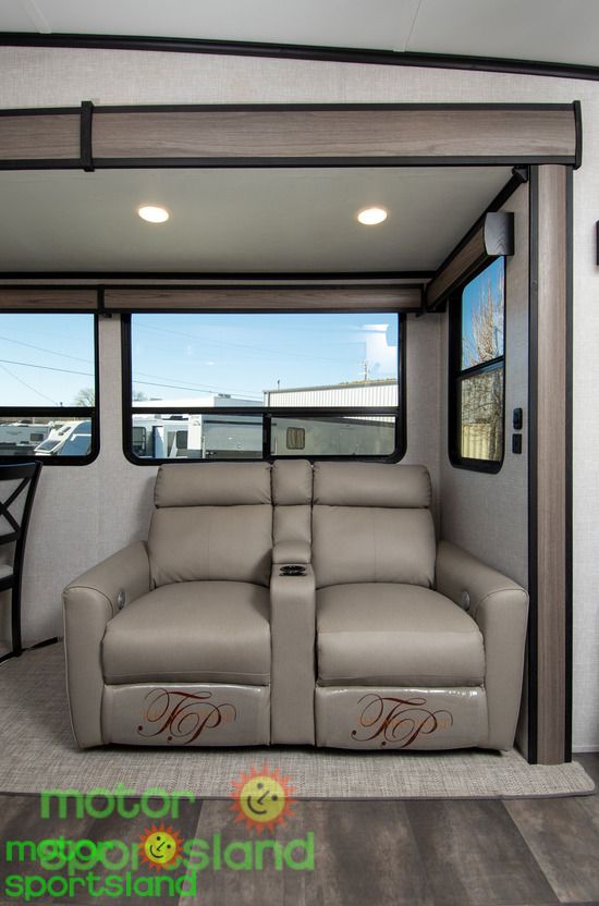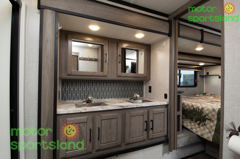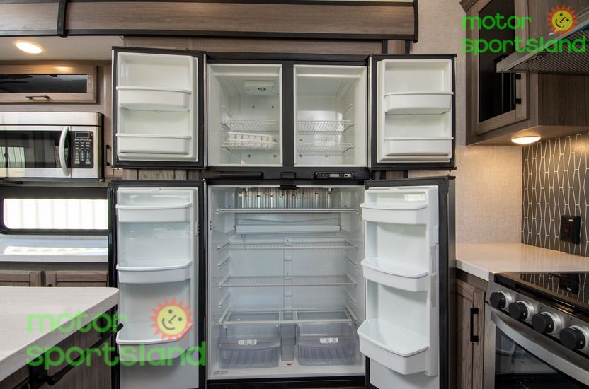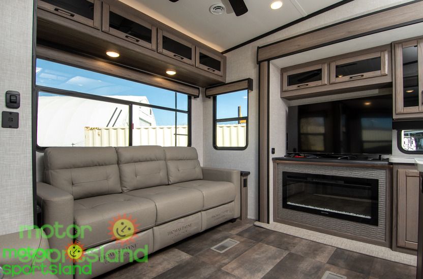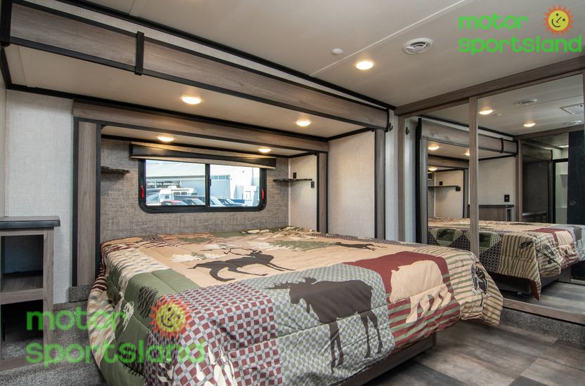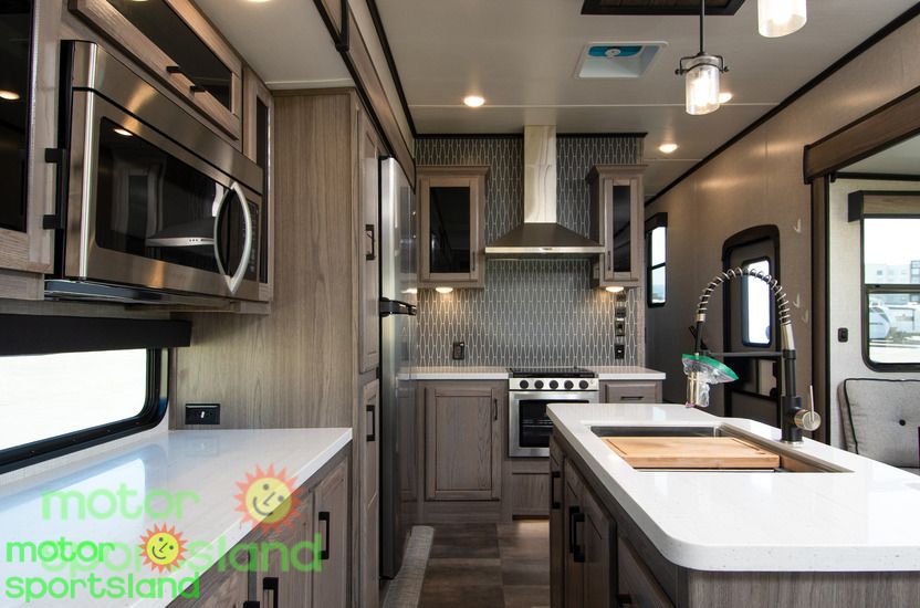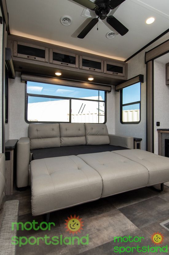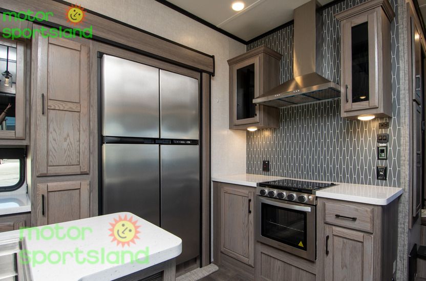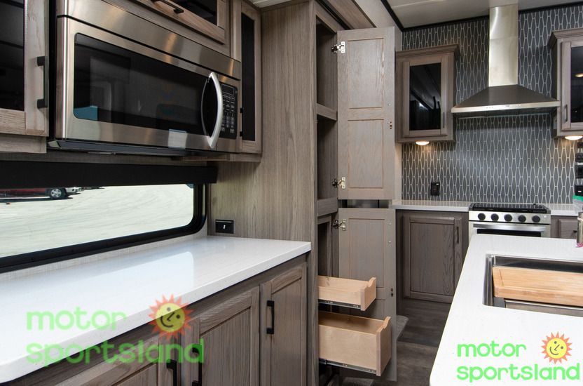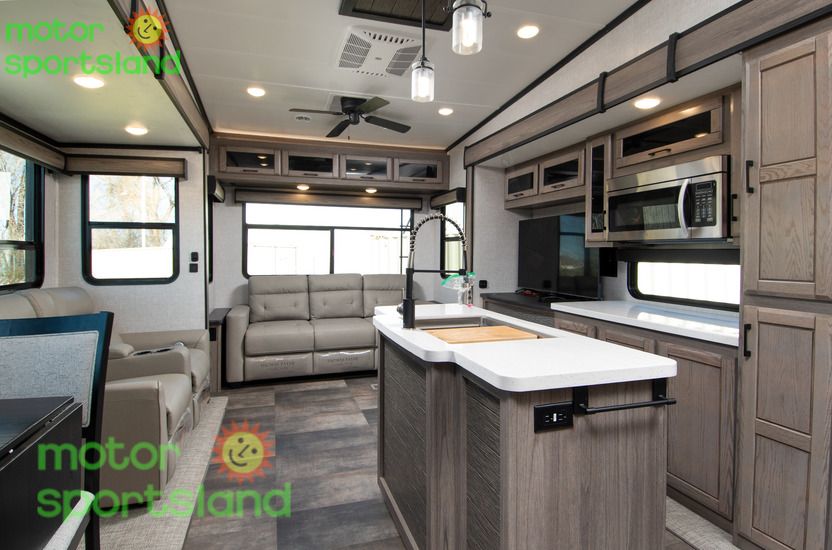 Spacious Living Area: Enjoy a roomy interior with high ceilings and residential-style furnishings, perfect for family gatherings or relaxing after a day of exploration. Luxurious Master Suite: Unwind in a private bedroom with a plush king-sized bed, ample storage, and a serene ambiance that rivals high-end hotels. Family-Friendly Design: Multiple sleeping areas, including a mid-bunk layout, ensure everyone has their own space, making this Fifth Wheel ideal for large families or guests. Modern Kitchen: Cook gourmet meals with ease using top-tier appliances, a large pantry, and plenty of counter space for family feasts. Outdoor Entertainment: Extend your living space with an exterior kitchen and entertainment setup, perfect for tailgating or starry-night movie sessions.