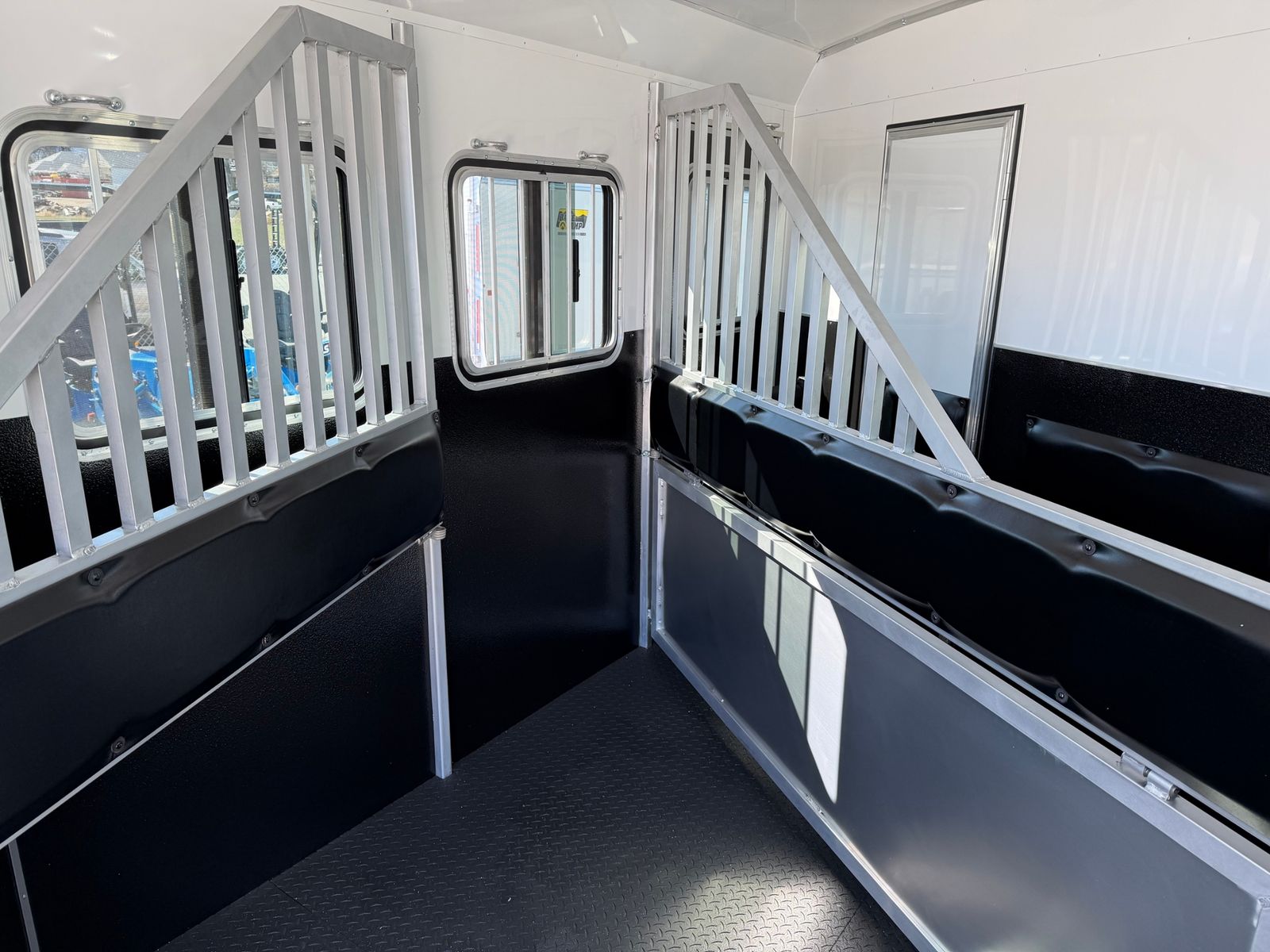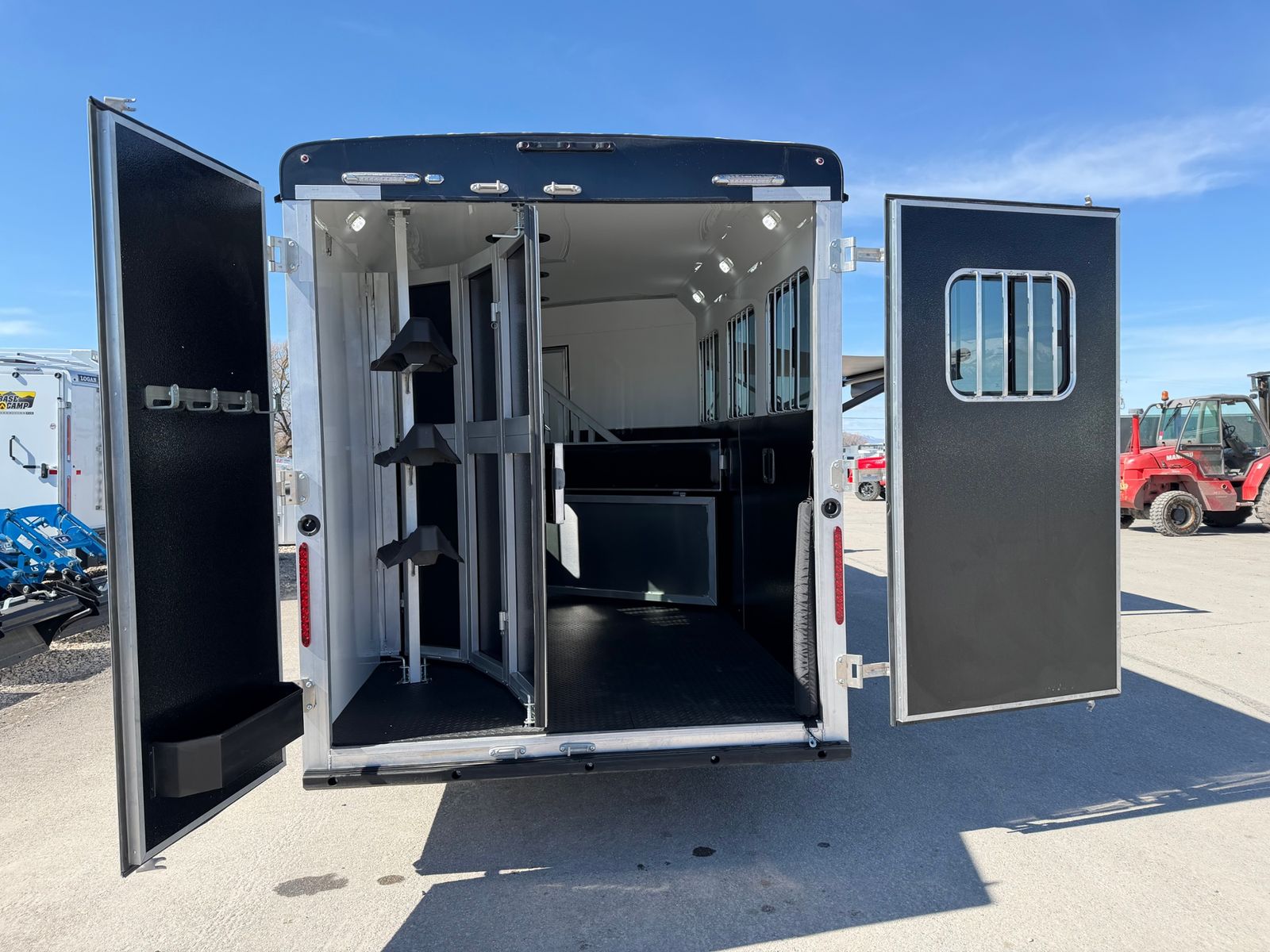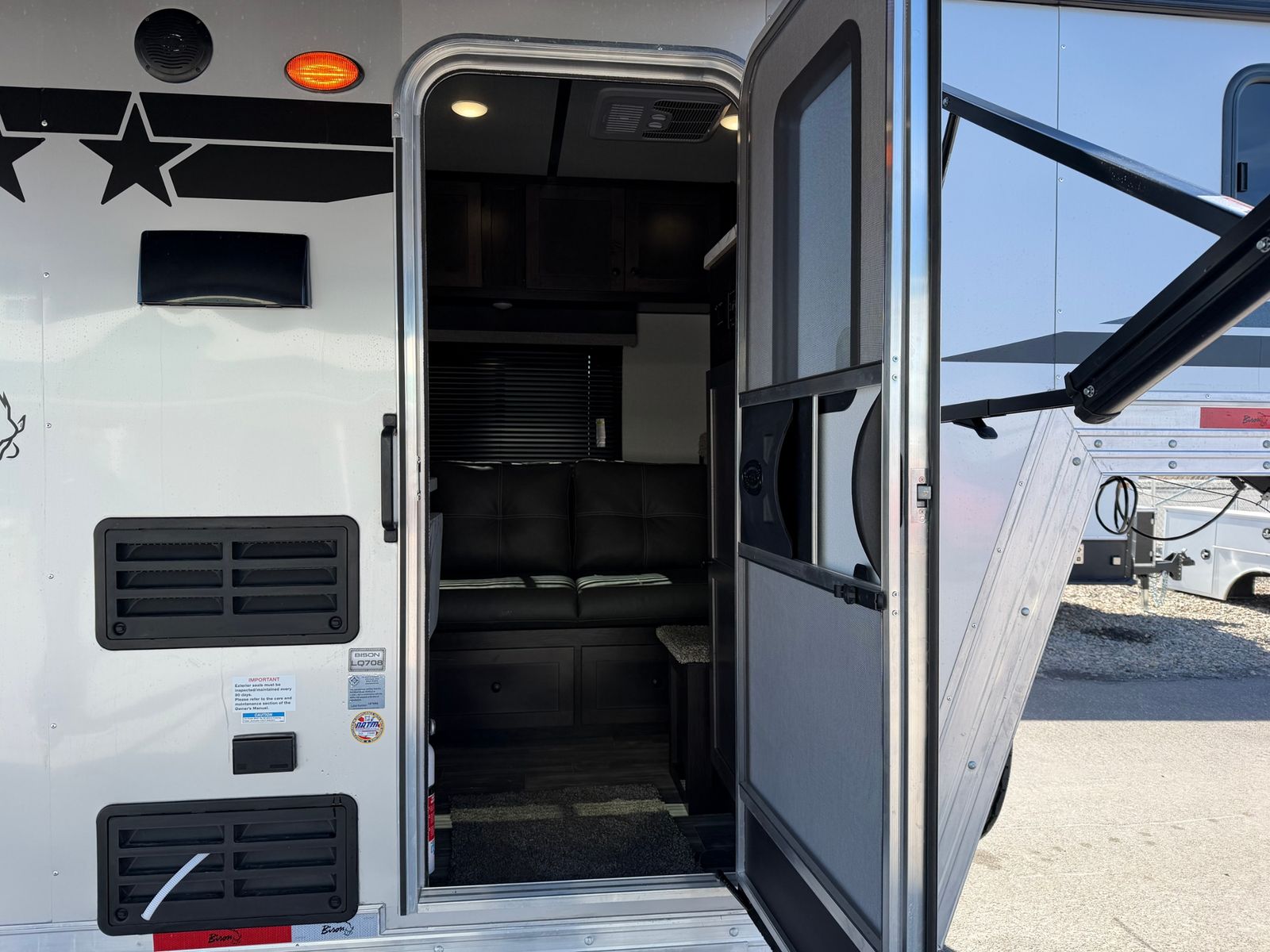 3 Horse Rear Tack Drop Down Windows Jail Bar Dividers 8' LQ 13,500 BTU Air Cond., Non-Ducted 32″ LCD TV W/ Locking Swing Arm Countertop Extension Dinette Free-Standing Table Furnace, 18,000 BTU Interior Chestnut (Brown) Interior Dapple (Grey) Queen Mattress W/ Bedsheet Recessed Cook Top W/ Range Hood Sofa ST235/85R16 LRG Tires W/ Black Aluminum Wheels Upgrade Stereo W/Interior & Exterior Speakers Water Heater Gas/Electric DSI – 6 Gal (ILO Gas DSI) 24X24 Drop Down Escape +D3:D37Window 30 Amp Service W/ Detachable 30 Amp Power Cord 30 x 24 Slider Tail side 30X24 Drop Down Windows Head 3-Way Switch For Horse Area 60/40 Rear Load Doors 6000# Axles Bridle Hooks Drop in Cook Top Exterior Water Spigot Fixed Saddle Tree Led Exterior Lights Led Lighting Throughout LP Tanks (2) W/ Dual Regulator Manual Jack – Single Speed Microwave Mini Blind with valance No Hay Rack One Battery, Grp 24 W/ Shut-Off Rear Load Light (1) Refrigerator (3 CF in units with 8′ SW) Residential Faucets Shirt Closet(S) Shower Curtain Shower W/Dual Control Handles Skylight In Shower Solar Ready Spare Tire & Rim ST235/80R16 LRE Tires With Black Mod Steel Wheels Stainless Steel Kitchen Sink Step (At Entrance Door) TV/Radio Antenna Upgraded Graphics Package Mini Blind w/ Valance Water Heater Gas DSI (6 Gal)