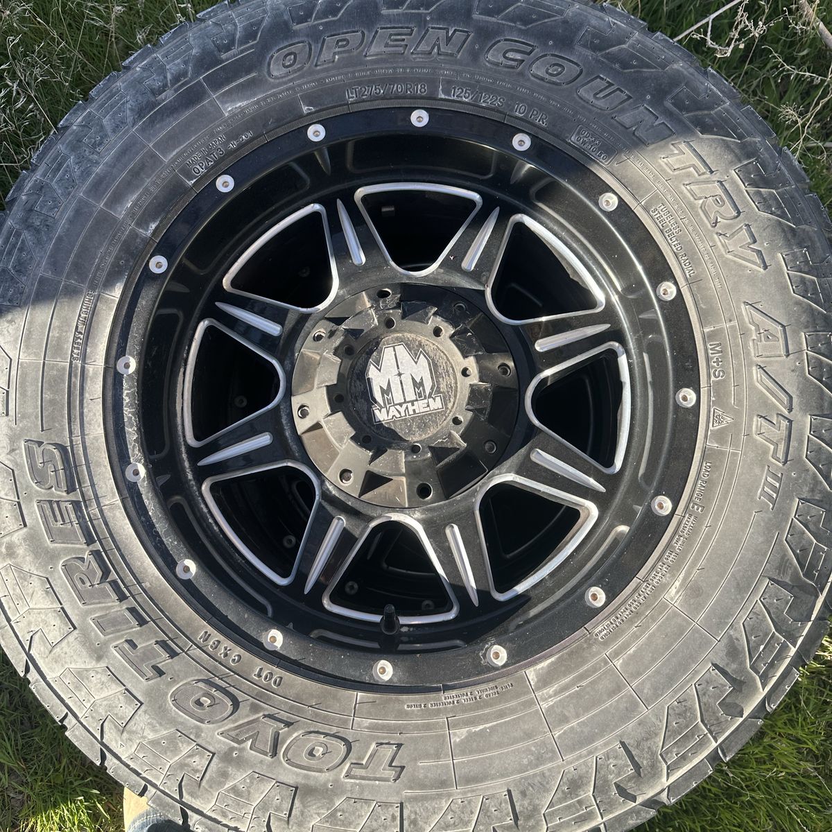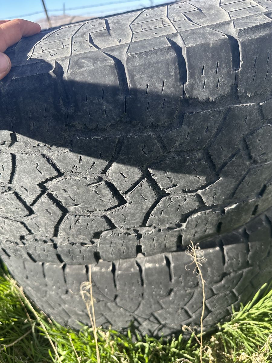 275/70/R18. Wheels are double drilled to fit 8x6.5 or 8x180. Came off of a 2016 Ram. Tires all hold air but don’t have a ton of life left.