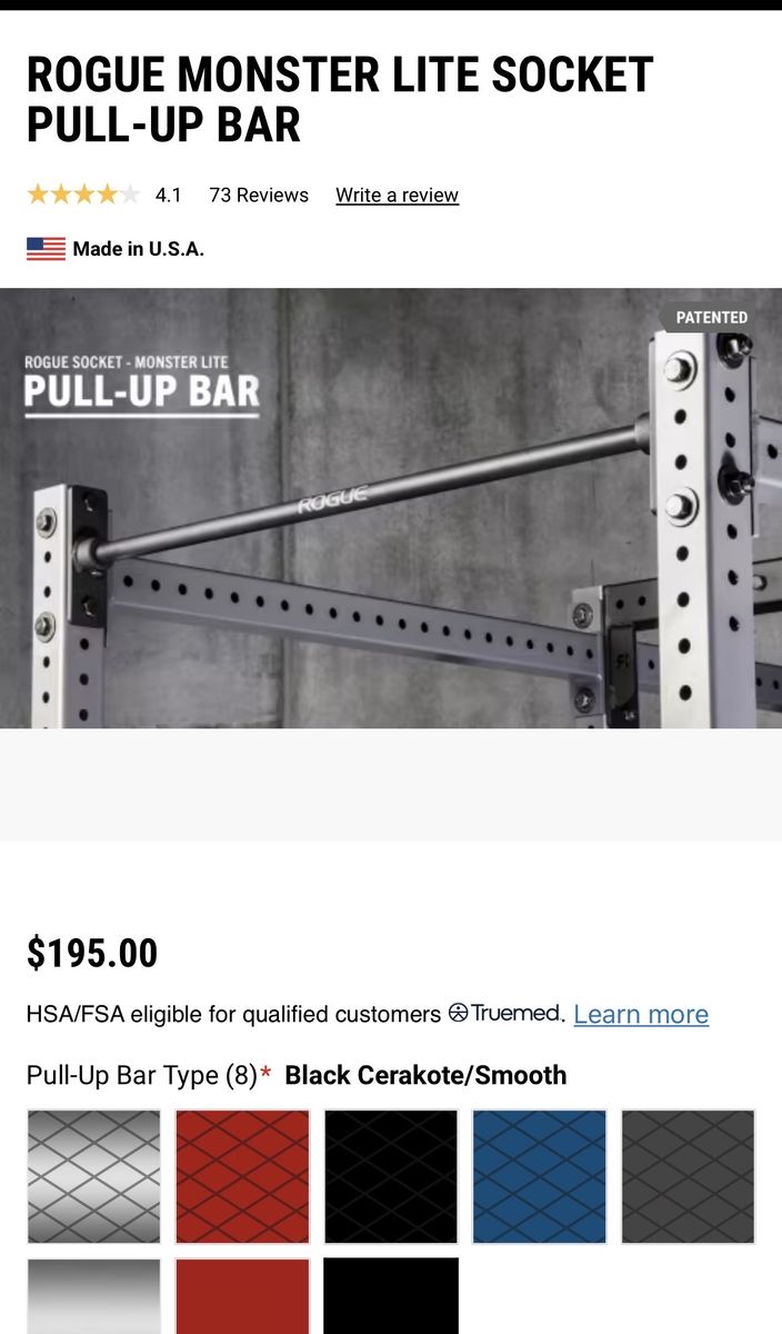 Rogue ML-4 - 4’ Monster Lite Wall Mount Rack with barbell/socket style pull up bar $650 Rogue Monster Lite channel style plate storage 4 pack $75 Rogue SAML-24 Monster Lite Spotter Arms $150 Rogue 28MM Rogue OLY WL Bar - Cerakote - Gray Shaft / Chrome Sleeve $426
