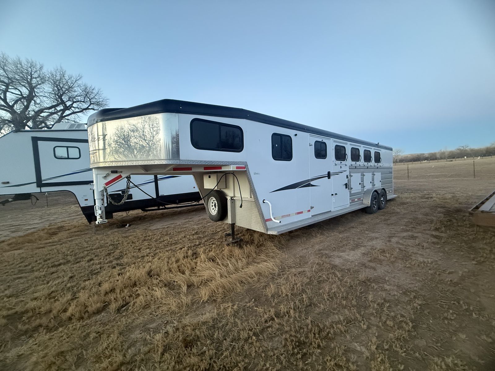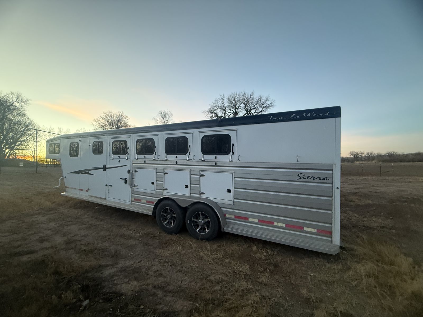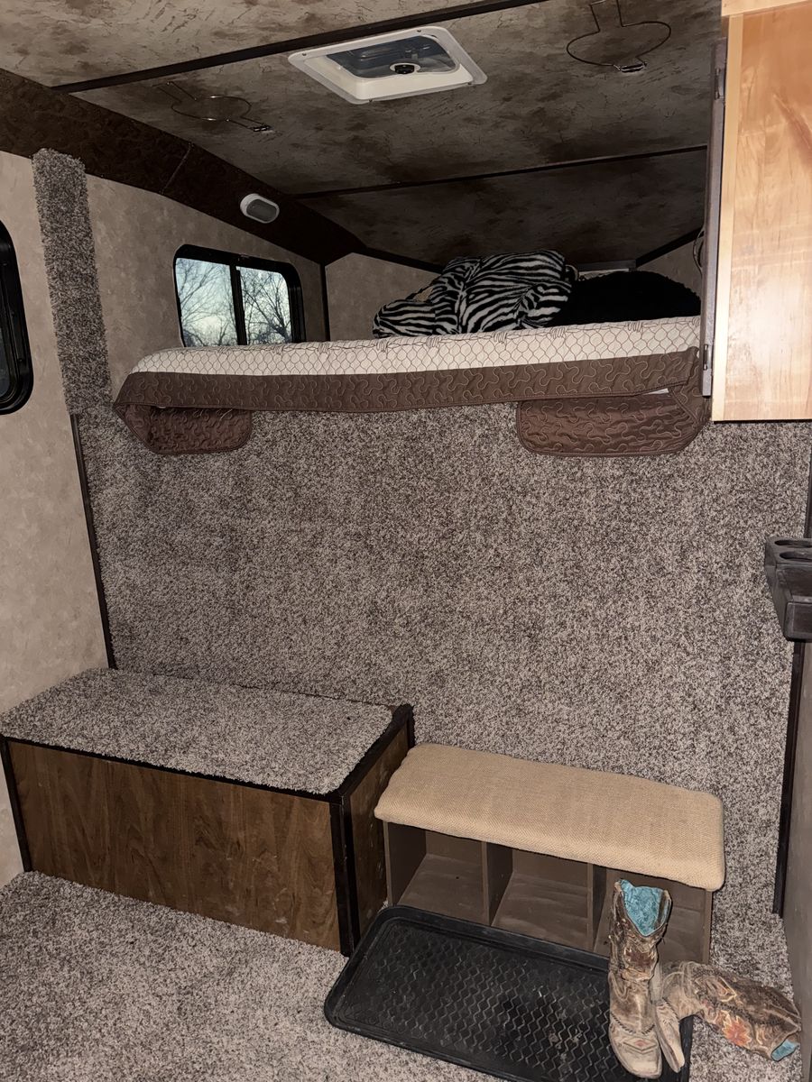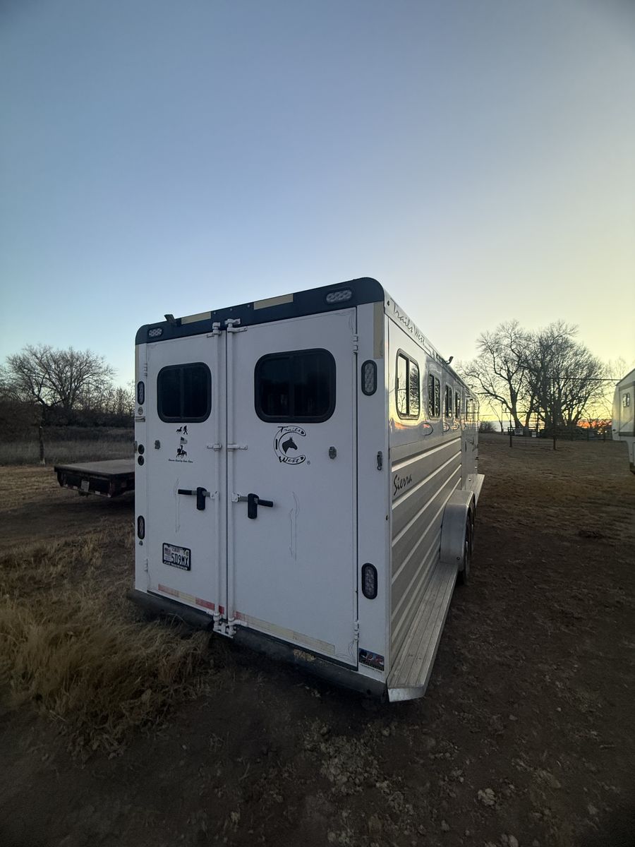ZelleThis has been an amazing trailer. Just time to downsize. Dressing room with mattress above the gooseneck. Has a walk-through door from dressing room to tack room. The tack room is my favorite part about this trailer. It is a walk-through tack room so it opens up from both sides of the trailer. Holds eight saddles. It is a Sierra two so it has the better walls where the horses go. It is seven wide by seven tall. Four horse slant load with stud wall in the front. It has always been taken care of and maintained. Literally only gets used a half a dozen times a year. New tires put on it last year. Also has extra storage along the side with feed mangers inside.
