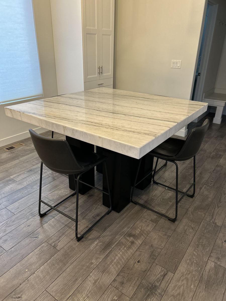 ZelleBeautiful marble table. Paid 1500, 3 yrs old. 54X54, 36” high. Fits 8 easily. Will include 4 chairs (value of $100 ea, faux leather)