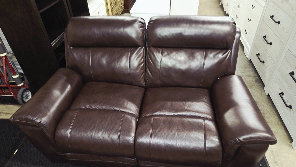 Gorgeous manual recliner loveseat in brown leather upholstery. Features ultimate comfort seats with easy pull manual recliners. Perfect size for any area of your home. Backs are removable for easy transportation. Great condition! Located in Layton.
