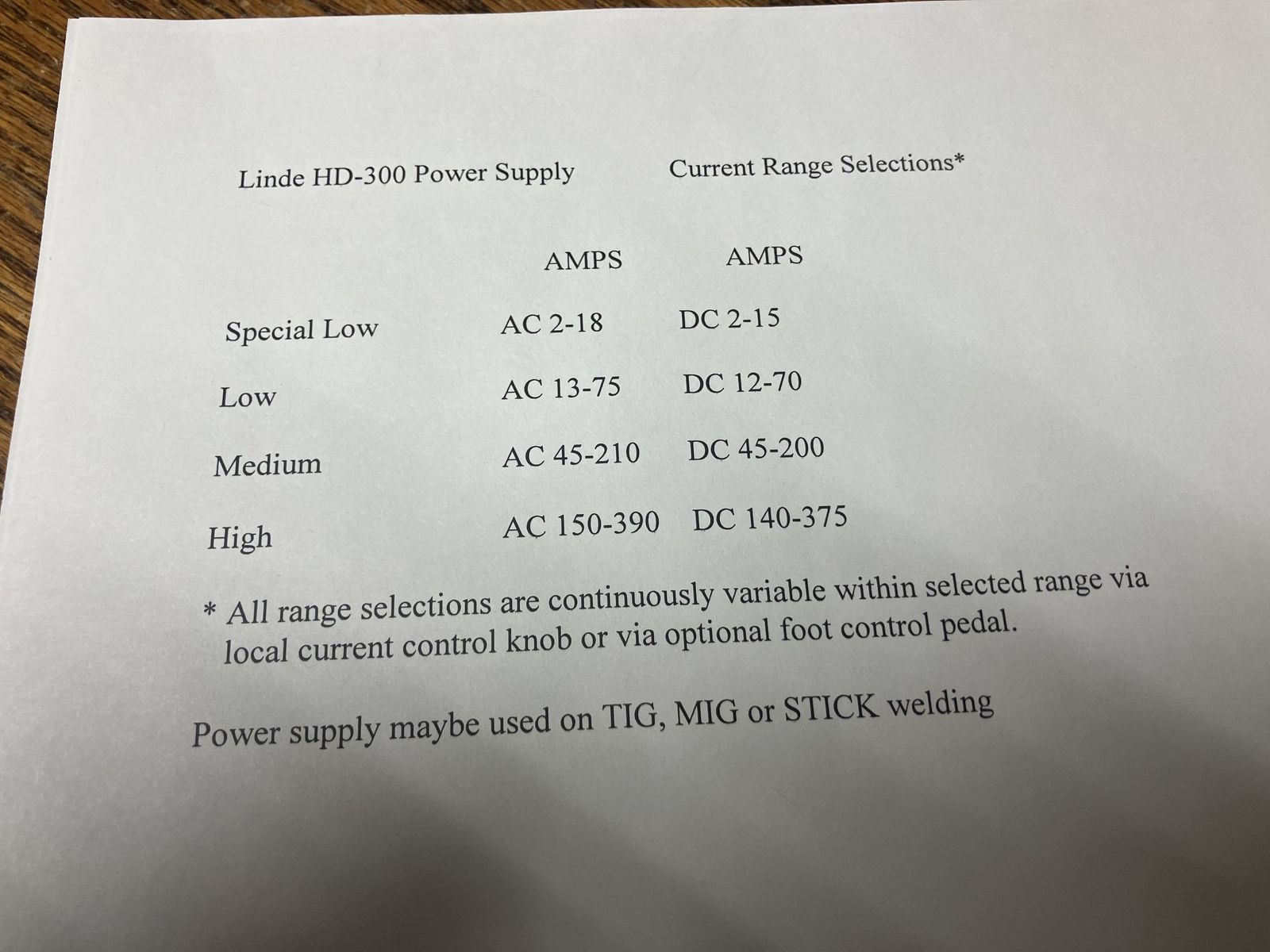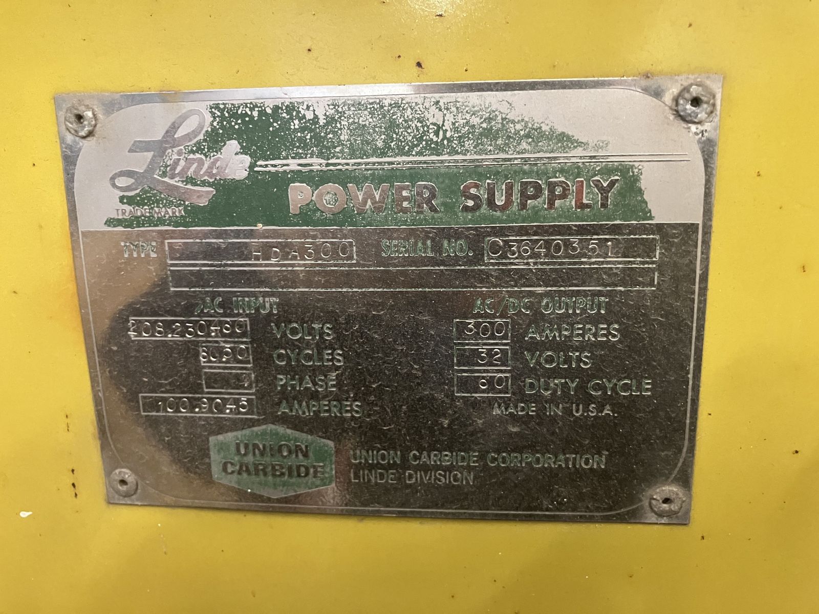 Linde HDA-300 power supply in good working condition. currently connected for 240/208 single phase. DC output ranges adjustable from from 2 thru 375 amps / AC output adjusatble from2 thru 390Amps. selectable soft start, High Frequency start or continuous,phase shift, selectable for local or remote control, has full compliment of gas valves. mounted on wheeled base with automatic braking. We also have forklifts for loading onto truck or trailer.
