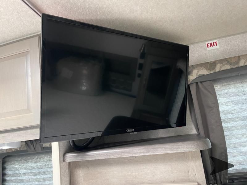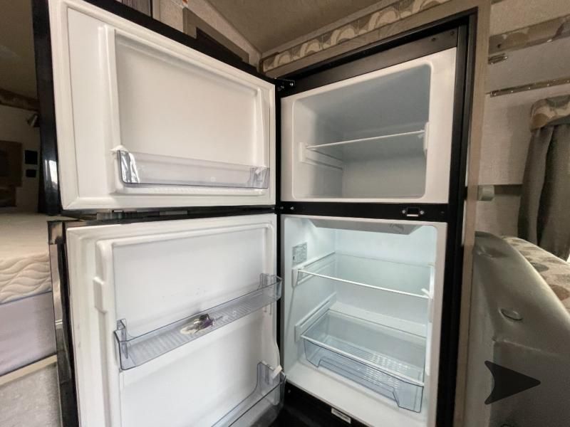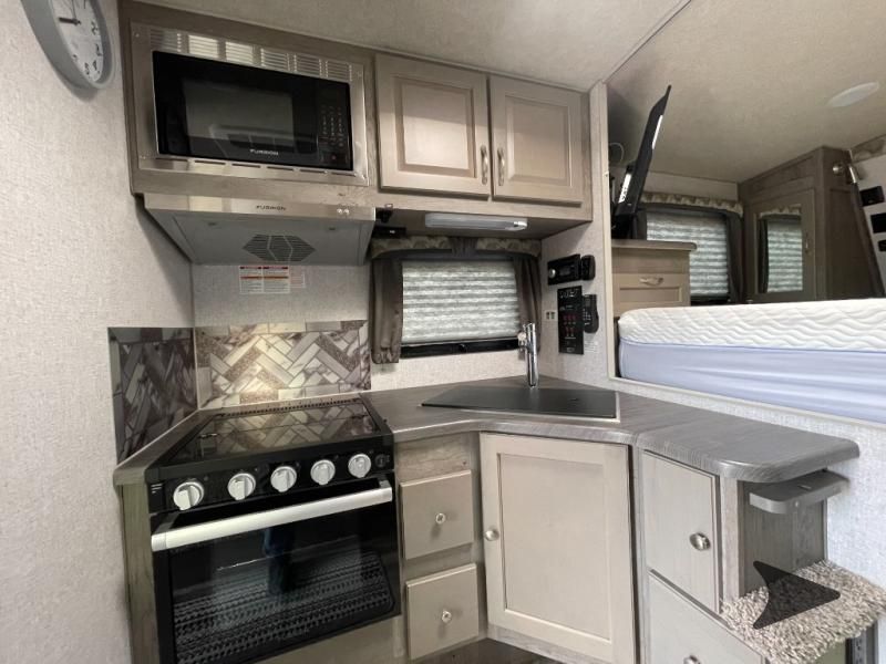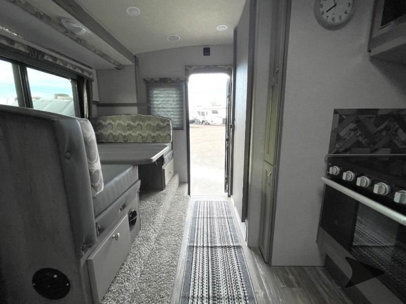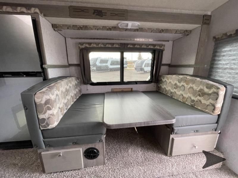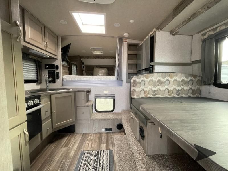 Features include a slide-out dinette for extra space, full wet bath, kitchen with stove/microwave, and a comfortable queen bed. Sleeps up to 4. Equipped with solar, heated holding tanks, and tons of storage throughout.