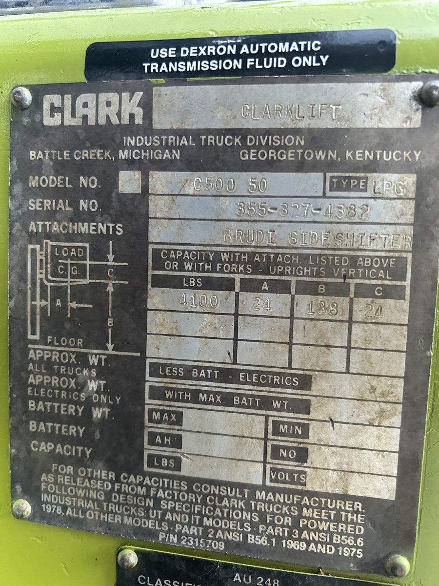 Clark Forklift LPG- Propane Model - C500 50 S/N 355-327-4382 Automatic Transmission 5000 lb. Lift w/ side Shift 3 Stage Mast - 188 ins. Tall at forks raised. 4 Ft. Heavy Duty Forks New LP Tank, New Tires, New Seat New LED Front Lights New Service on Machine New Tune-up Comes with Cab Cover if wanted- Clear plastic cover with zippers Runs and works good. $7900.00 or make offer. Free Delivery within 50 miles one way. Take Cashier Check only Preferably call Bart # 435-512-0665 Don’t always hear text. Hyde Park, Utah 84318