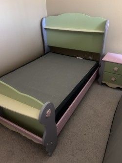VenmoWe are selling a kid full bed frame and side table. It is in great condition with some wear and tear from kids love over the years. It comes with a box spring in great condition too.
