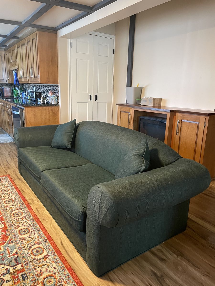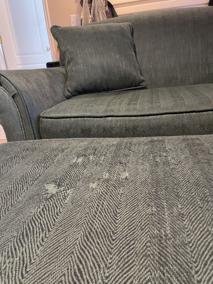 Sturdy, textured, fabric couches. Some wear and tear from normal use, as you can see in the pictures.