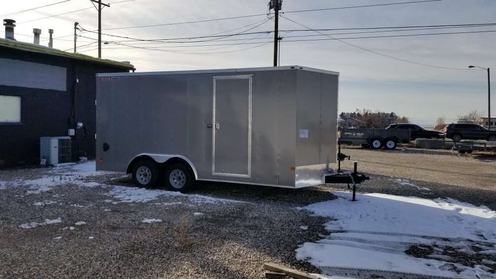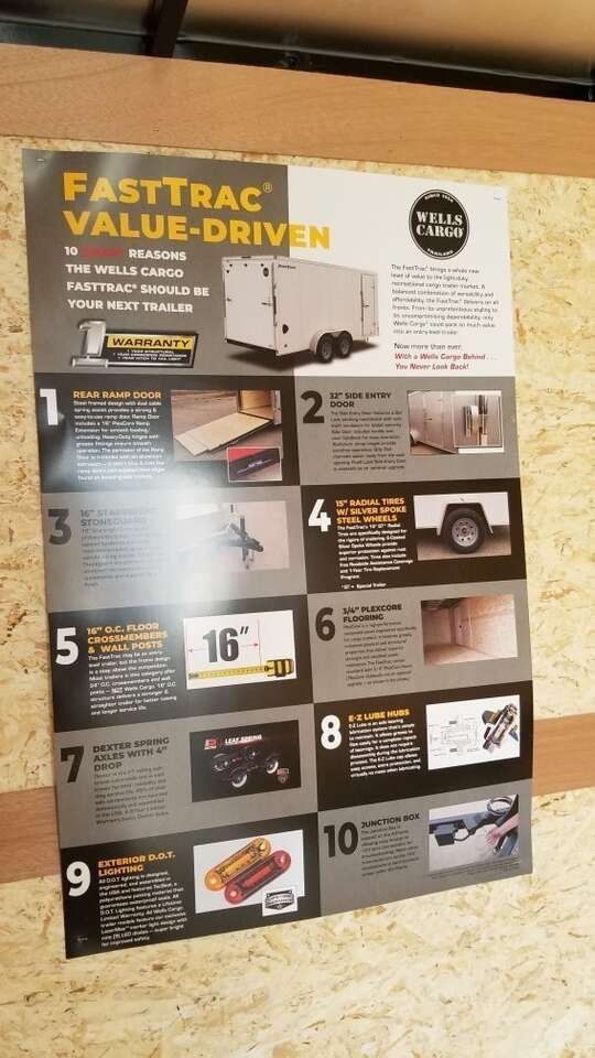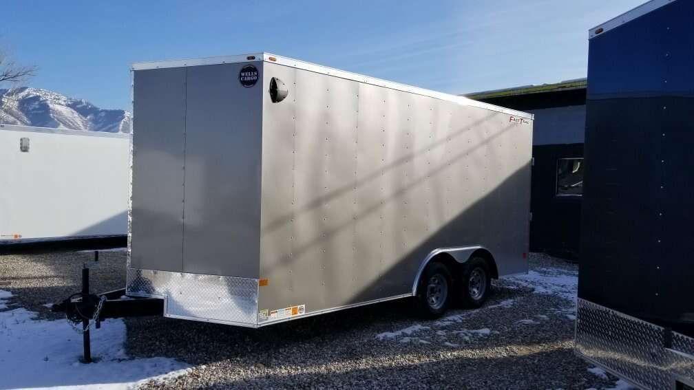WELLS CARGO 8.5X16 ENCLOSED TRAILER WITH 7FT INTERIOR HEIGHT AND REAR RAMP DOOR. FASTTRAC DELUXE MODEL FT8516T2-D, RV STYLE SIDE DOOR, REAR RAMP DOOR WITH 16IN RAMP EXTENSION, 7FT INTERIOR HEIGHT, SEMI-SCREWLESS EXTERIOR, 16IN ON CENTER WALL FRAME, 16IN ON CENTER CROSS MEMBERS, TANDOM 3500 # AXLES, 7,000 # GVWR, BRAKES ON ALL WHEELS, RADIAL TIRES,