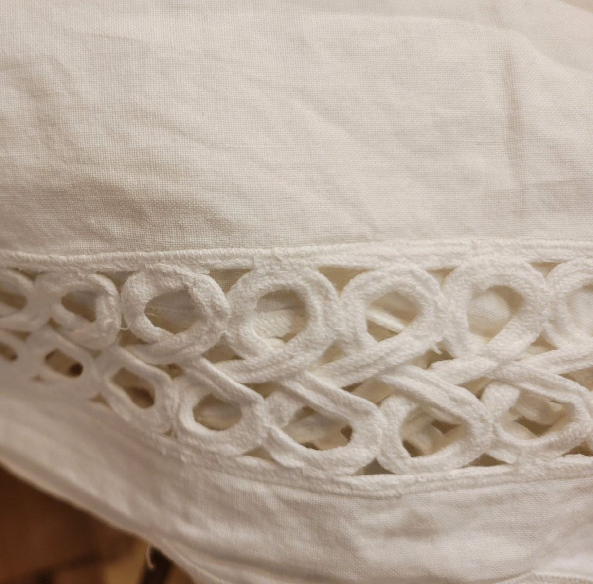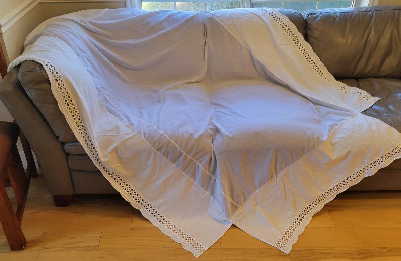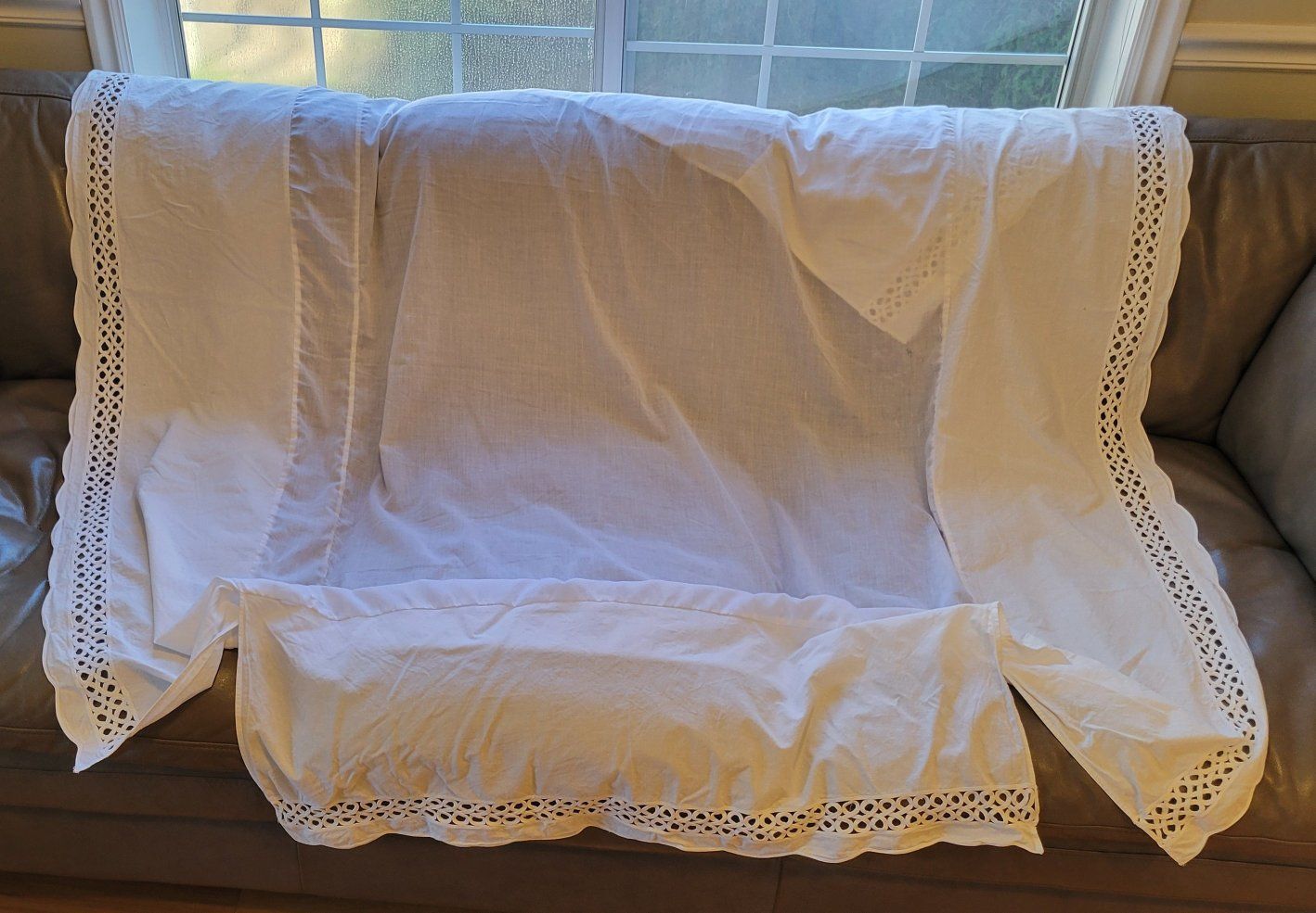 Antique eyelet dust ruffle. White cotton, twin size. A few imperfections in the fabric from age - imperfections will be covered by the mattress.