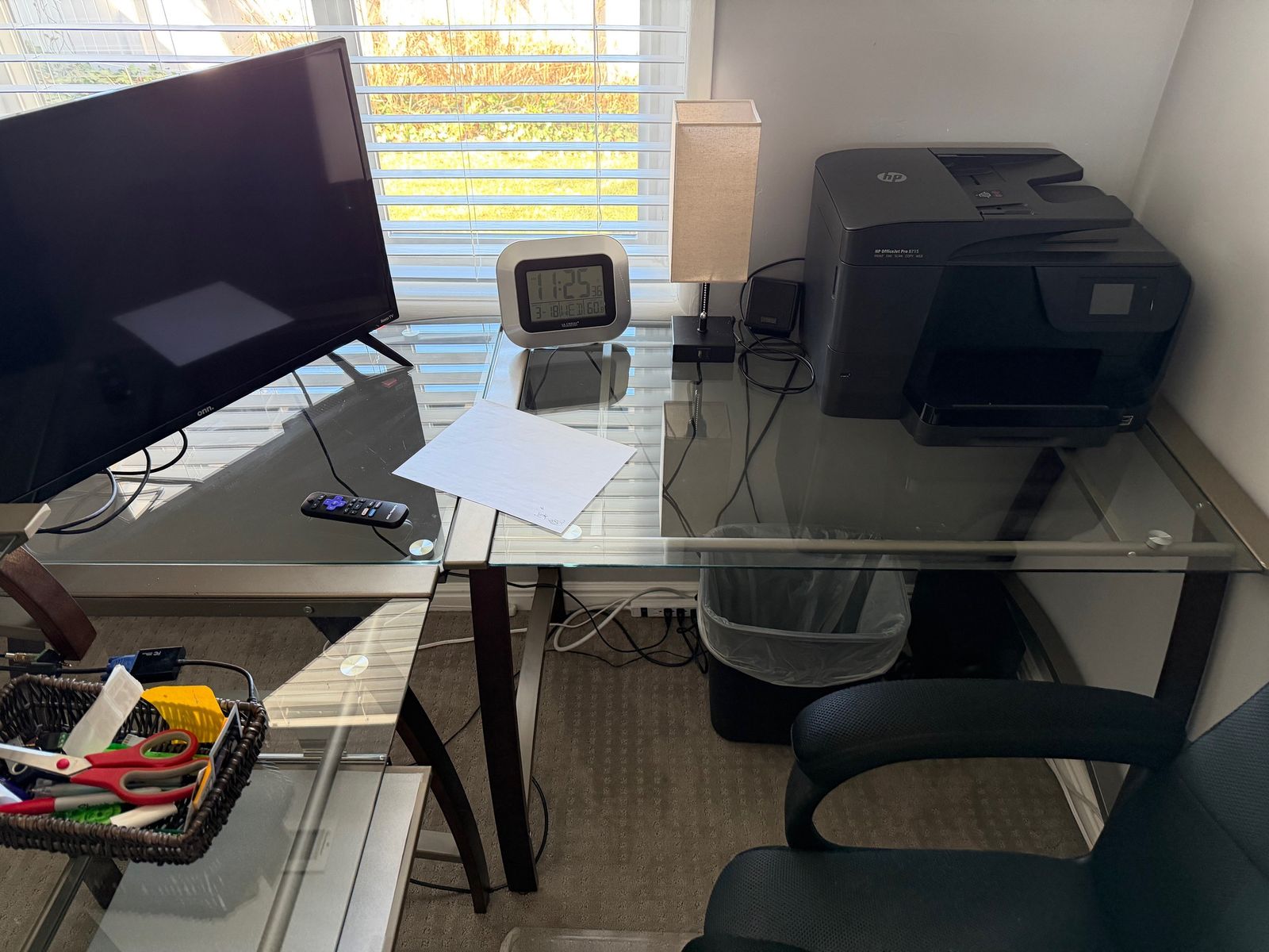 VenmoDesk is 68 inches wide from front and 68 inches from front to back on side piece. Includes office chair and floor mat.