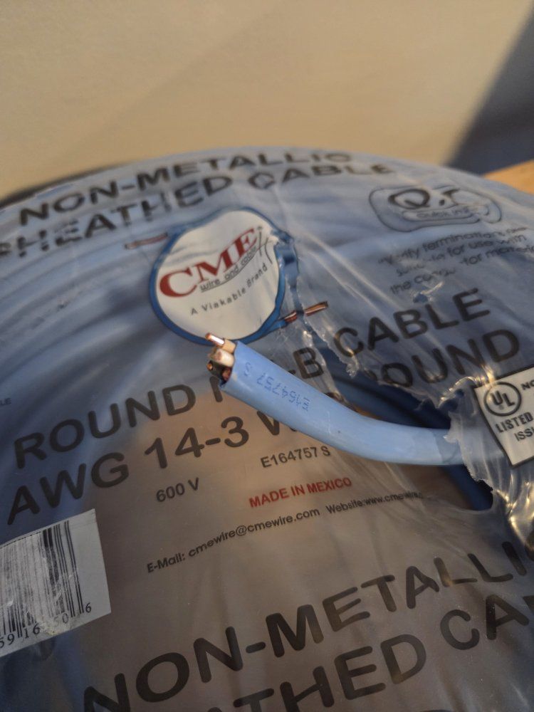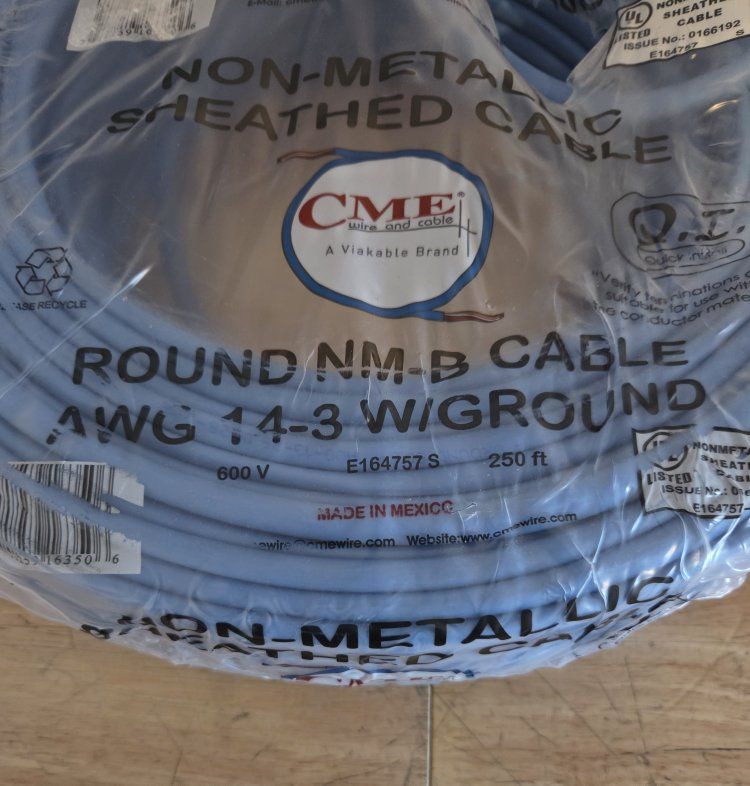 VenmoCME WIRE AND CABLE ROUND NM-B CABLE AWG 14-3 WITH GROUND, 250' FT, 600V, COLOR BLUE, NONMETALLIC SHEATED CABLE, UL LISTED, E164757 S, NEW, $140, send me a message if you are interested I'm located in West Valley City PICK UP ONLY