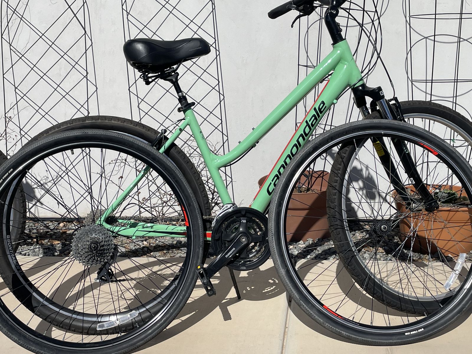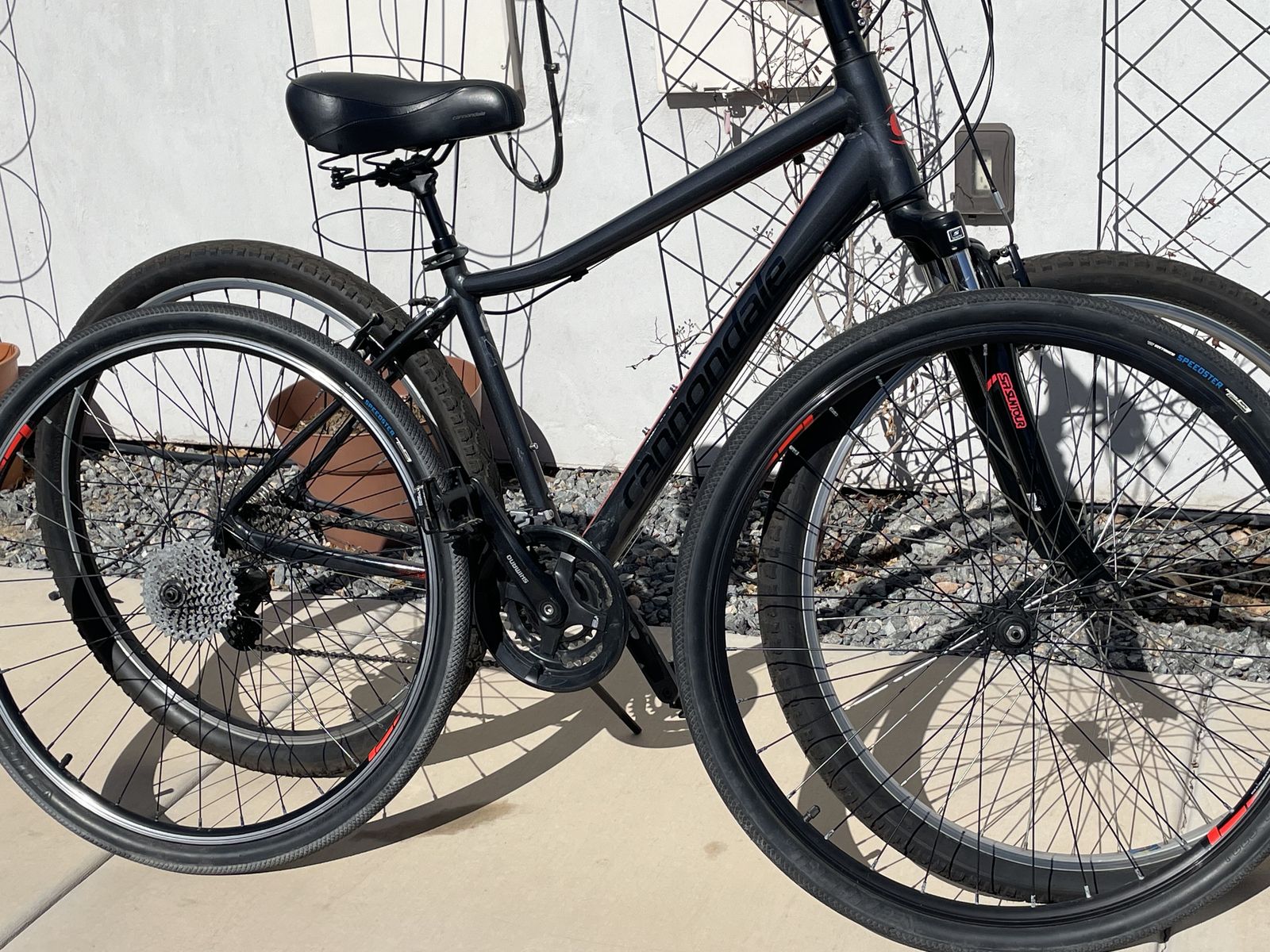 These two are Cannondale Adventure bikes. They come with two sets of tire and wheels for paved or dirt and gravel trails. Price is $250.00 each.