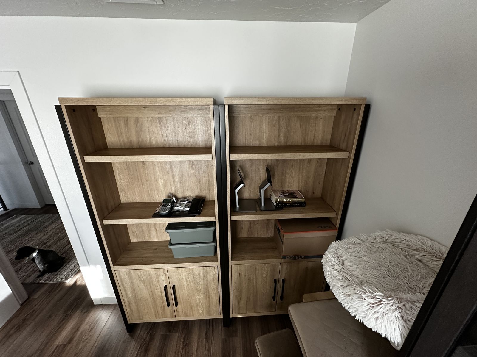 The one bookshelf has a slight puncture on the back, but it’s not noticeable. Other than that, no scratches or issues. We’re just moving across the country and don’t have room.
