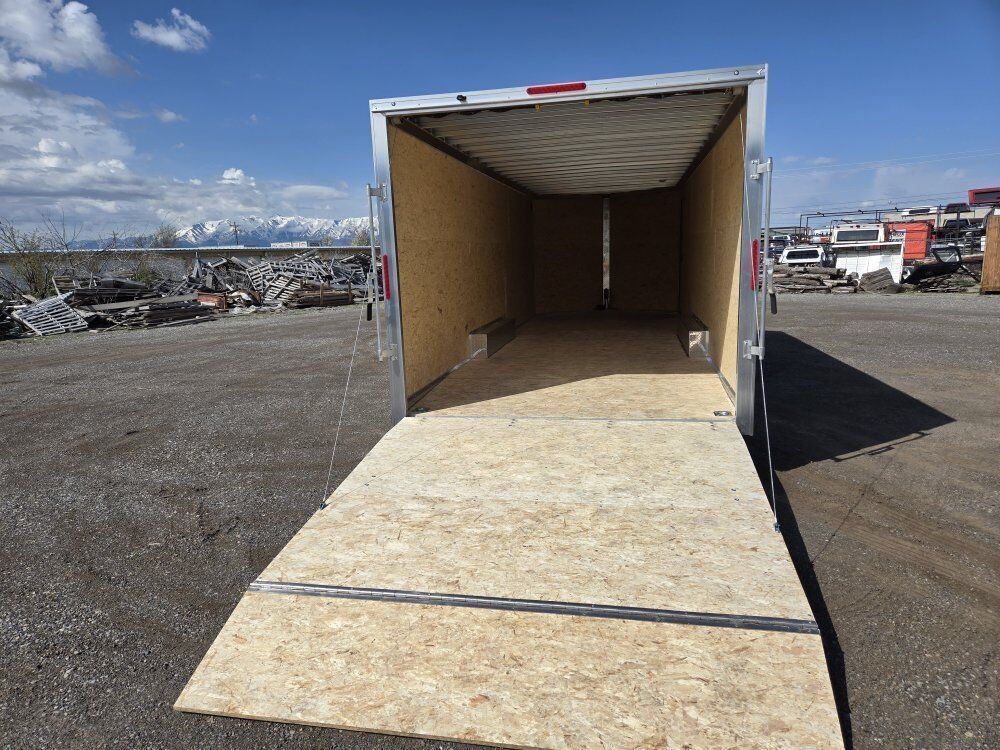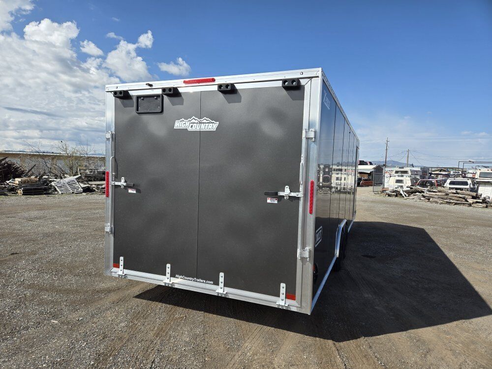 NEW 8.5X24 ALL ALUMINUM ENCLOSED TRAILER WITH 7FT INTERIOR HEIGHT AND REAR RAMP DOOR WITH 81IN OPENING HEIGHT.