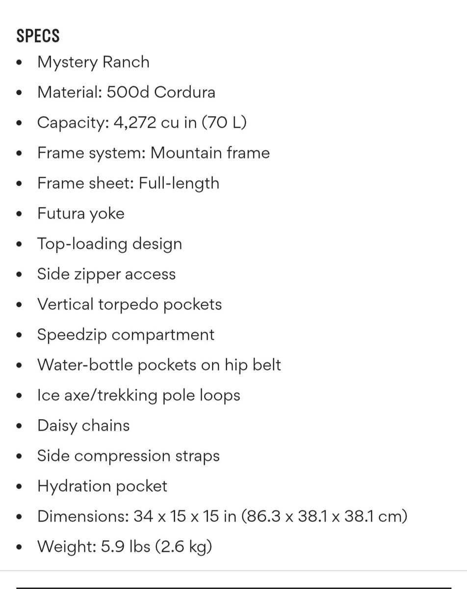 Large enough for extended vacations and thru-hikes, the Mystery Ranch Glacier backpack comes loaded with features for your next adventure. Made from 500d Cordura, it has a 70-liter main compartment with a top-loading design and a side zipper that makes packing and finding your belongings quick and easy. Two vertical torpedo pockets provide plenty of storage space for small items, while two stretchy bottle pockets let you keep your water handy. A Speedzip compartment allows you to stow essential gear, like a sleeping bag or jacket, for fast access. Horizontal and vertical compression straps help you reduce overall pack size, while integrated loops let you lash on items like water bottles and ice axes. Finally, the integrated hydration reservoir pocket can be accessed from outside the pack and is compatible with most reservoirs.