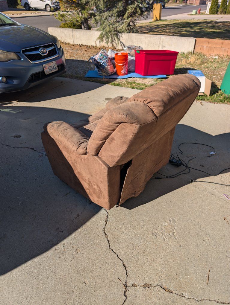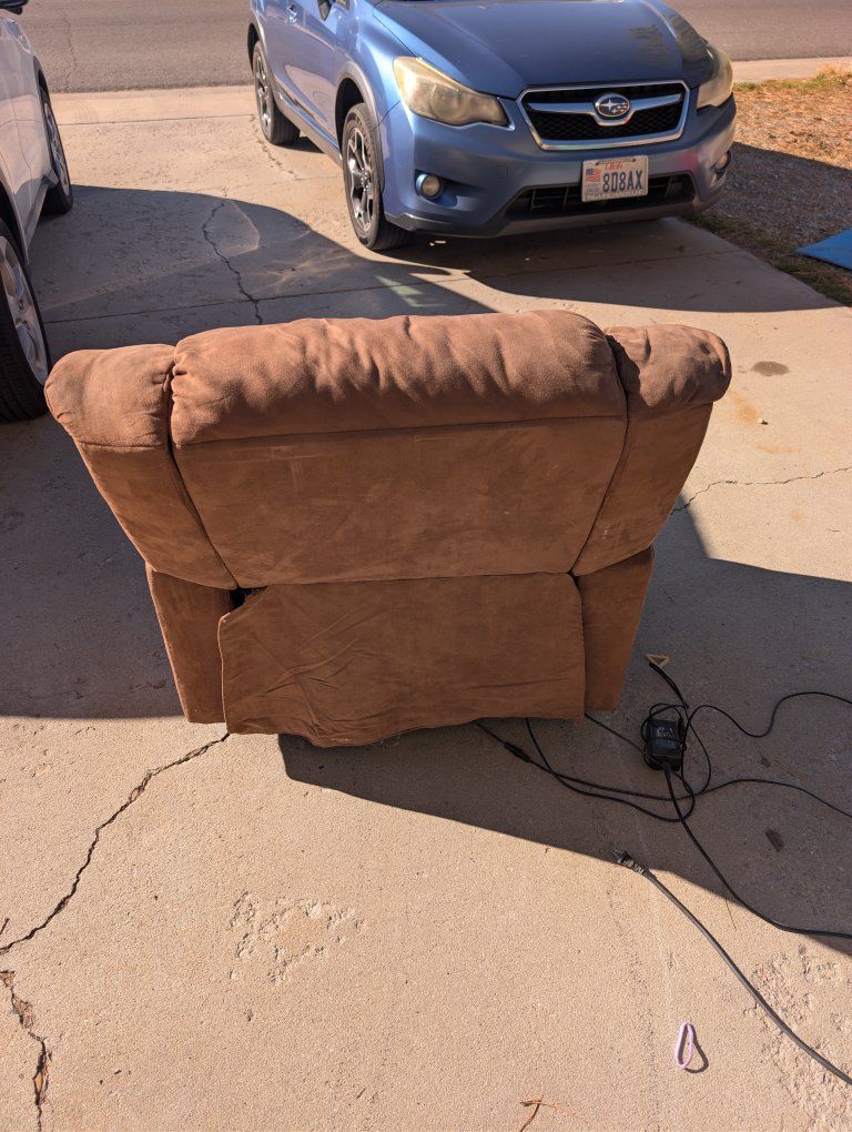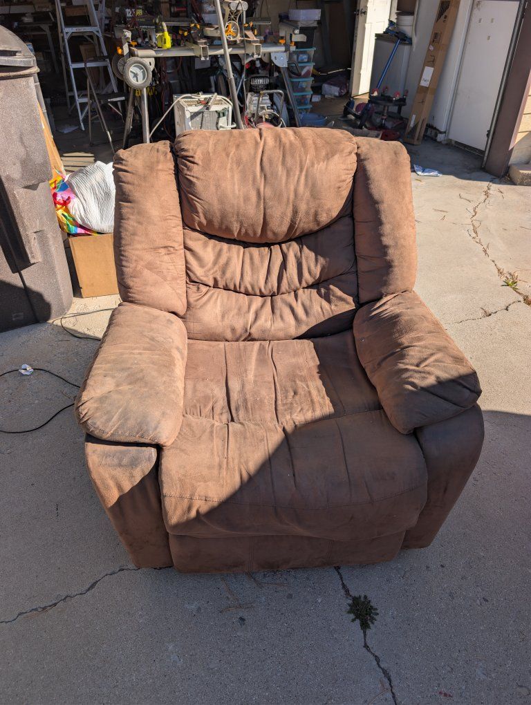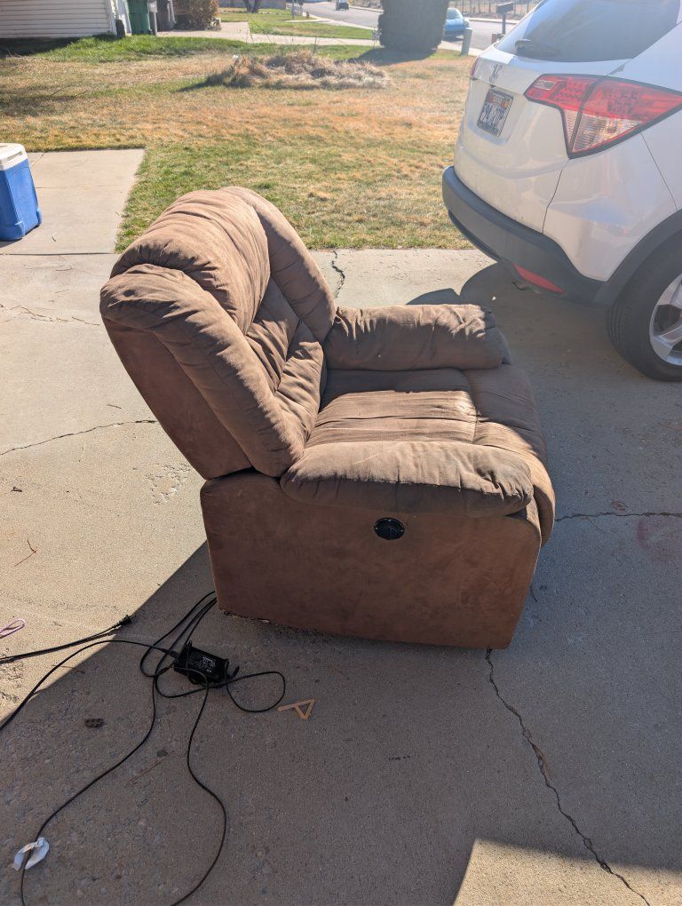 PayPalComfortable brown power recliner in used condition. Reclining and power functions work, but the fabric shows wear and could use a good cleaning from regular use. Still very comfy and perfect for a man cave, garage, or extra living room seating. From a smoke-free home, pickup only in Provo. Priced to sell, first come first served.