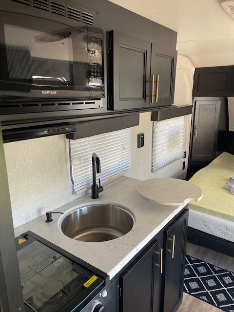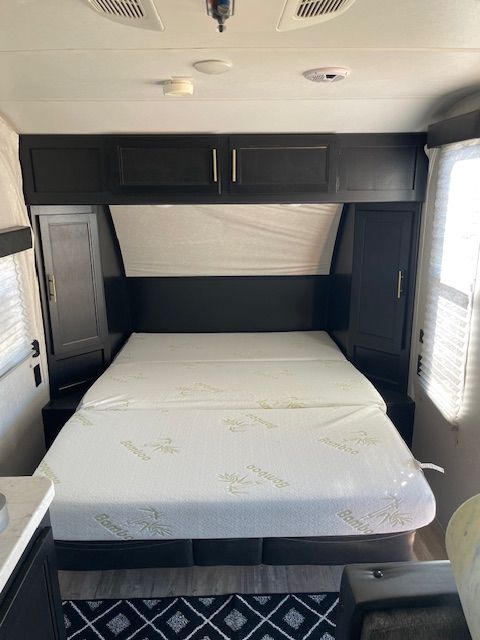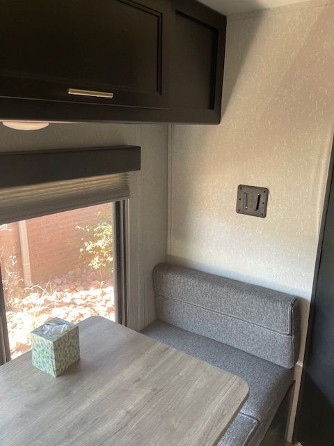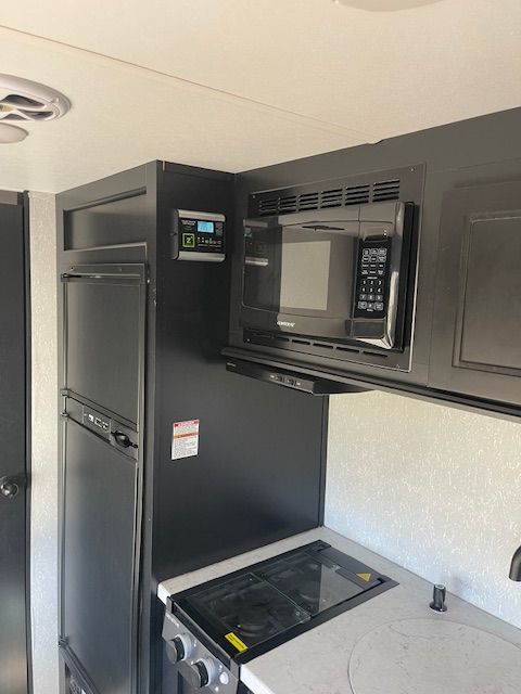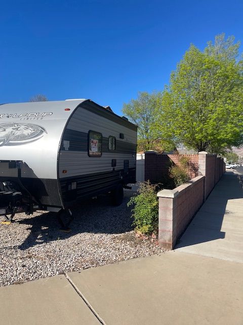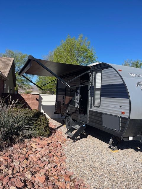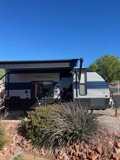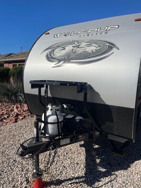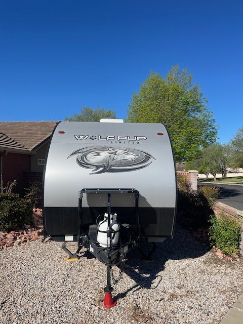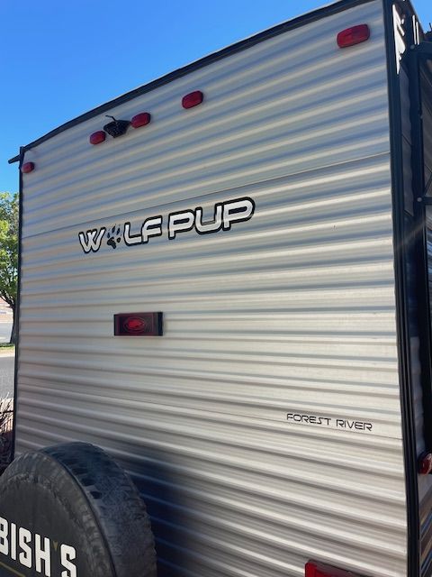 For Sale: 2021 Wolf Pup with a ton of extras. Comes with a front mounted Firman dual fuel generator with a new battery in it, electric start and runs off trailer propane or gasonline. All cables hoses and connectors. Has 2 new Costco batteries, 1000 watt, roof mounted Solar charger. Comes with equilizer hitch, rugs, broom, coffe pot, dishes and utinsils. Power awning with blue LED lights, queen size matress pad because the matress sucks by itself. Has AC, self contained, microwave, back up camera, will come with an Evelle trailer cover that was over $400 by itself, a Blackstone protable 24 inch grille, Coleman table with cover. Generator is nearly new, has 17 hours on it. Trailer is in perfect working order. As you can see in the photos, the wallpaper is shrinking in spots and lost its adhesive. There is wood panelling under it. It could be removed or replaced. This is a known problem and warranty will not cover after 1 year. There are many creative solutions on the internet. Come and get it. Everything but my camp chairs, I'm keeping them.