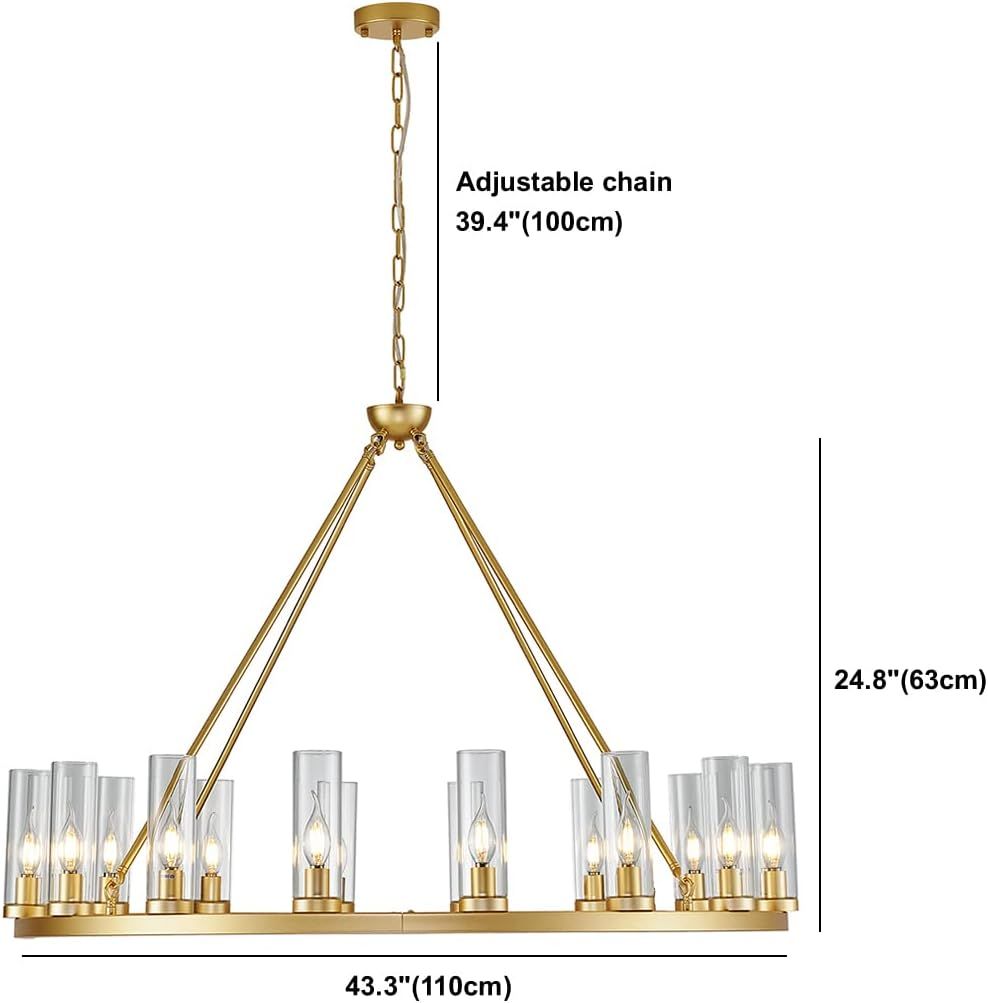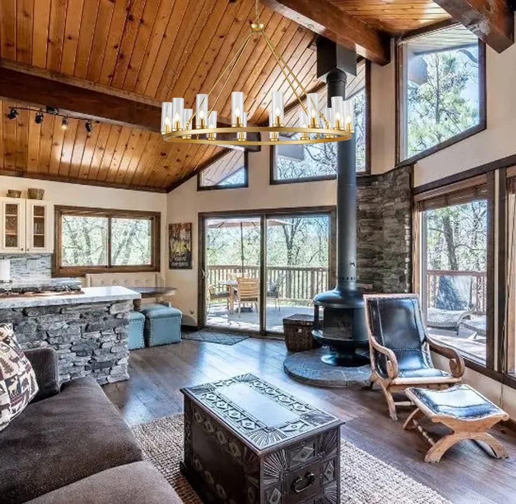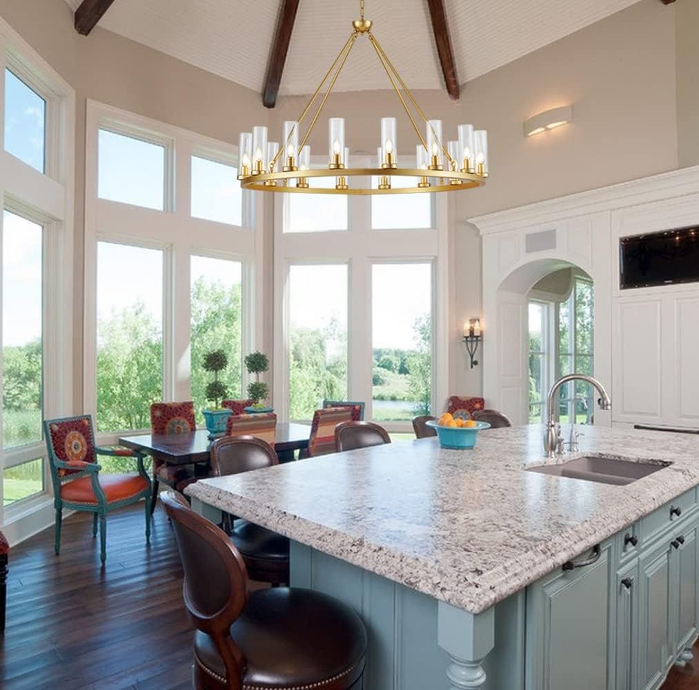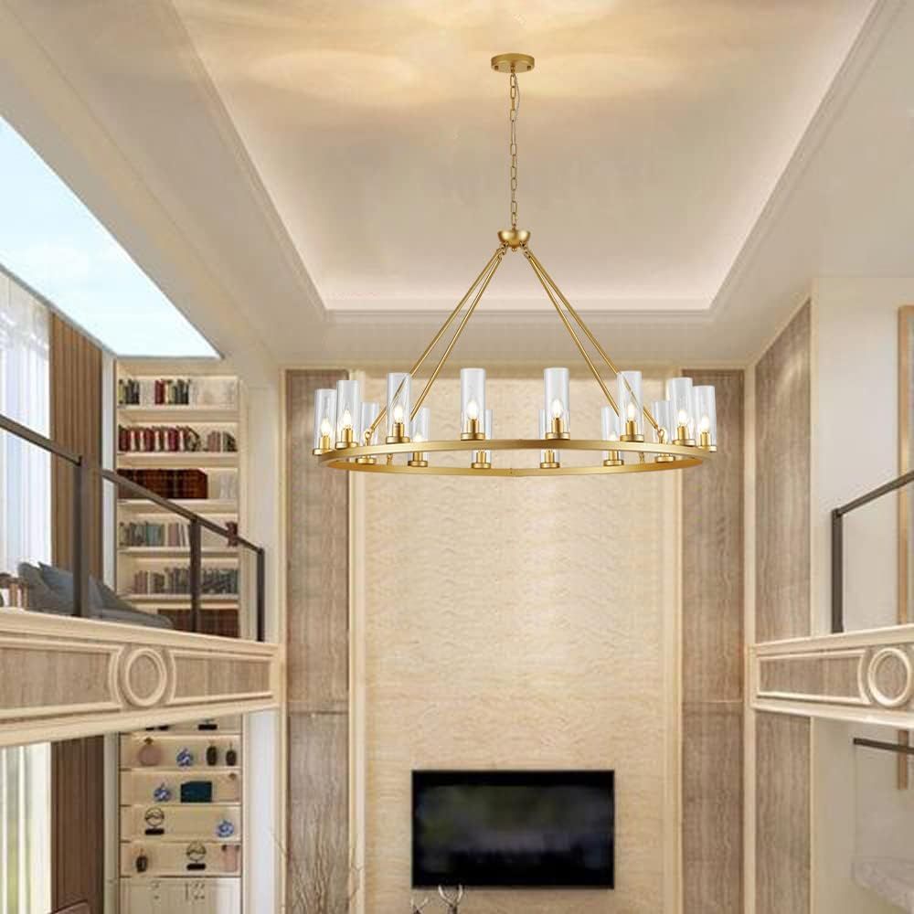ApplePayFarmhouse Wagon Wheel Chandelier,D42 16 Light Gold Industrial Rustic Chandelier Lighting, Round Kitchen Island Pendant Light with Clear Glass(42in-16 Lights)