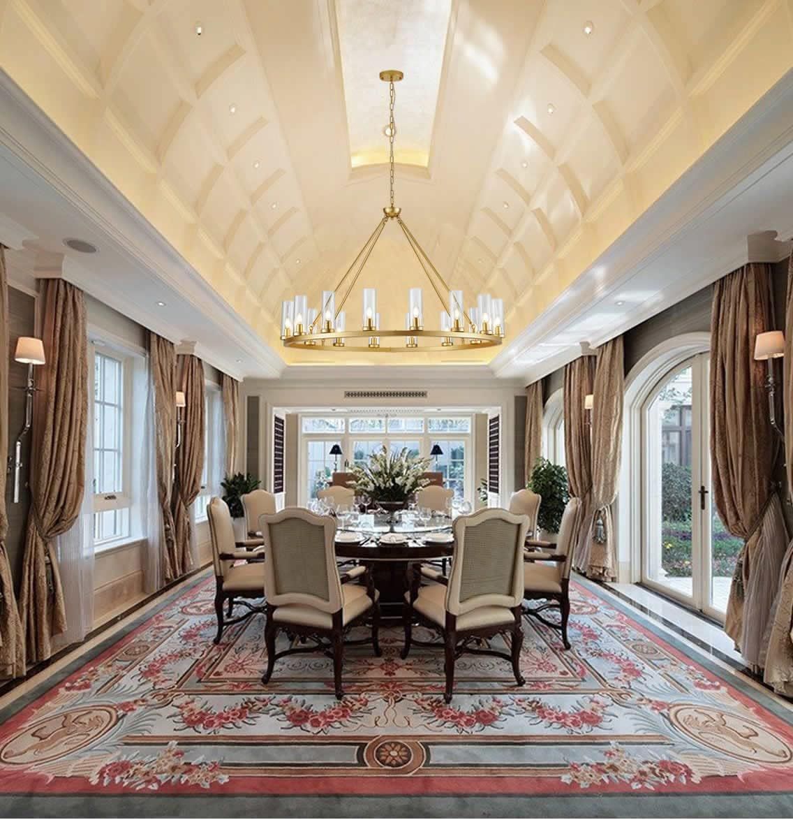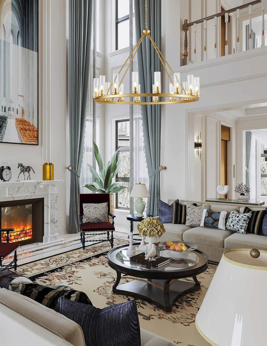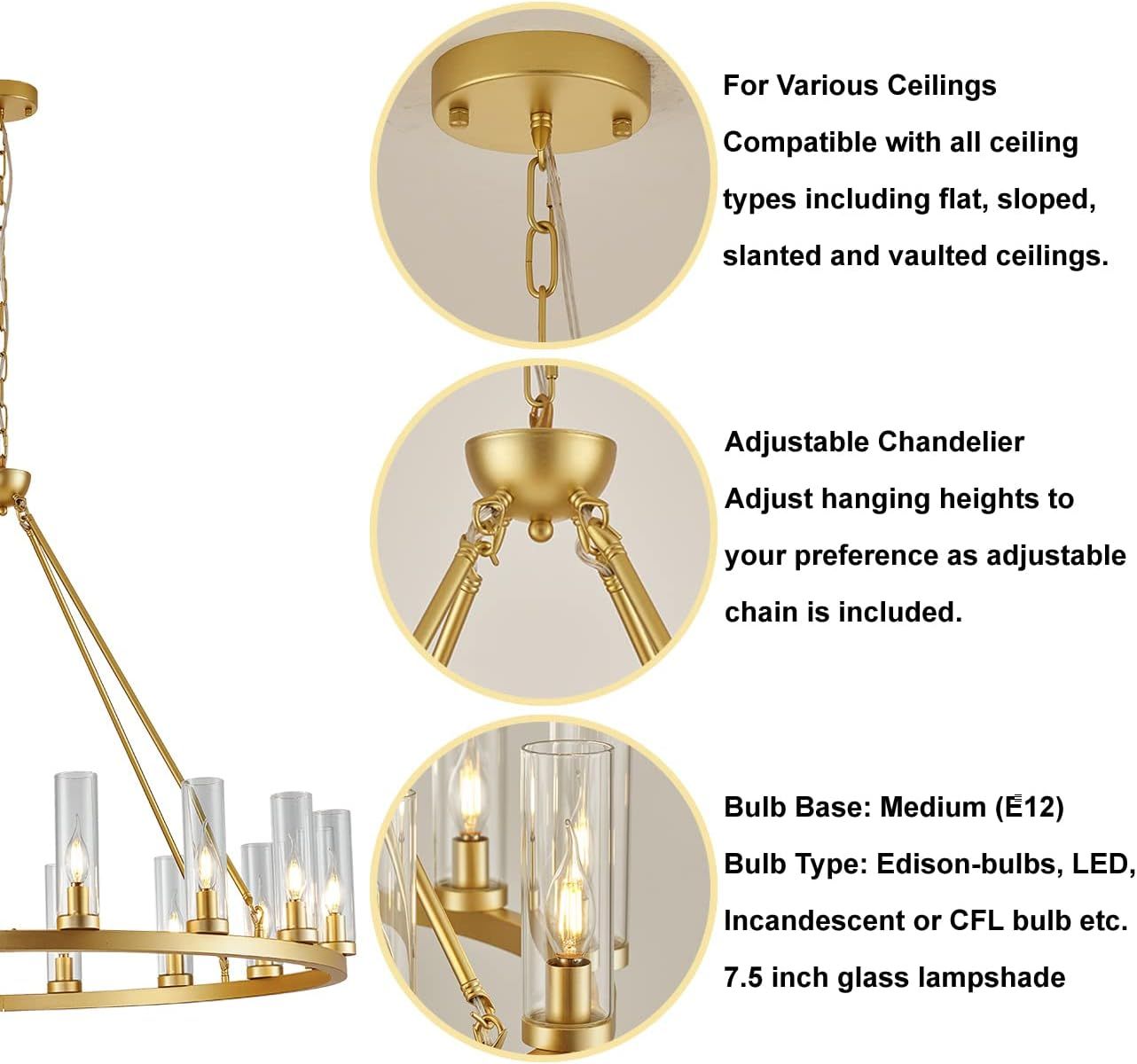 ApplePayFarmhouse Wagon Wheel Chandelier,D42 16 Light Gold Industrial Rustic Chandelier Lighting, Round Kitchen Island Pendant Light with Clear Glass(42in-16 Lights)