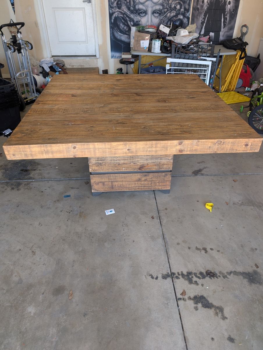 Beautiful distressed wood finish with natural grain and saw marks that give it a reclaimed wood look. The pedestal base makes it easy to fit chairs all around and gives it a great industrial / farmhouse style. 63"x63", sits 8.