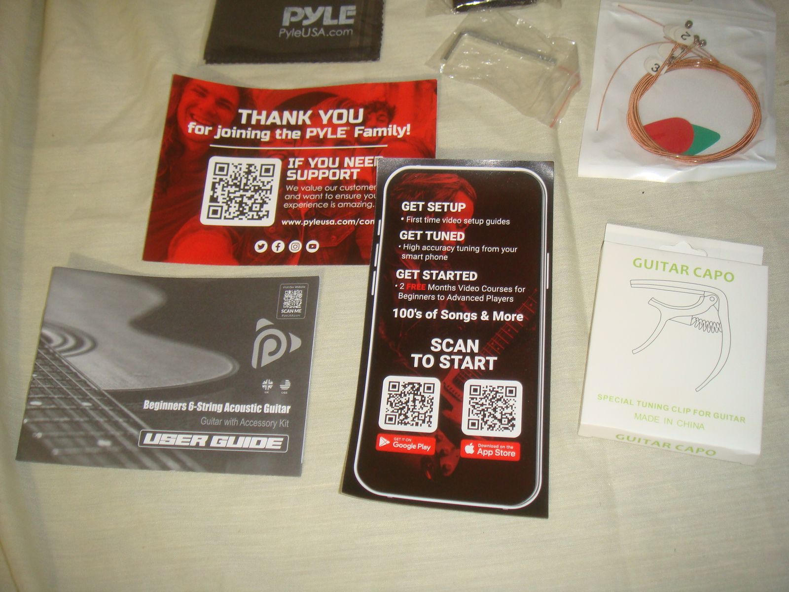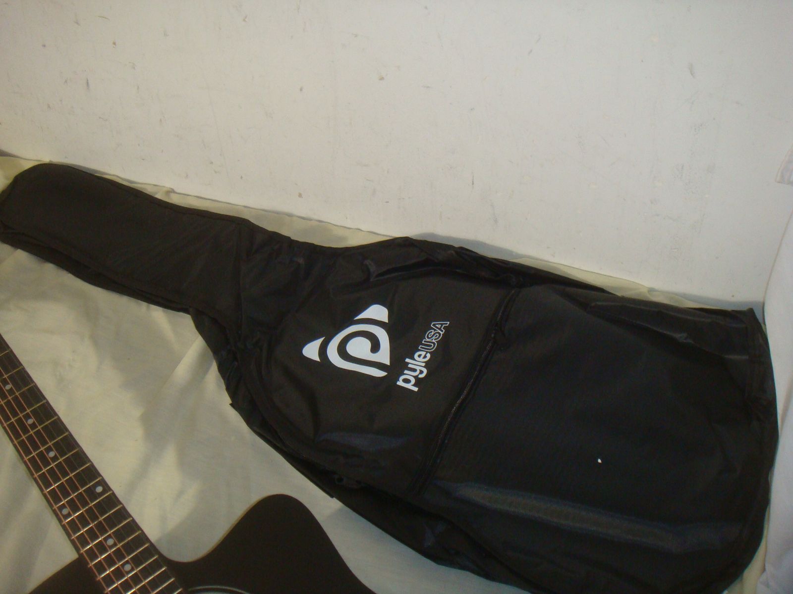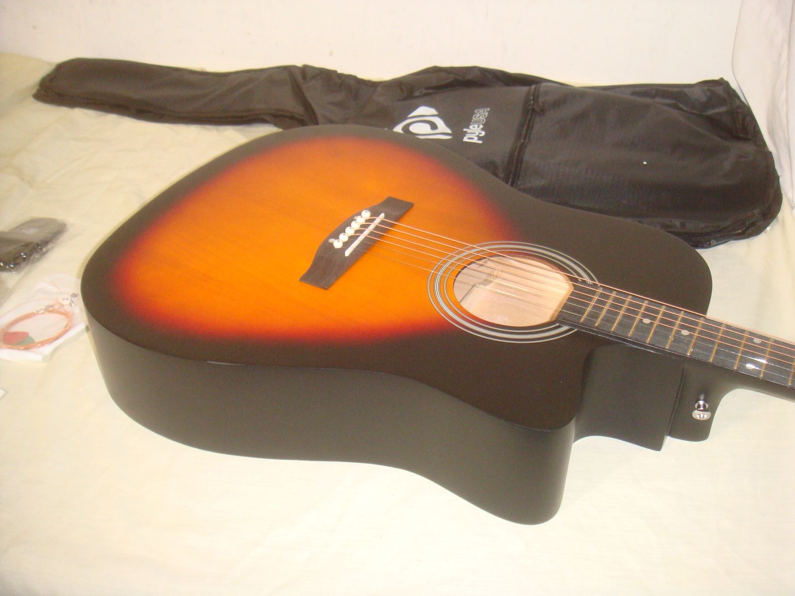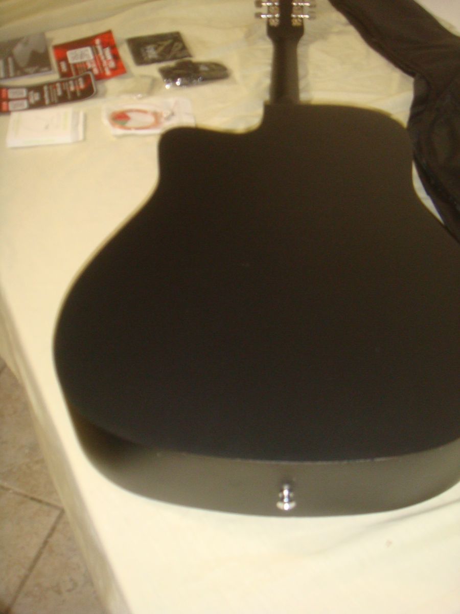 PYLE PGSTGR007SBD 41" FULL SIZE ACOUSTIC CUTAWAY GUITAR KIT. This is a brand new, open box guitar kit who's original box was distressed in original shipping. The guitar has a couple of super minor corner dings/surface marks, but is otherwise in excellent/new condition! It comes as shown in the photos with a capo, picks, extra strings, strap, and gig bag. This is a beautiful guitar for the money! It comes with everything shown. This is your chance to save big-time so don't miss out!!