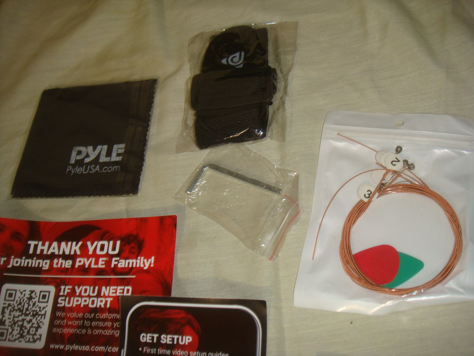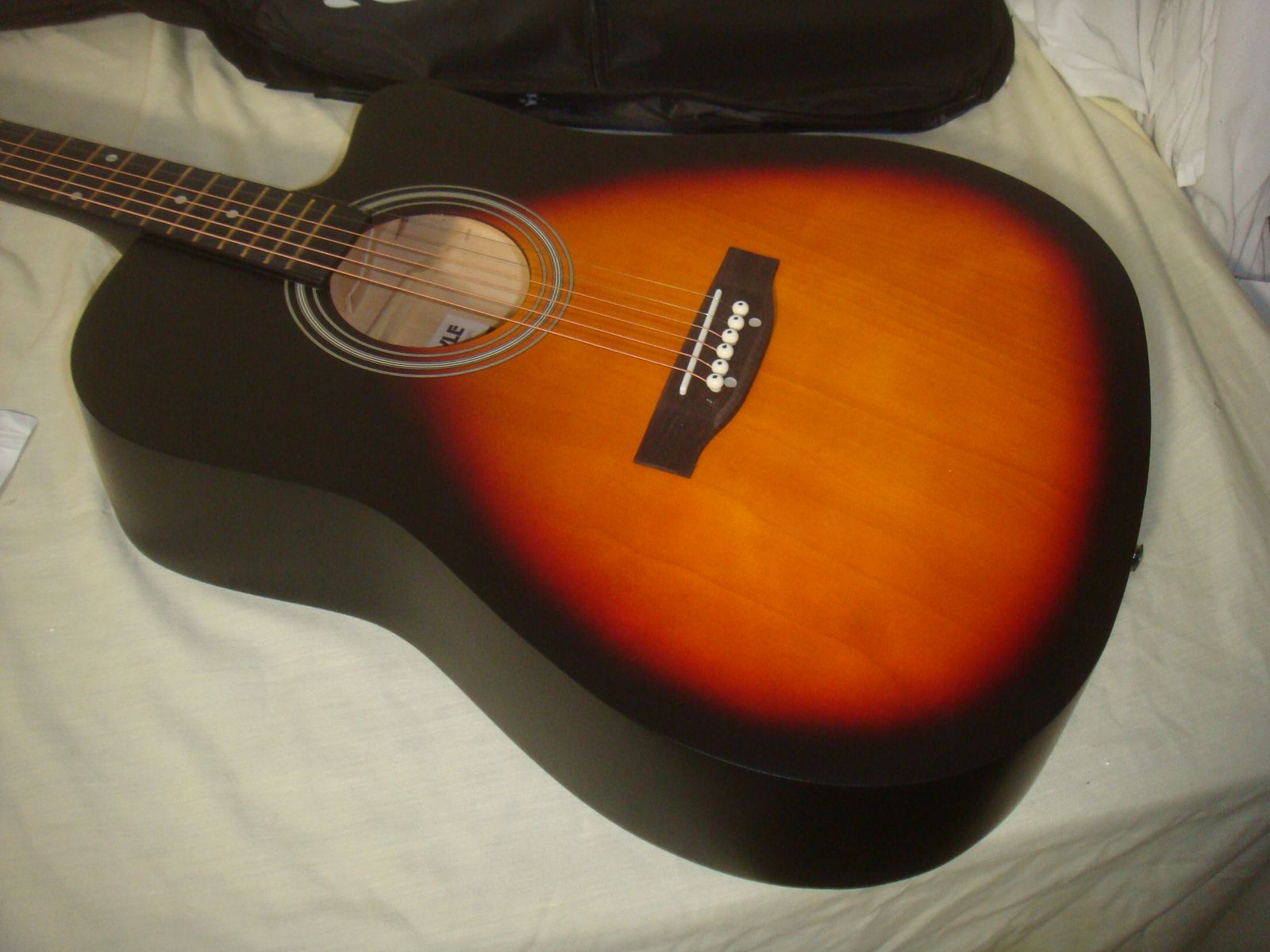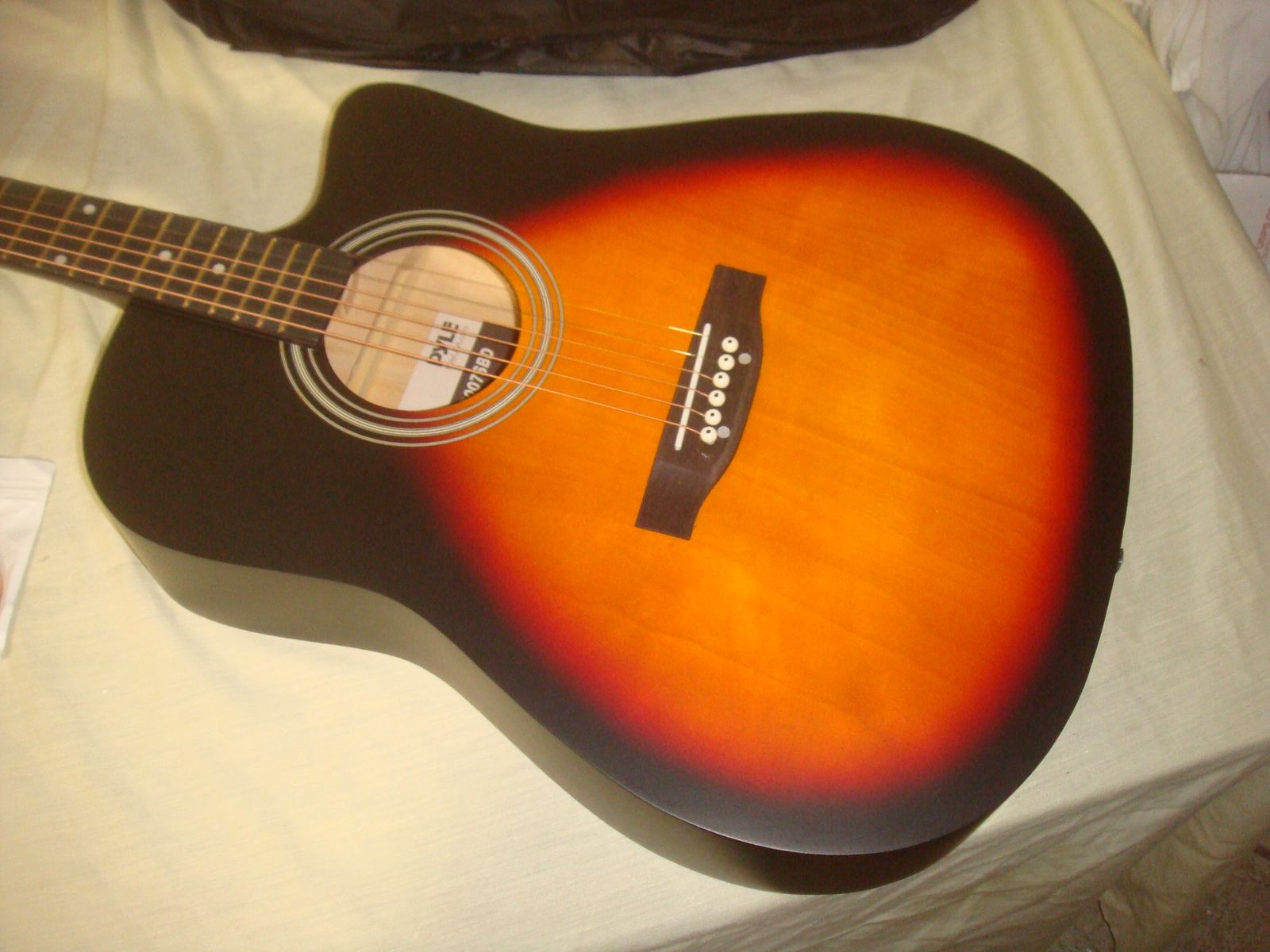 PYLE PGSTGR007SBD 41" FULL SIZE ACOUSTIC CUTAWAY GUITAR KIT. This is a brand new, open box guitar kit who's original box was distressed in original shipping. The guitar has a couple of super minor corner dings/surface marks, but is otherwise in excellent/new condition! It comes as shown in the photos with a capo, picks, extra strings, strap, and gig bag. This is a beautiful guitar for the money! It comes with everything shown. This is your chance to save big-time so don't miss out!!