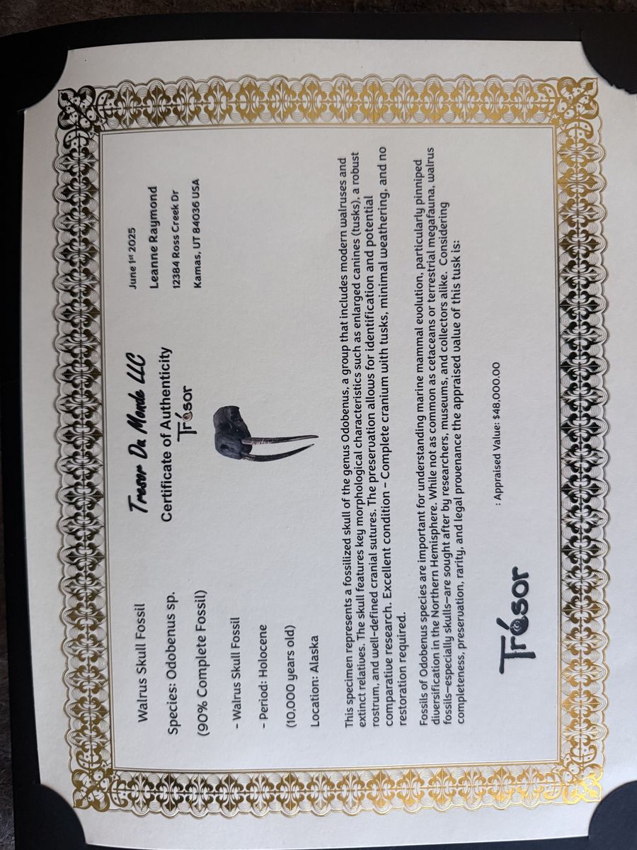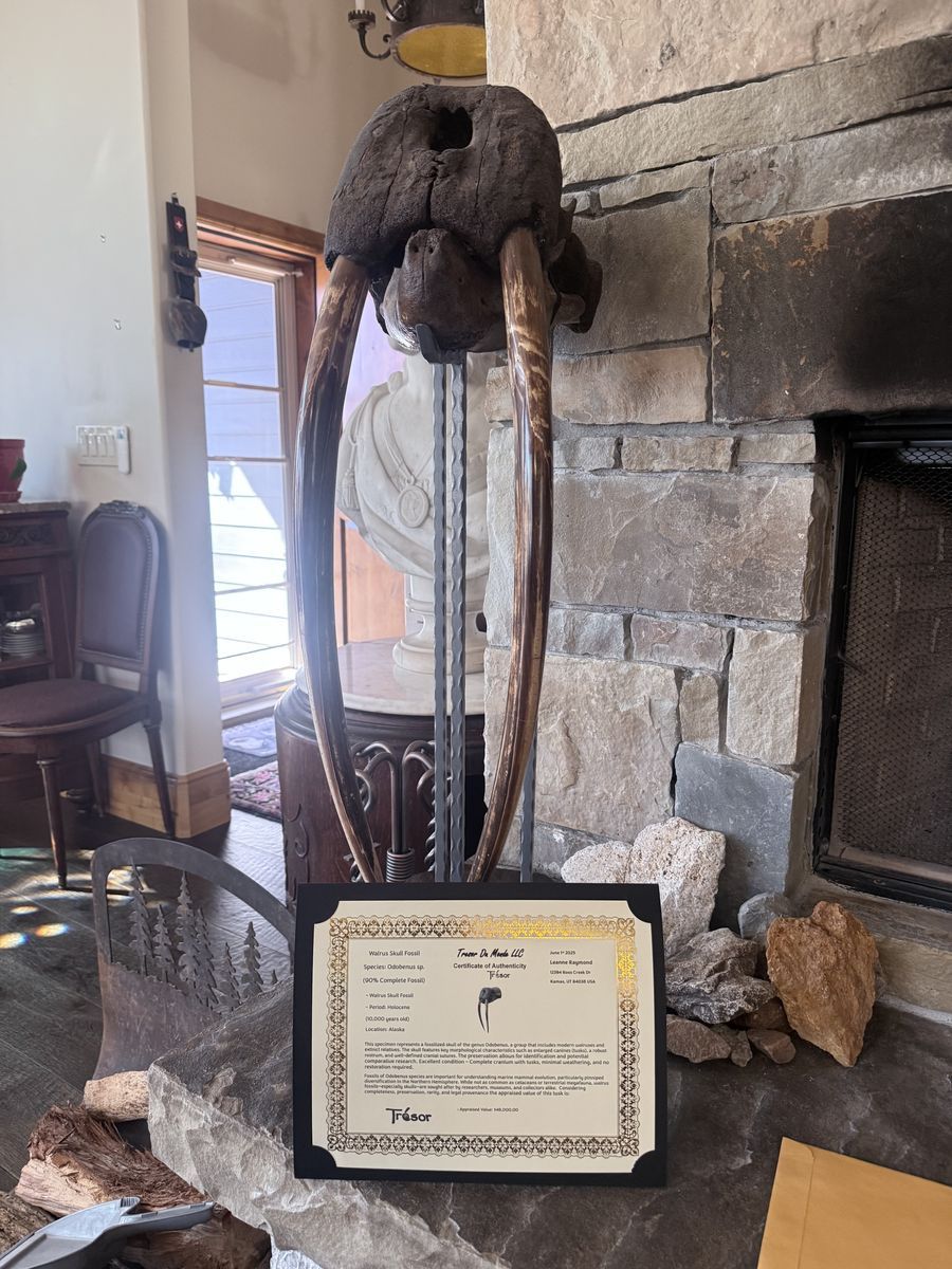 This specimen represents a fossilized skull of the genus Odobenus, a group that includes modern walruses and extinct relatives. The skull features key morphological characteristics such as enlarged canines (tusks), a robust rostrum, and well-defined cranial sutures. The preservation allows for identification and potential comparative research.