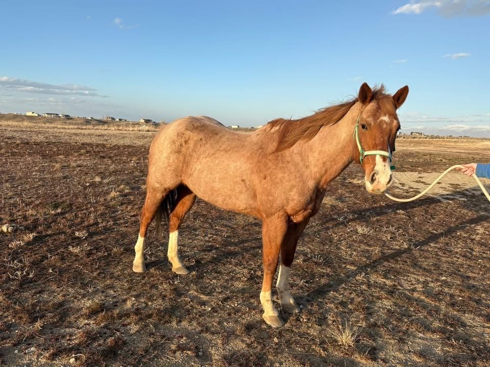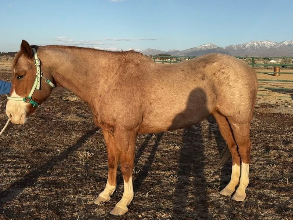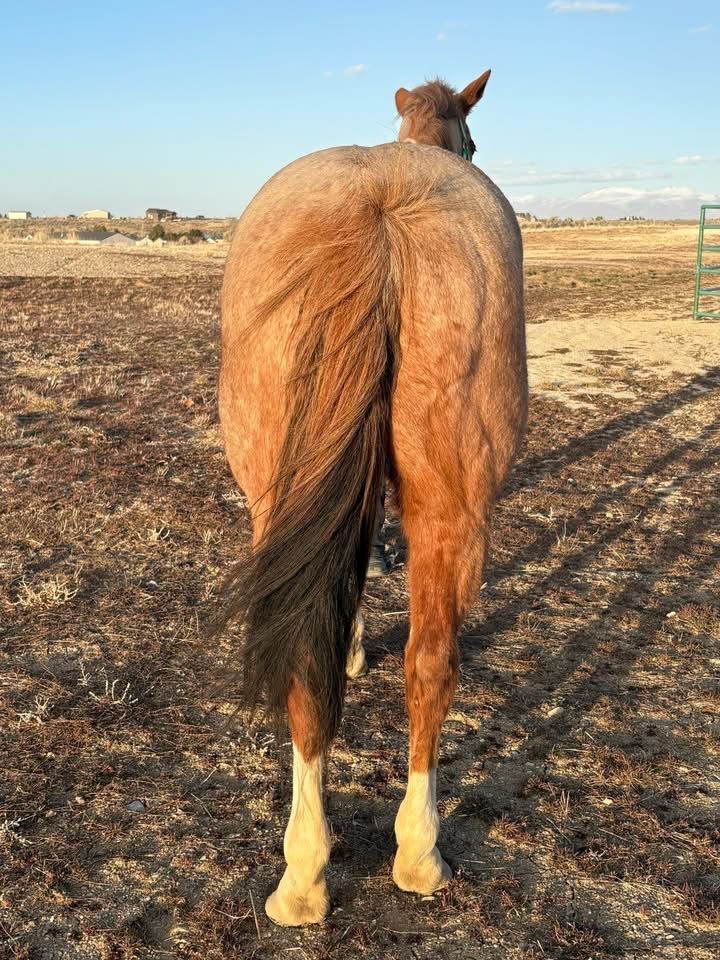 •Rose 20 year old grade red roan quarter horse mare.3500.00