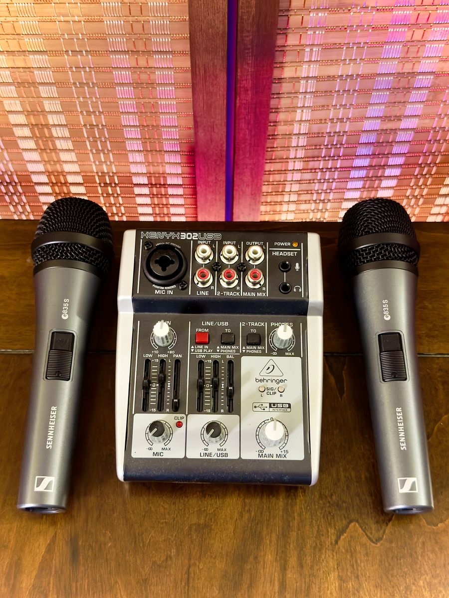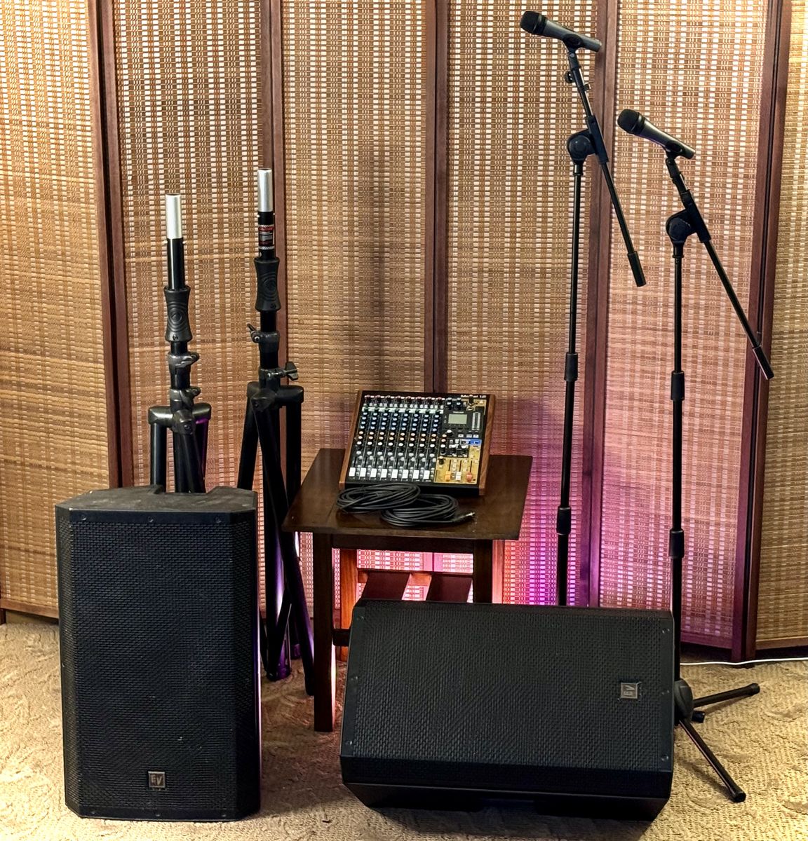 2 speakers, 2 microphones, mixer, and stands. Great for parties, music, and larger groups. All necessary cables included. Just plug in your phone, laptop, or instrument and you're ready to go.