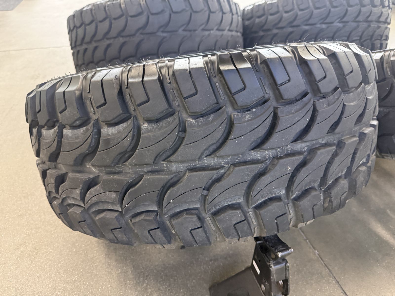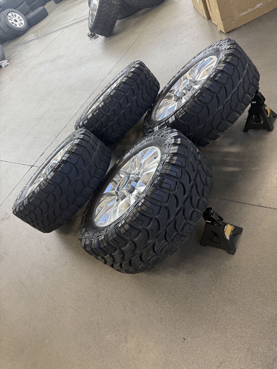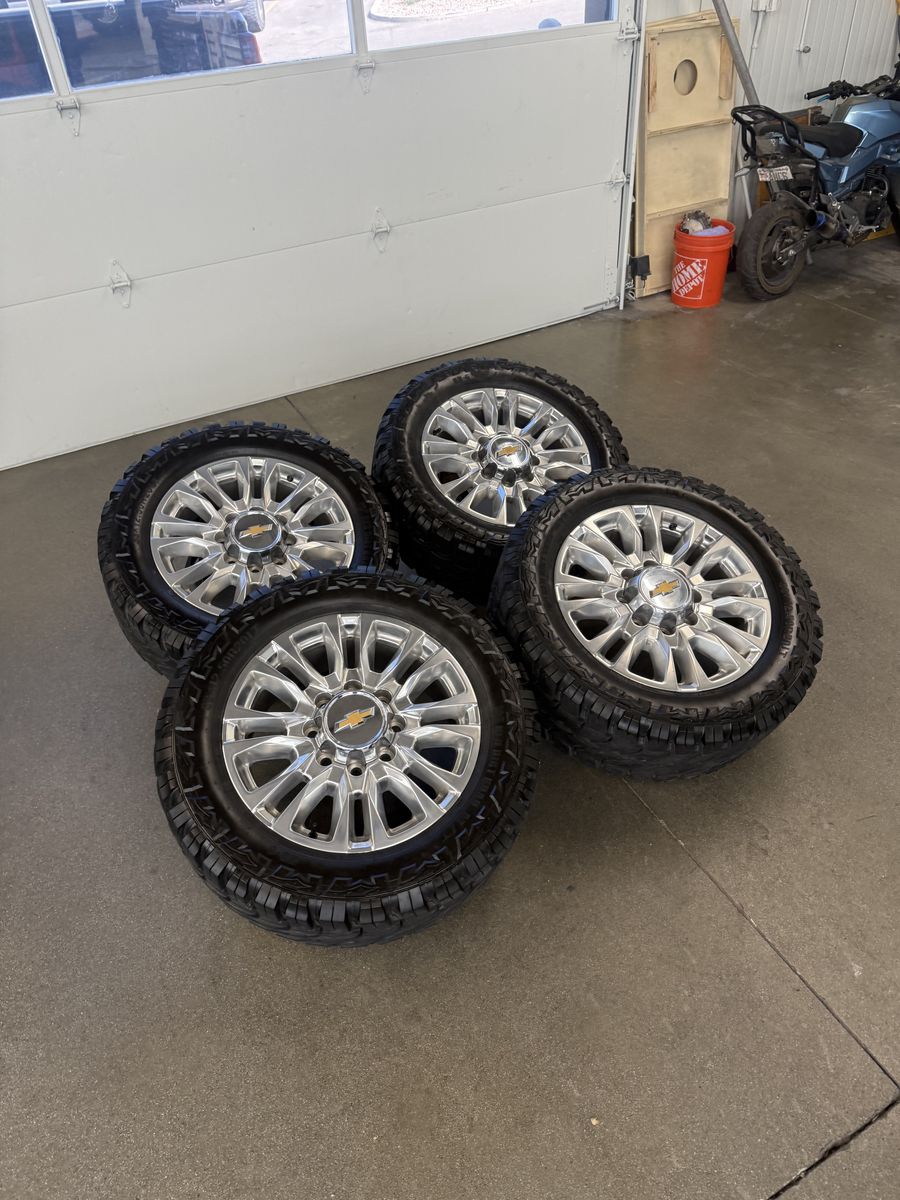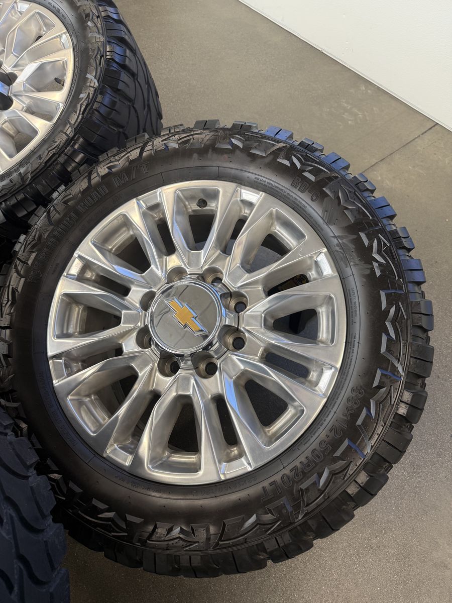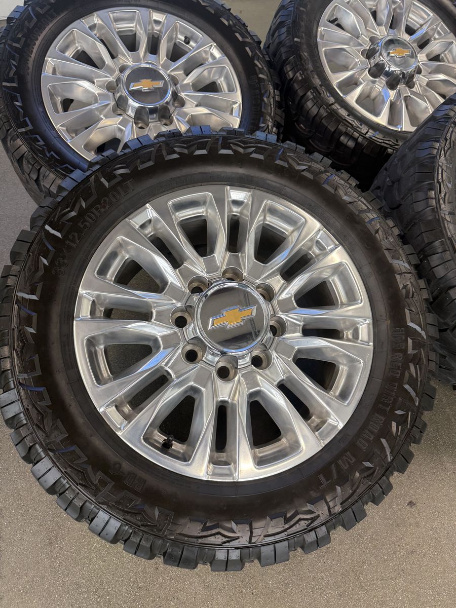 Wheels are 20in OEM wheels off a 2022 Chevy 3500 high country package. Wheels are in absolutely amazing shape, no curb rash dings or damage on them, wheels are in great shape for being a couple years old. Tires are 33x12.50r20 red dirt m/t load range E, 10ply, great performing tires, 2 tires have 90% tread, 2 have about 50%.