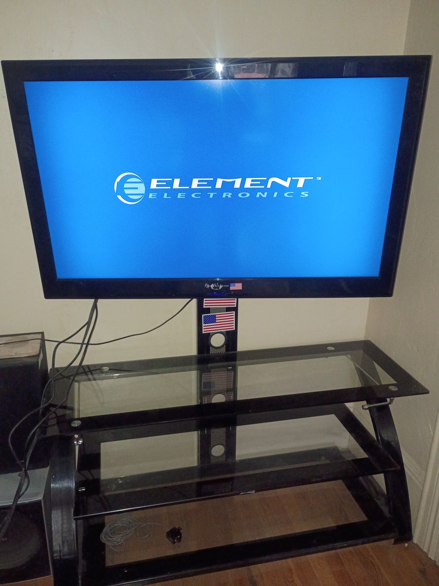 ZelleElement tv 46 inches with remote control in good condition with a pretty nice glass table table stand $50 for both.