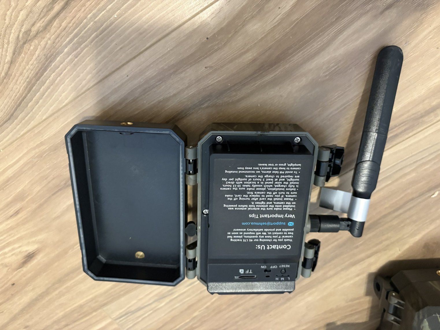 Zellepretty much new game camera. Two of them. I lost the solar recharger panels, but the battery lasts a long time and its USB C chargeable. Get notifications of photos of your game via cell service (its a monthly subscription).