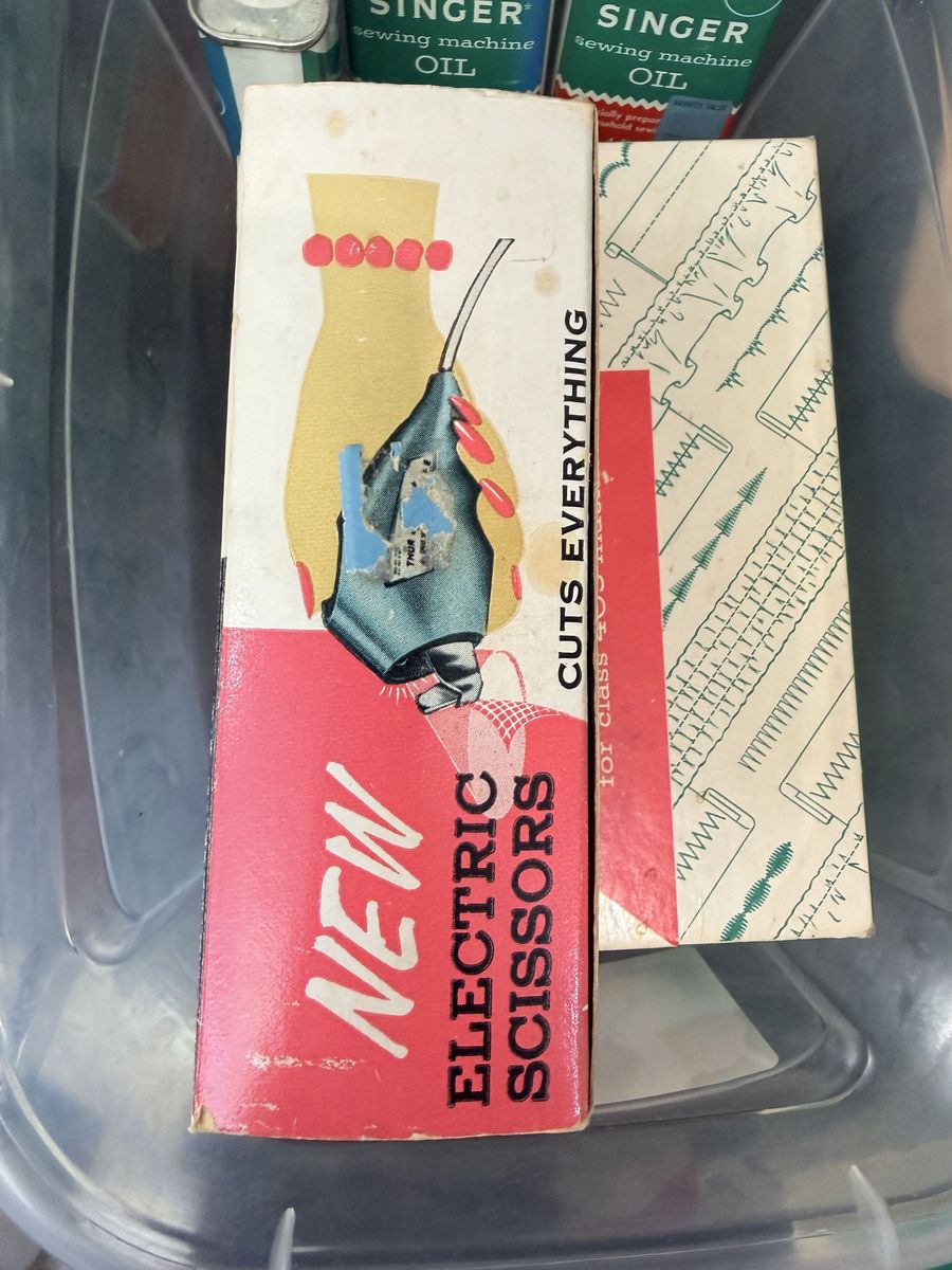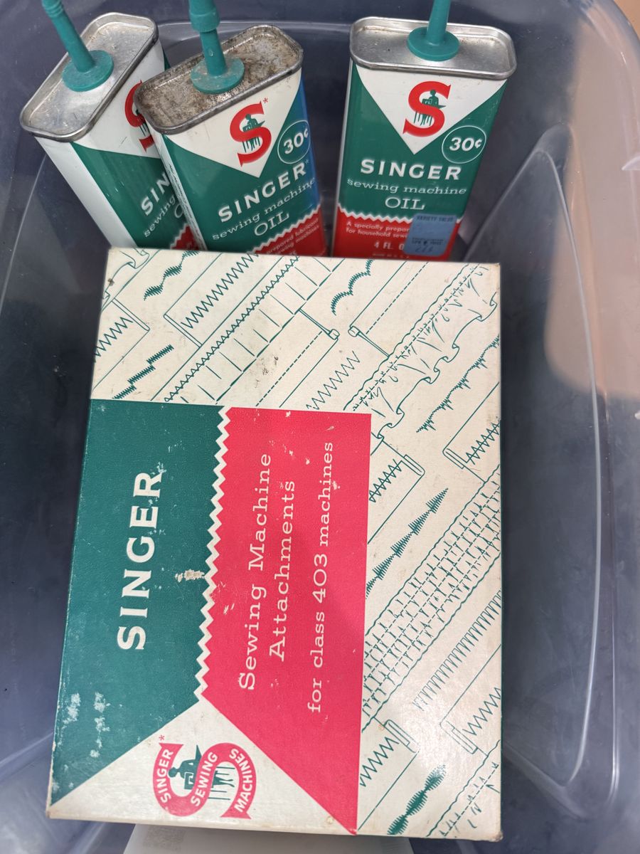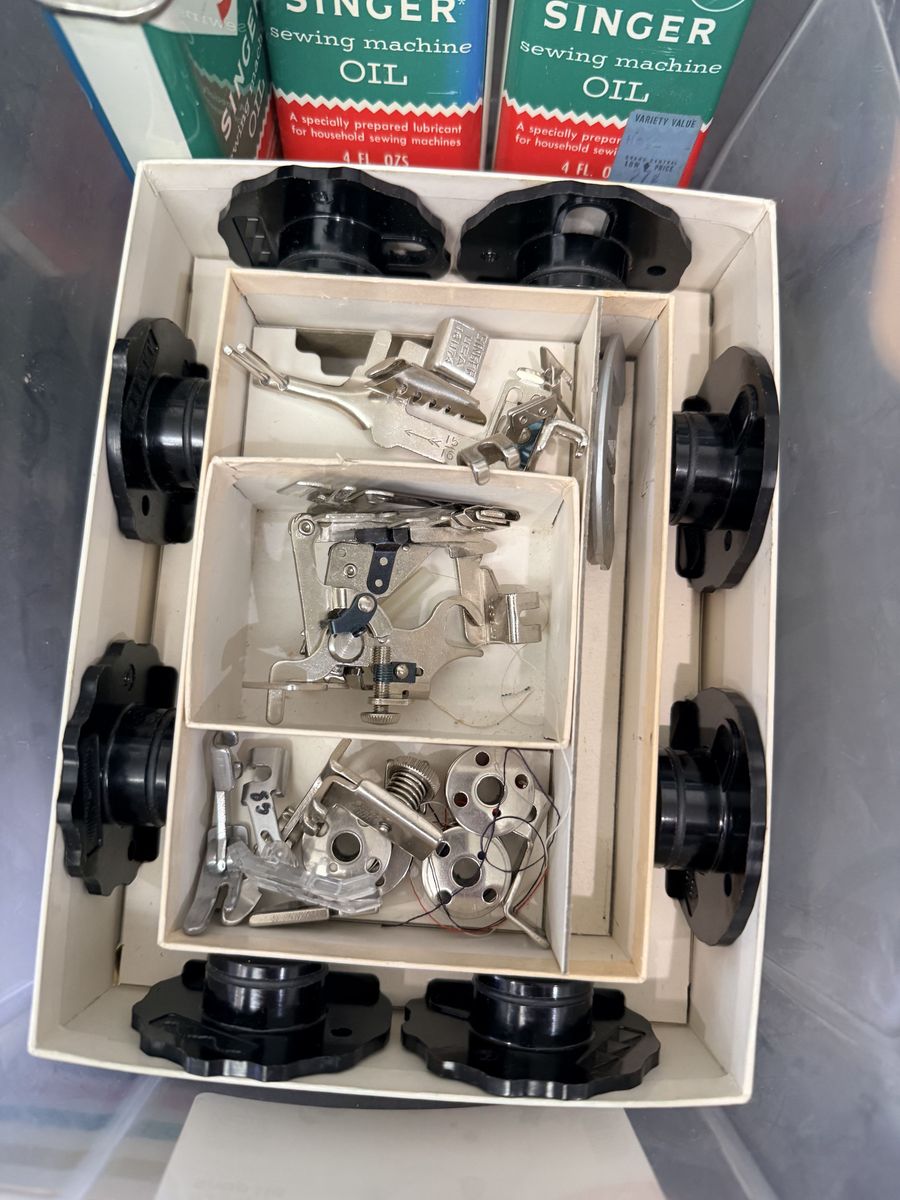 Comes with everything shown in the pictures, including extra accessories and sewing supplies. Would be great for someone who knows how to fix machines, or for parts, or even just to clean up and use if it works!