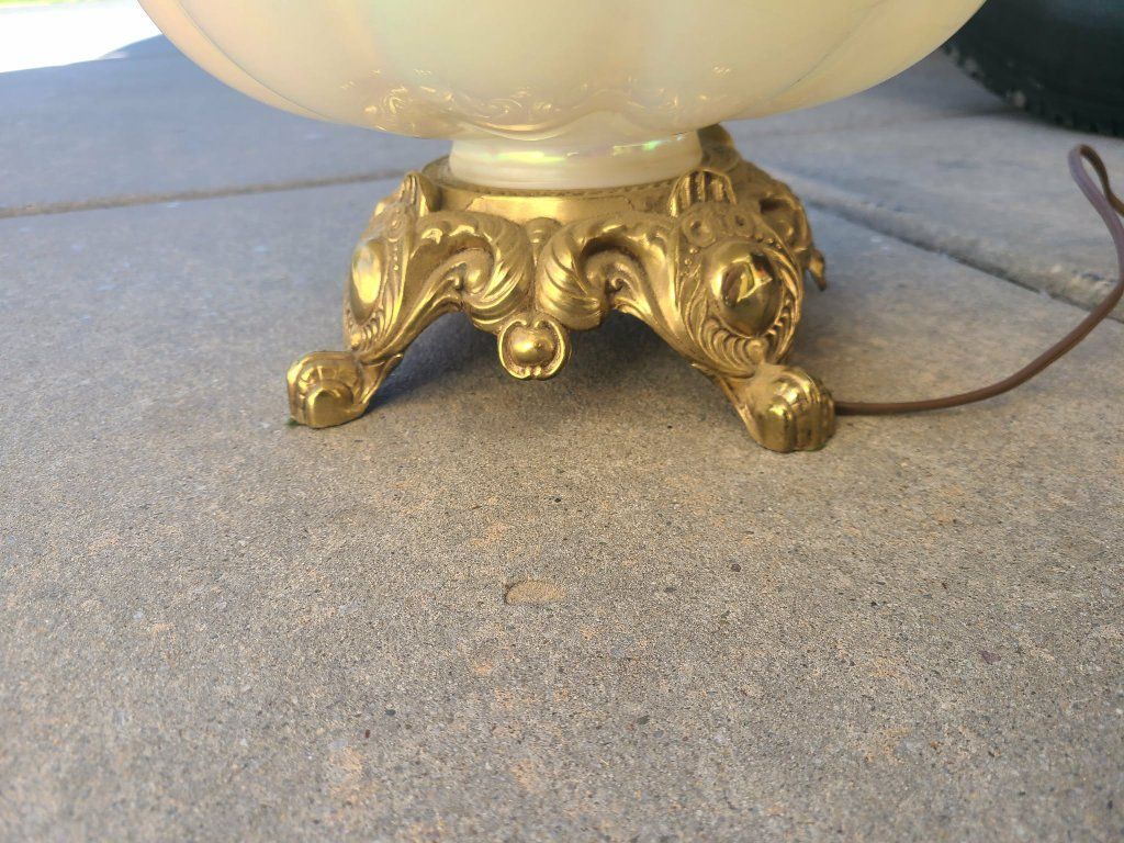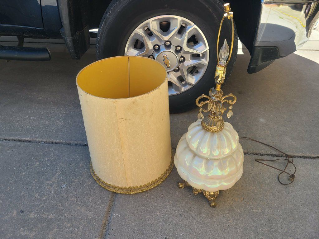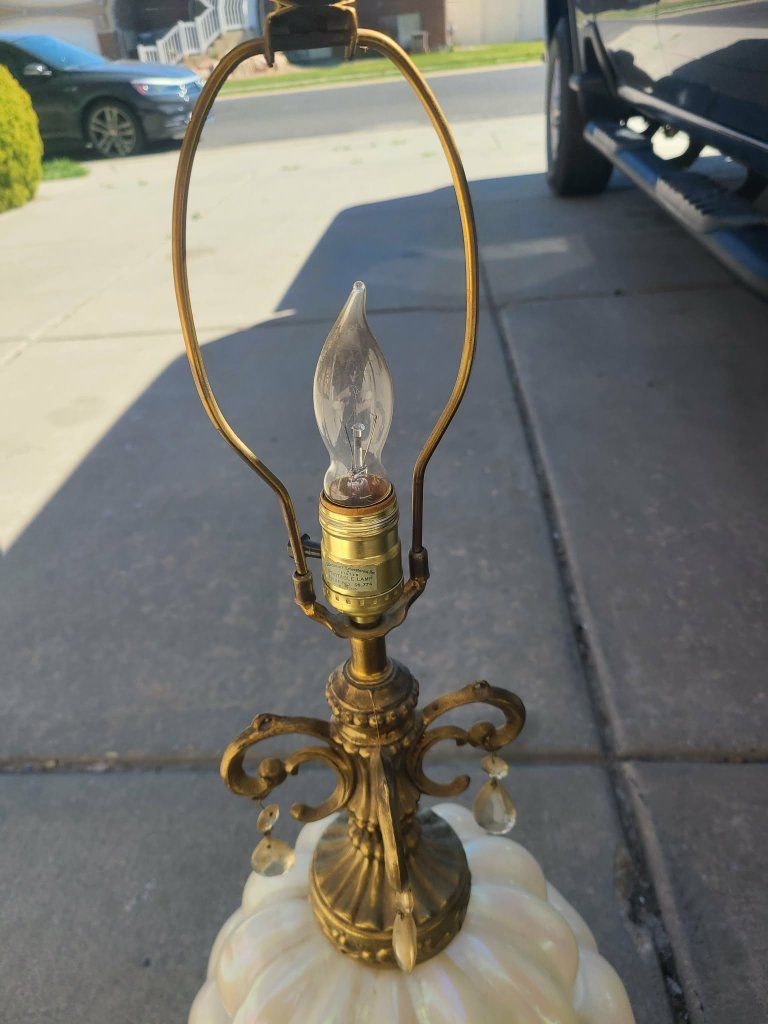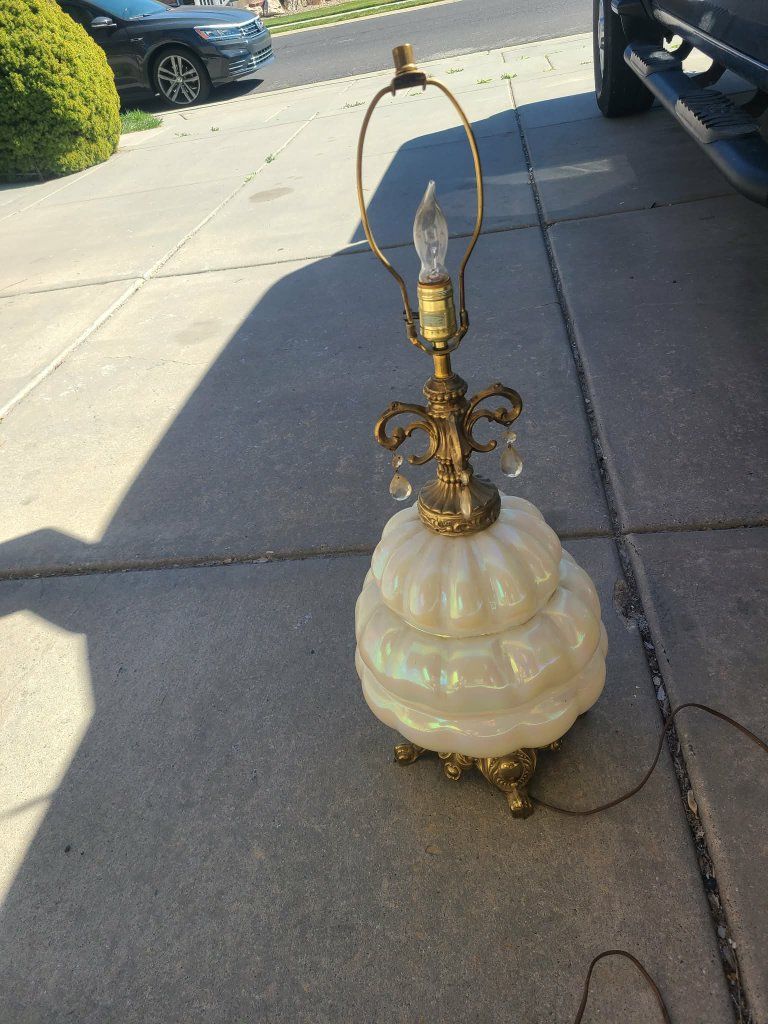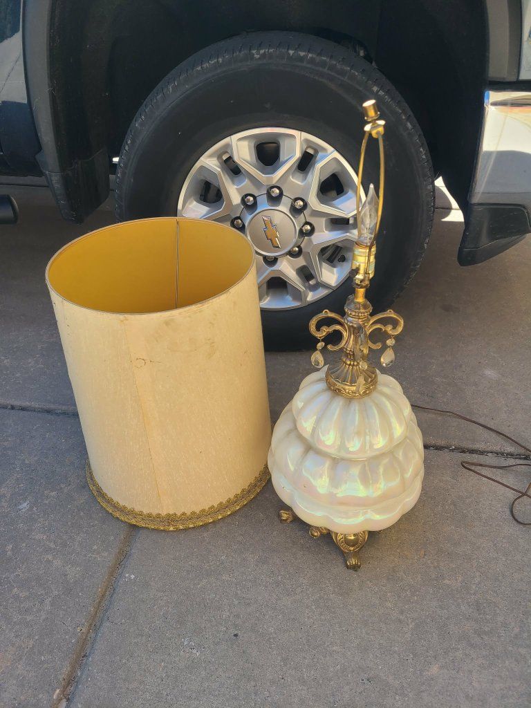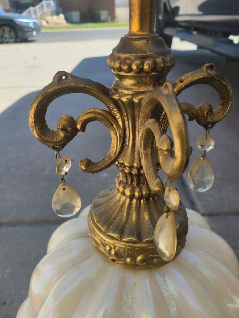 Opalescent Blown Glass Lamp with Teardrop Crystals, Vintage Hollywood Regency, comes with original lamp shade