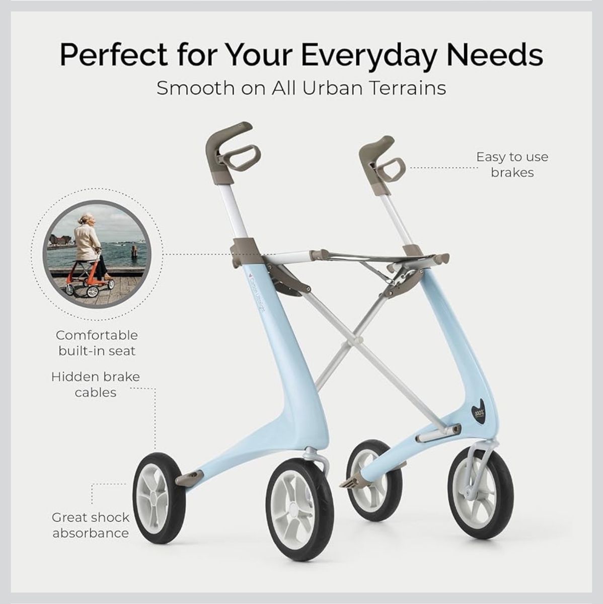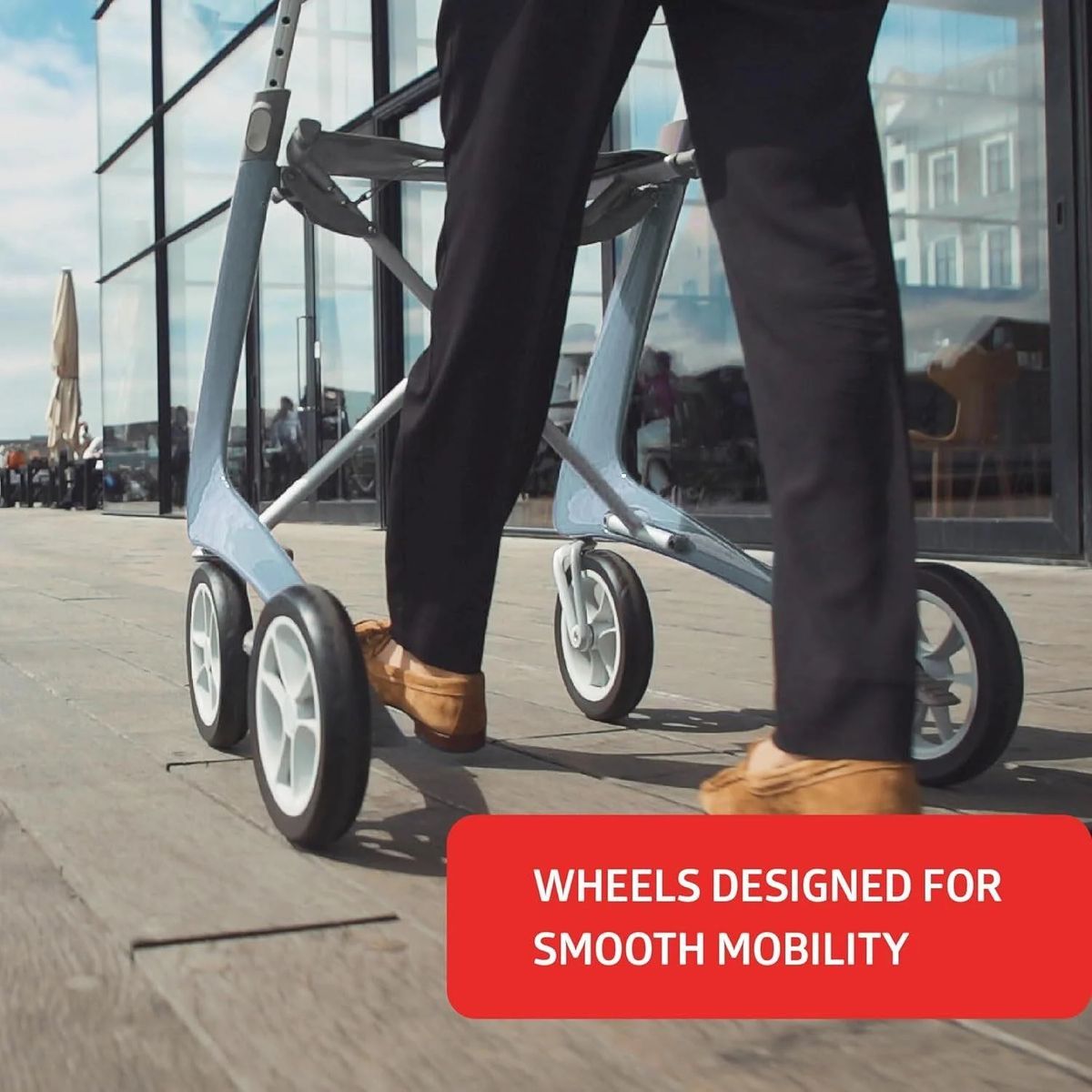 World’s lightest rollator (only 10.6 lbs) Carbon fiber frame – super strong & durable Built-in seat for resting anytime Foldable design – easy to transport/store Puncture-proof wheels for smooth rides Adjustable height (31.1” – 35.8”) Comfort handles + easy-to-use brakes Modern, stylish design (not bulky like traditional walkers)